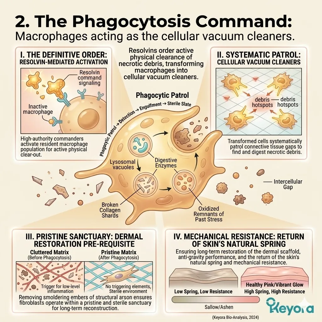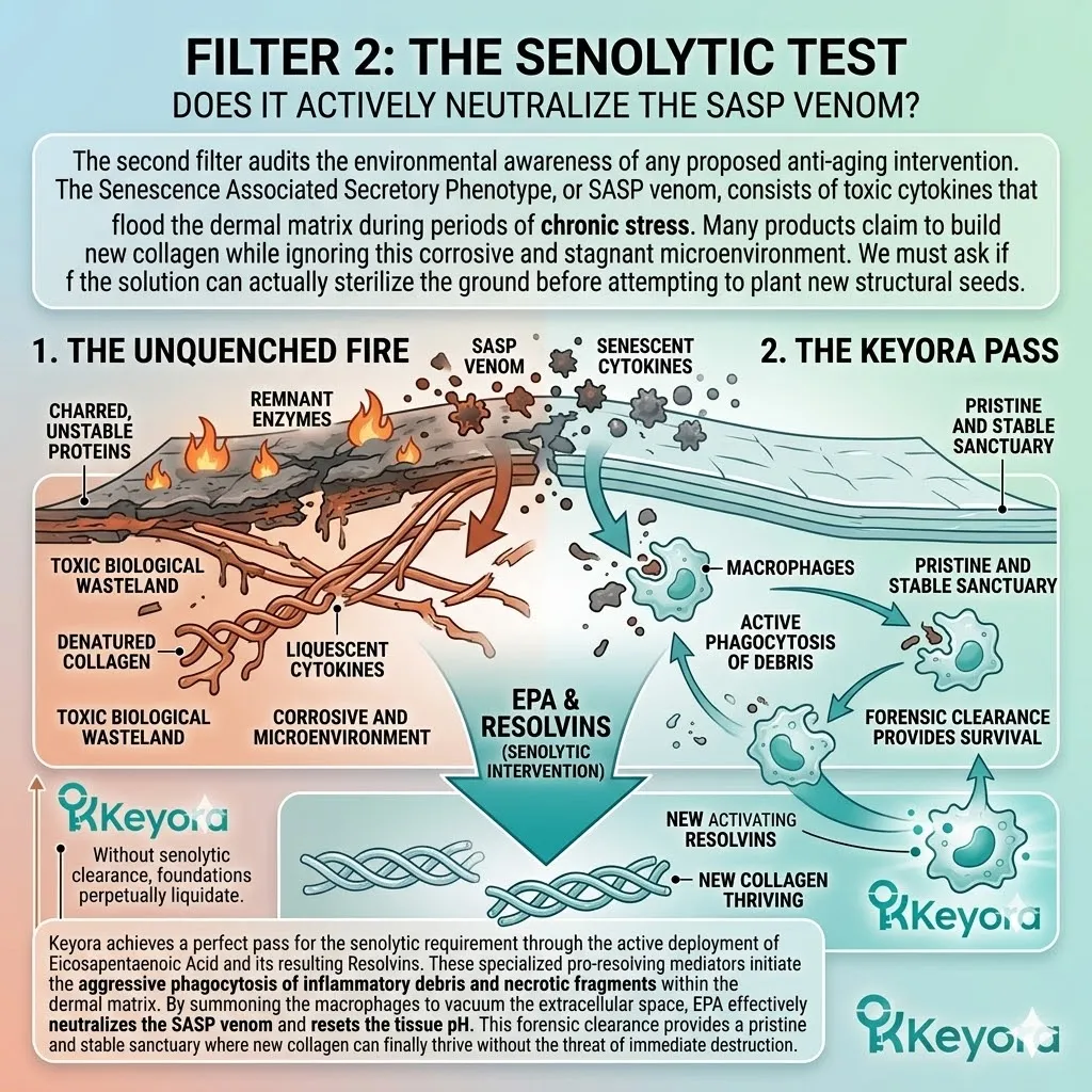 * **Filter 2 (The Senolytic Test):** Declares that building new collagen in a dermis flooded with **SASP Venom** (senescent cytokines) is biologically futile; the microenvironment must be sterilized via **Active Phagocytosis** first.