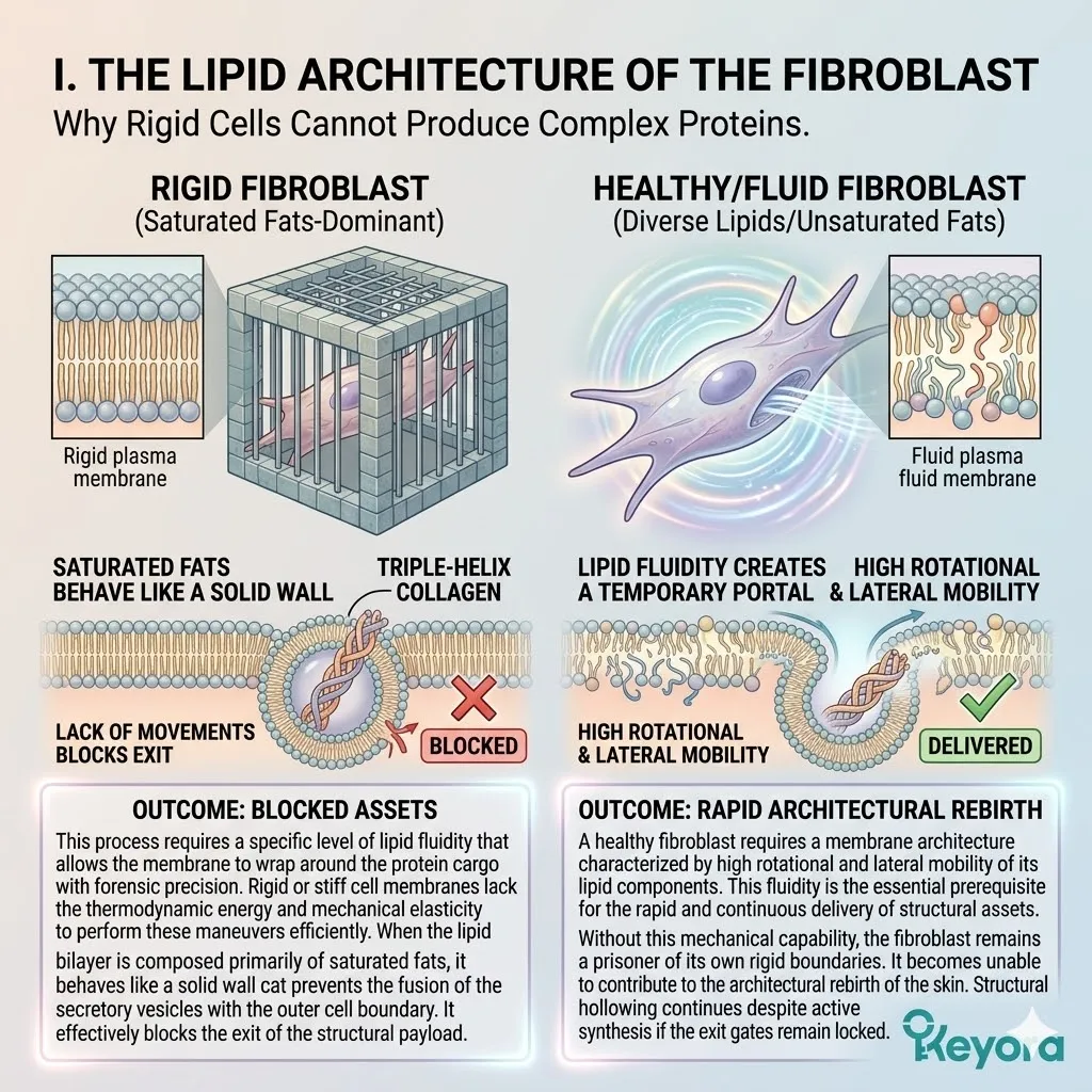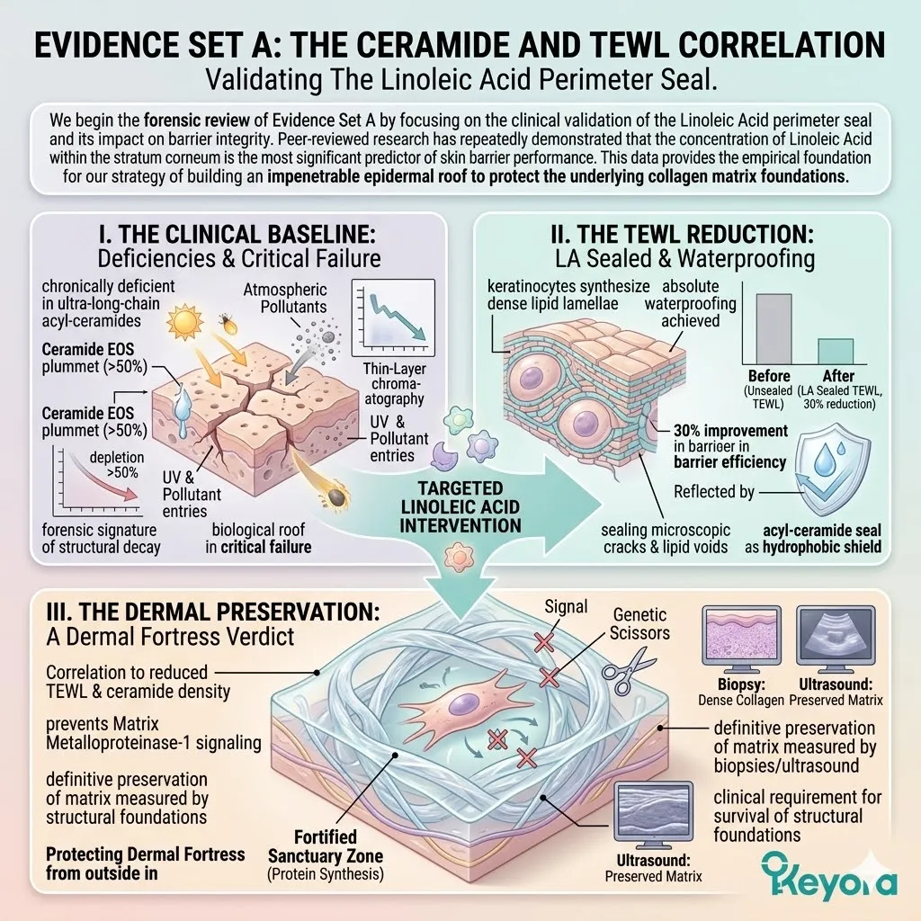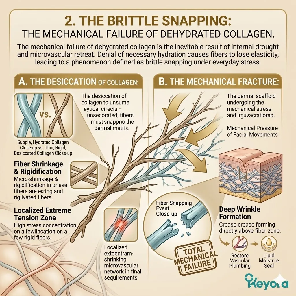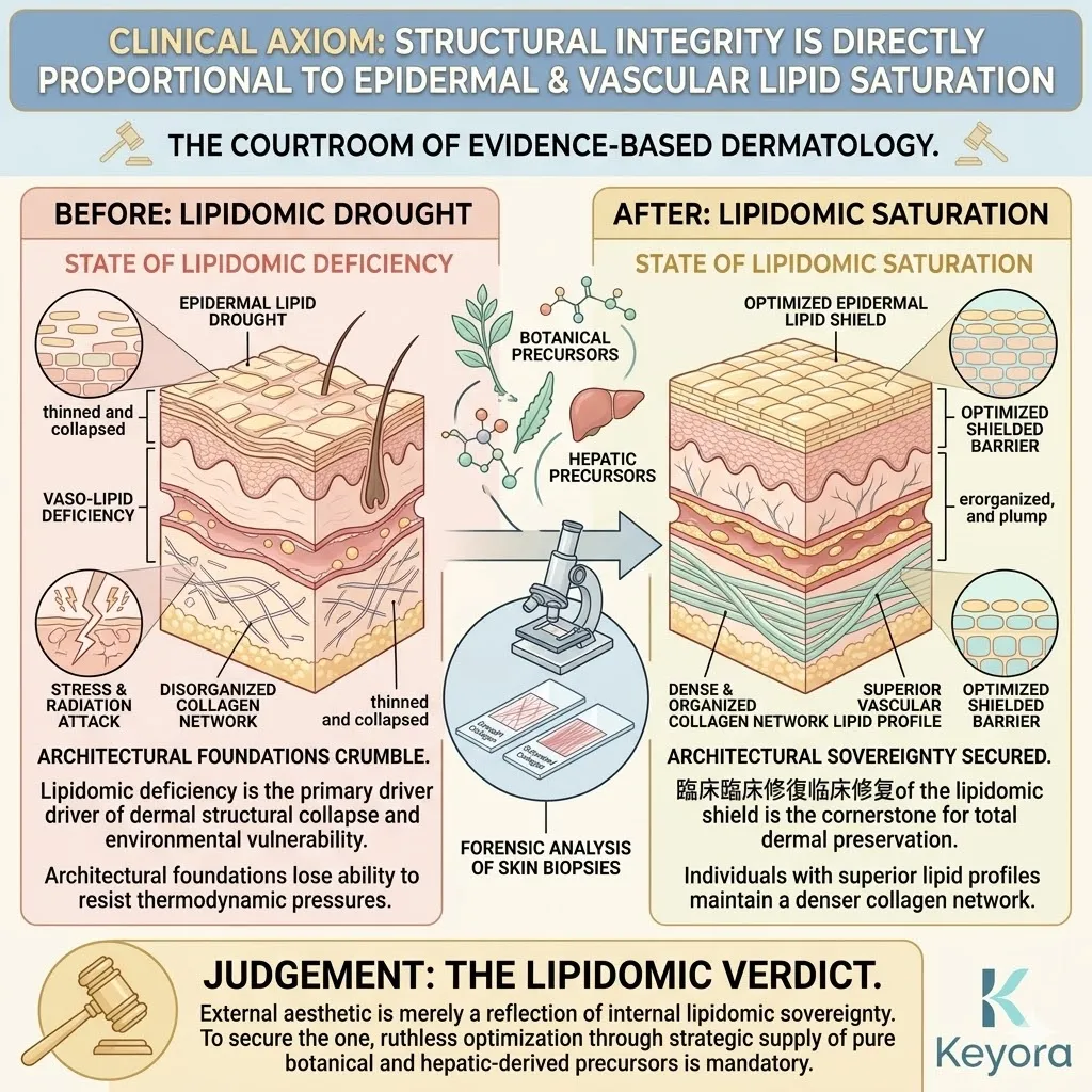 Without the proper biological mortar, your stratum corneum leaks water constantly in a process known as Trans-Epidermal Water Loss. This evaporation crisis creates a state of chronic thirst in the deeper layers, causing your collagen fibers to shrink and become brittle.