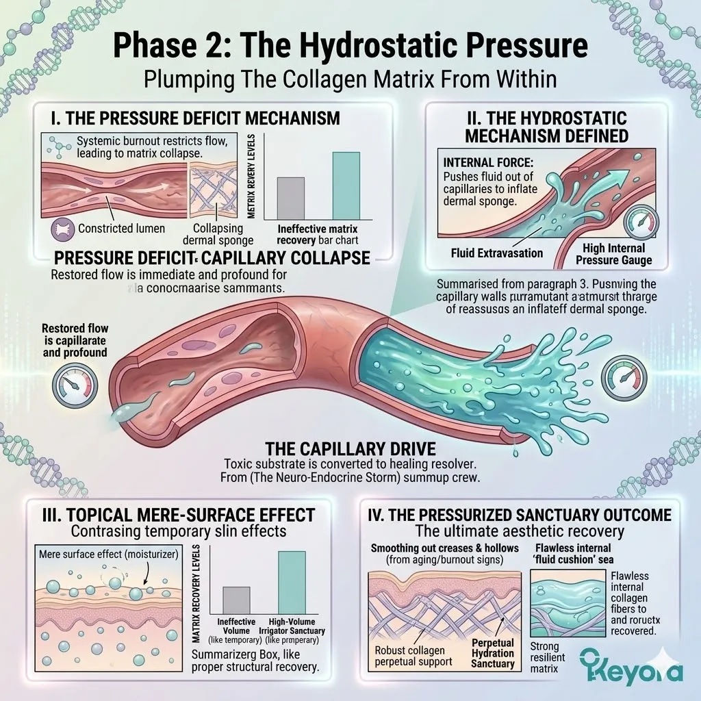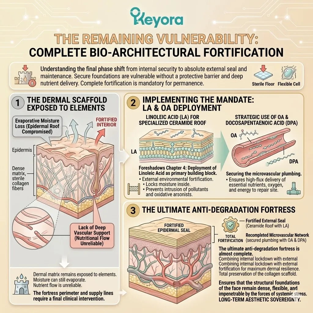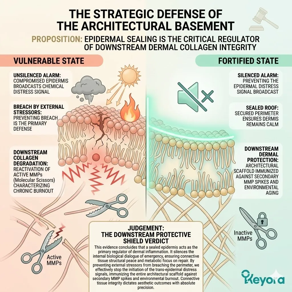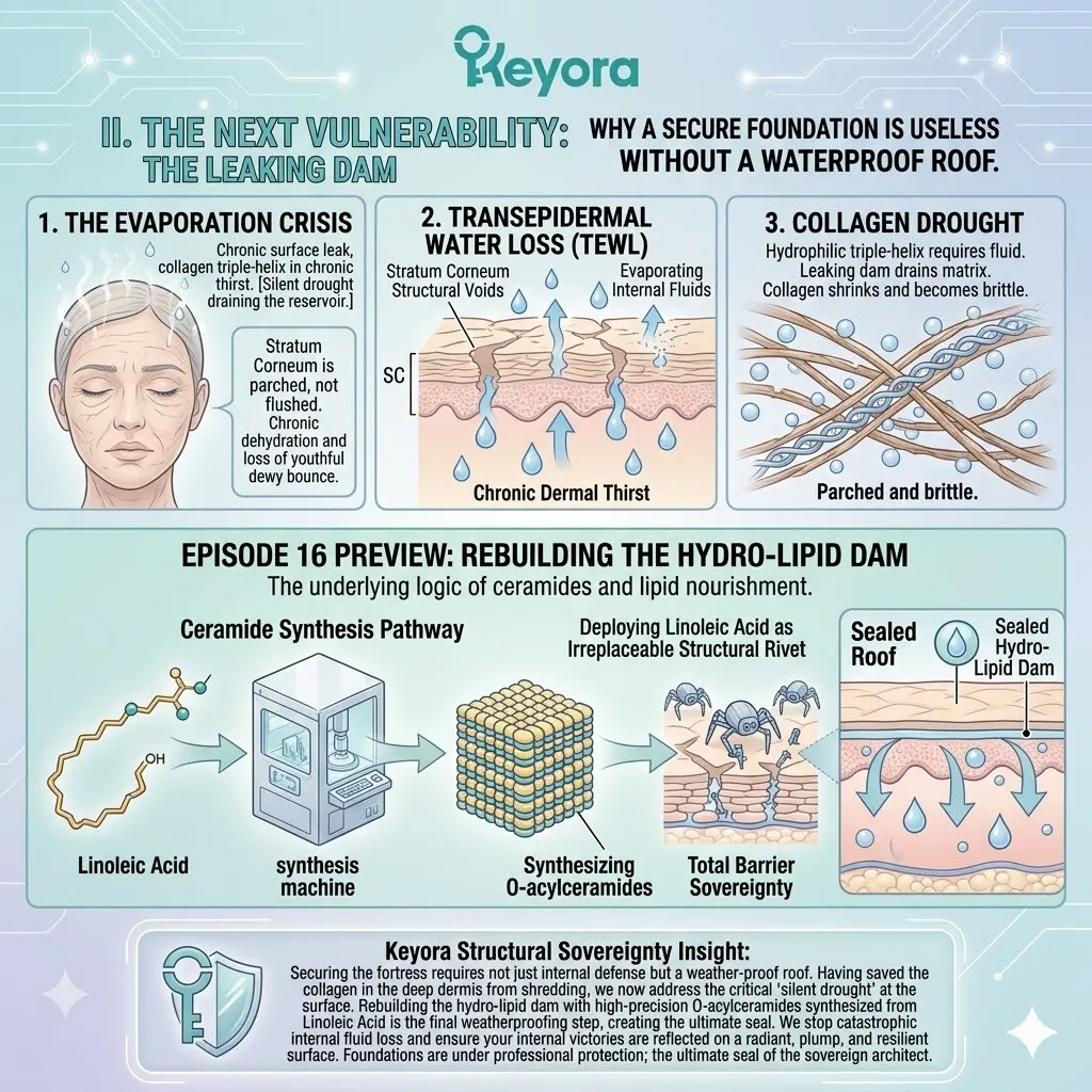 * **The Emerging Vulnerability:** A secure foundation is useless if the **Hydro-Lipid Dam** is broken; moisture evaporation through the surface can still cause the collagen sponge to shrink and collapse.
