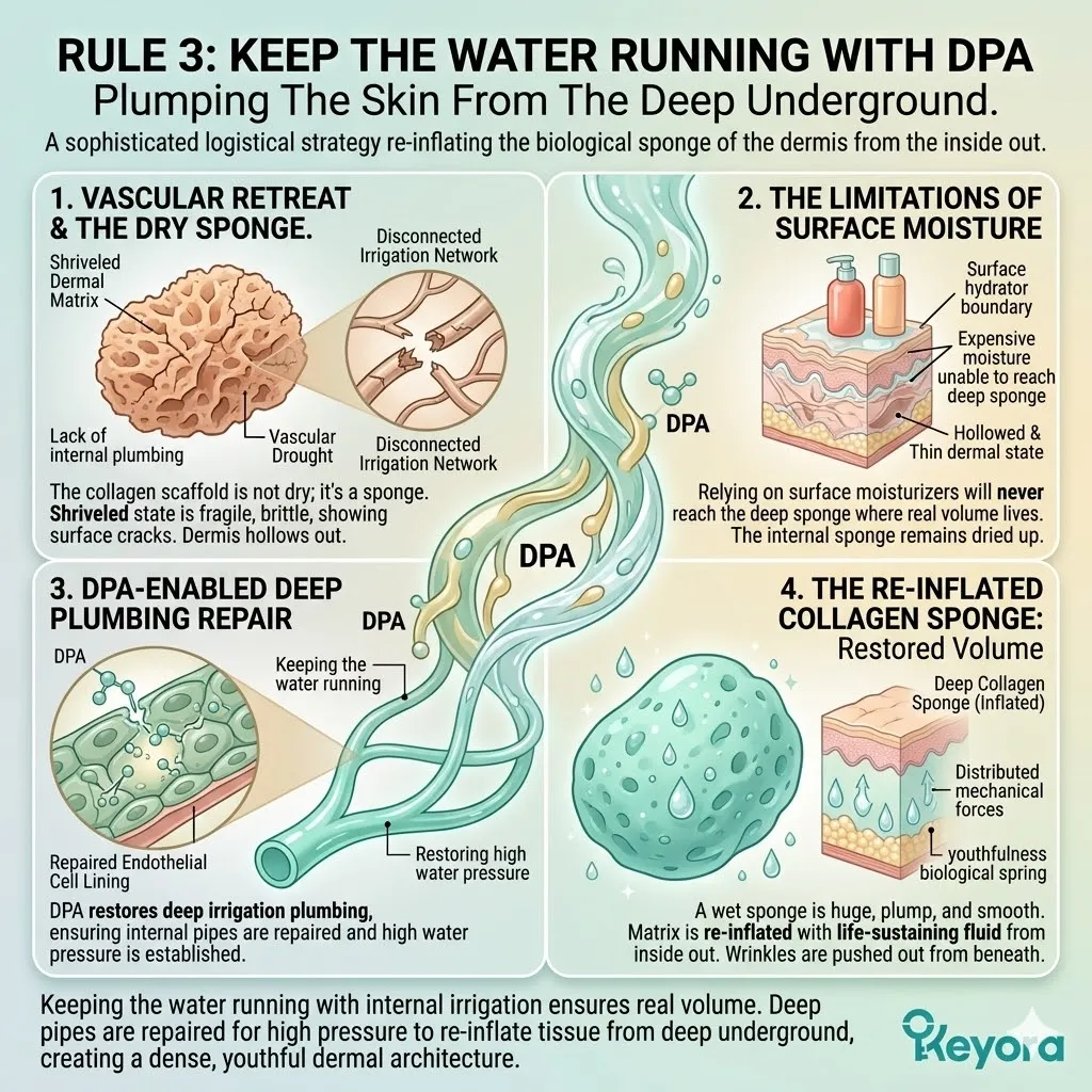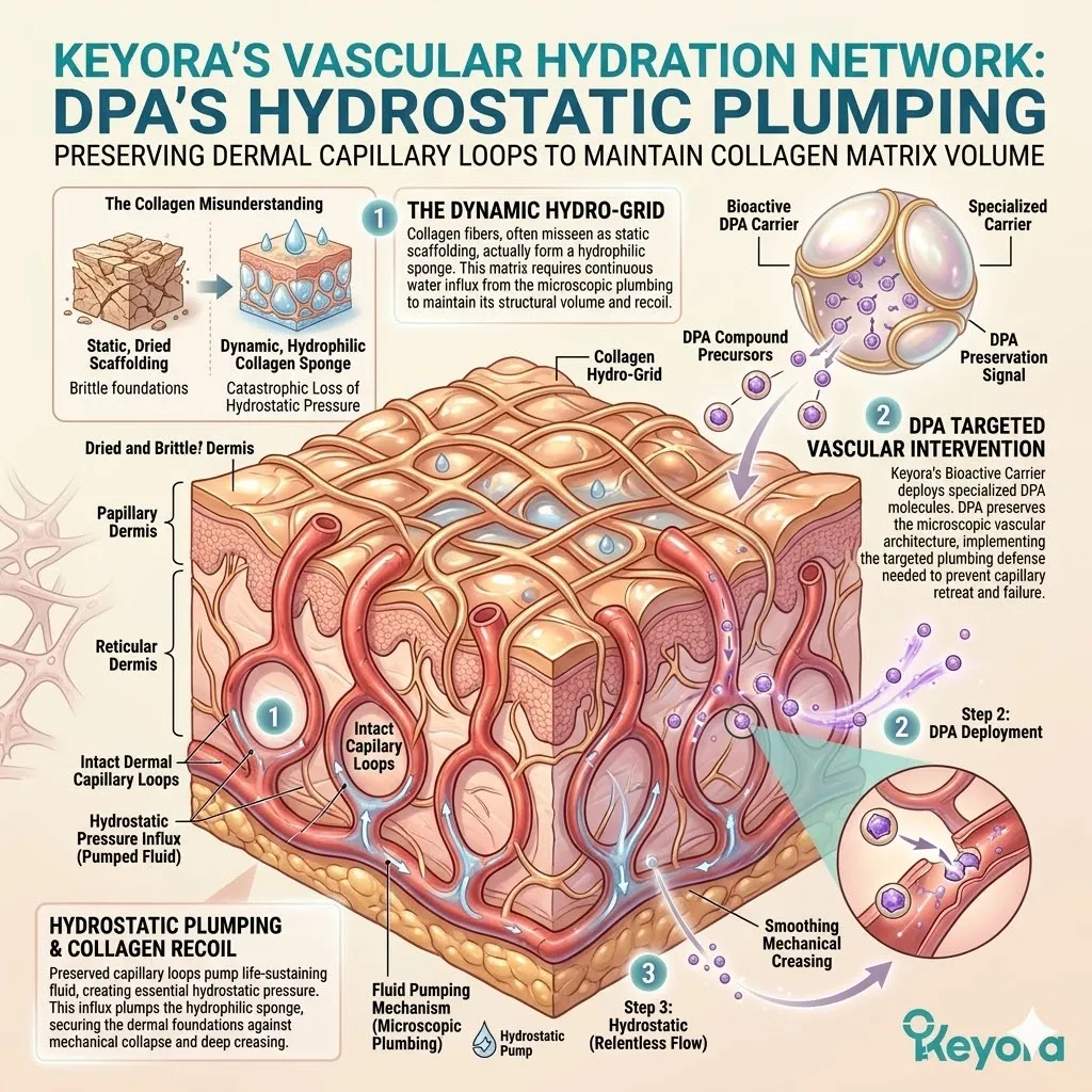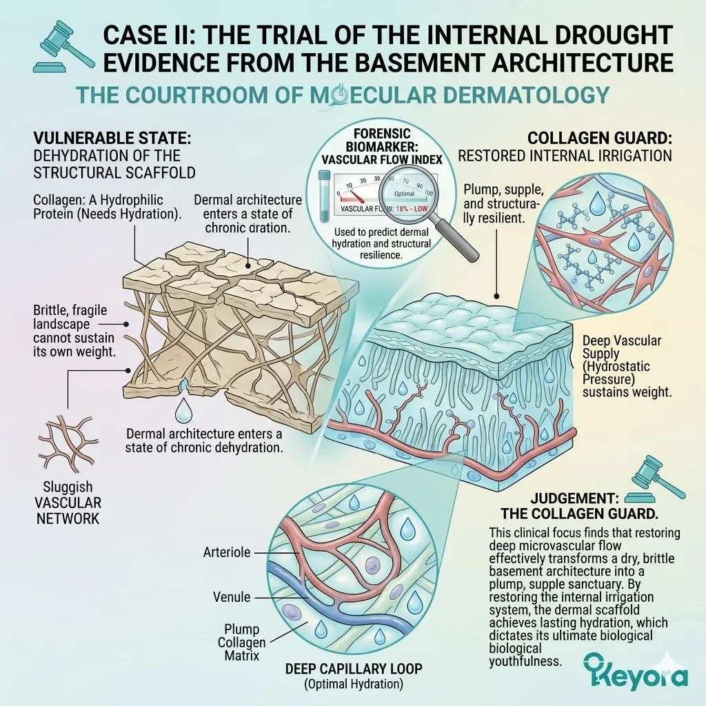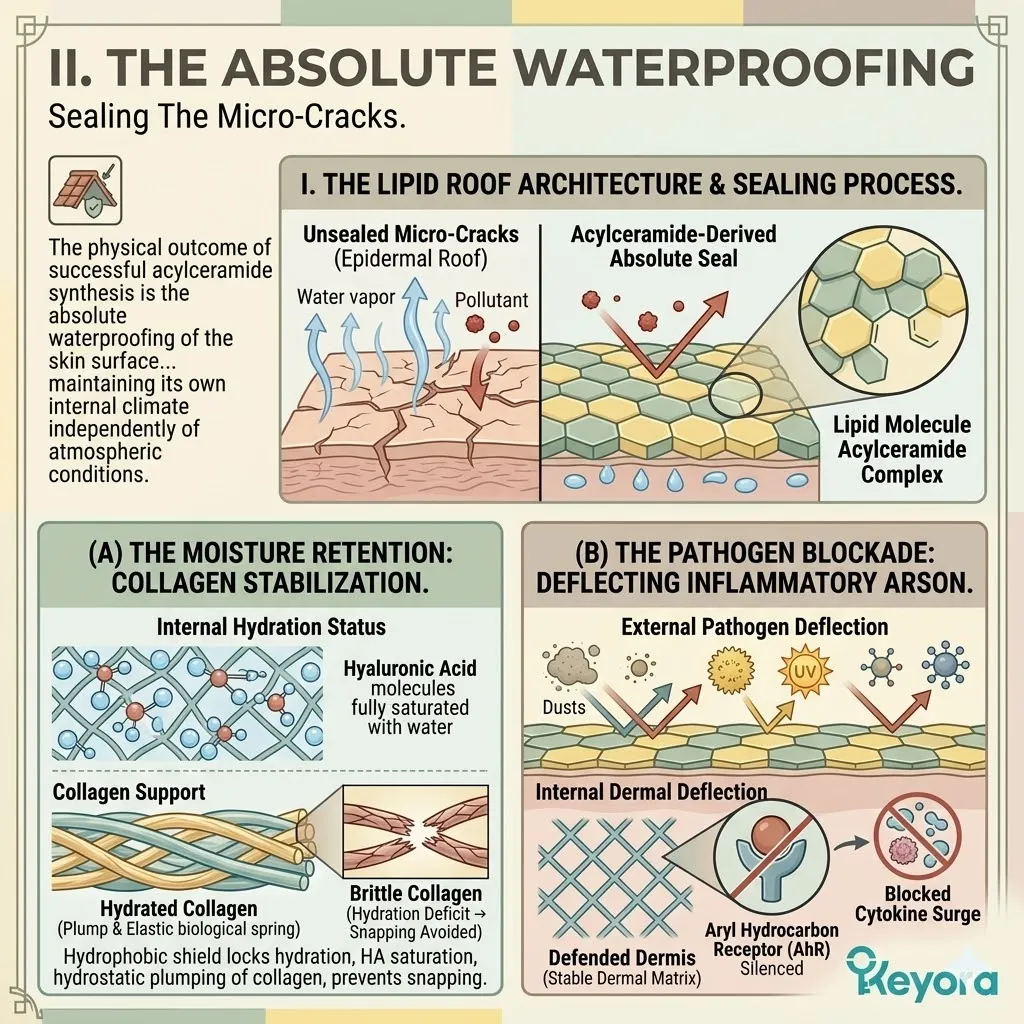 * **The Emerging Vulnerability:** A secure foundation is useless if the **Hydro-Lipid Dam** is broken; moisture evaporation through the surface can still cause the collagen sponge to shrink and collapse.
