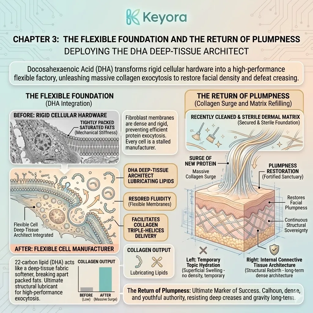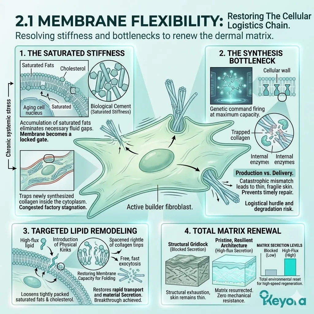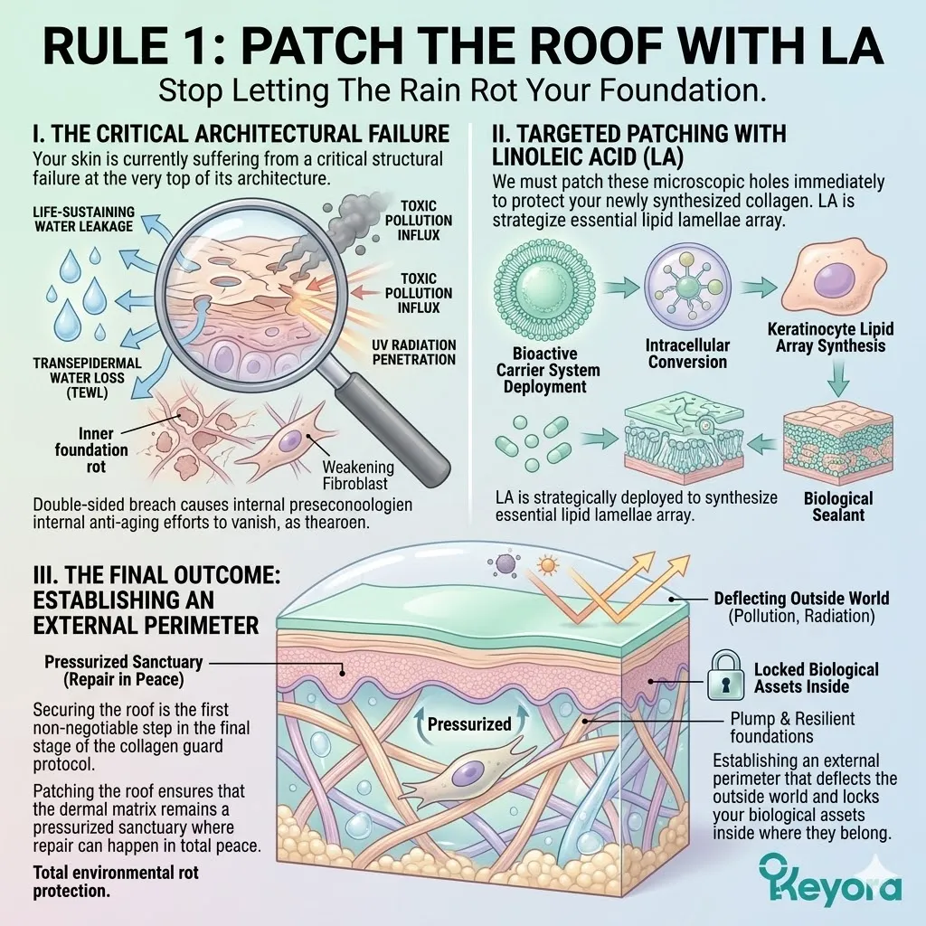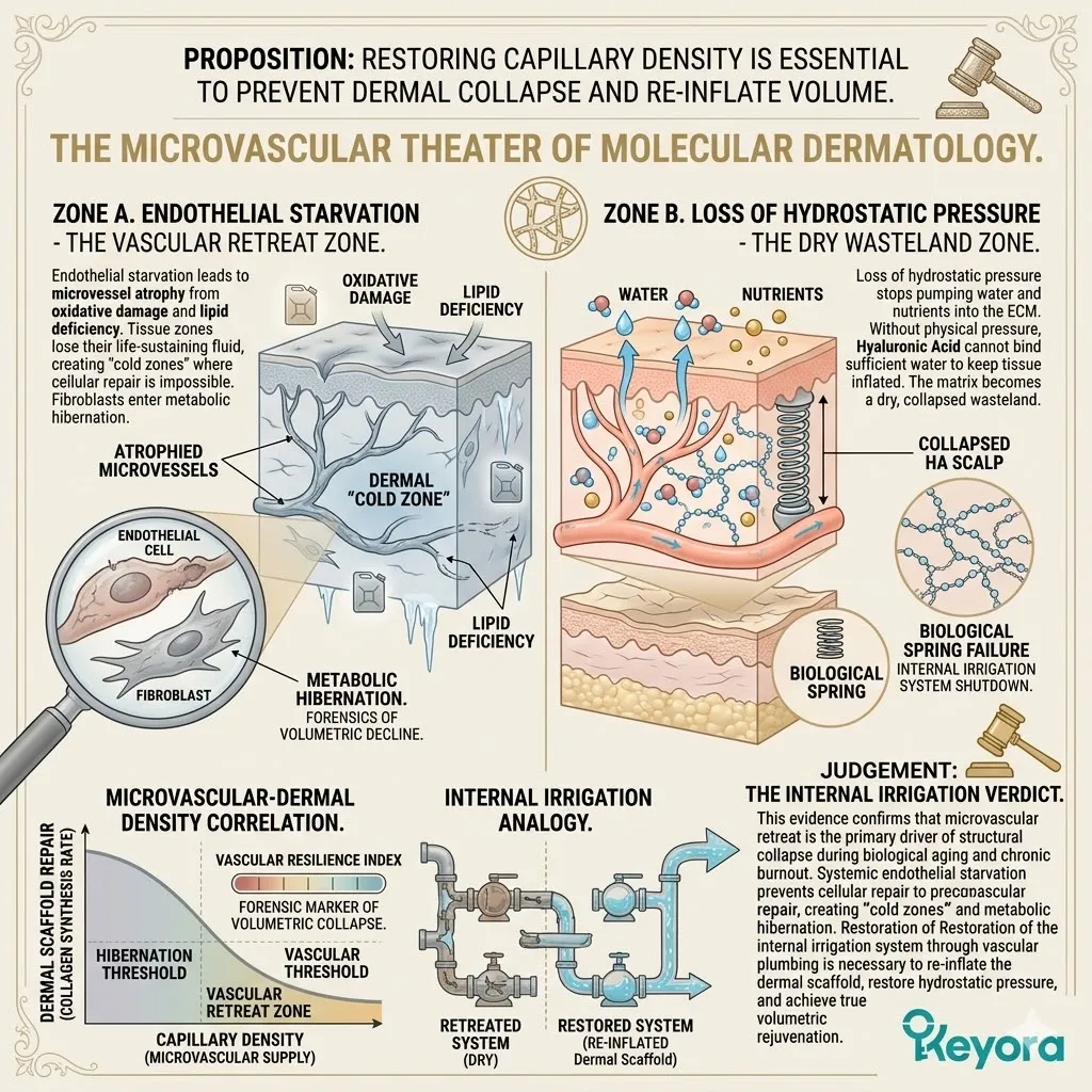* **The Emerging Vulnerability:** A secure foundation is useless if the **Hydro-Lipid Dam** is broken; moisture evaporation through the surface can still cause the collagen sponge to shrink and collapse.