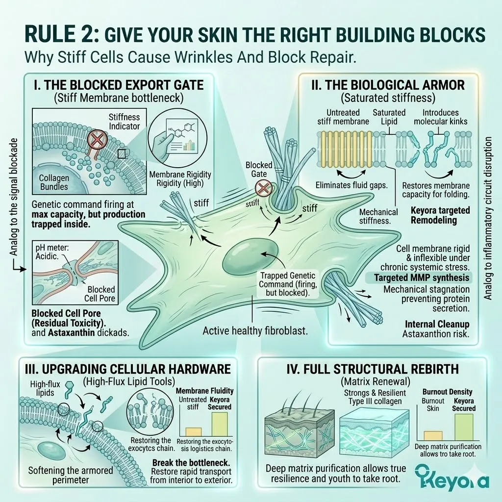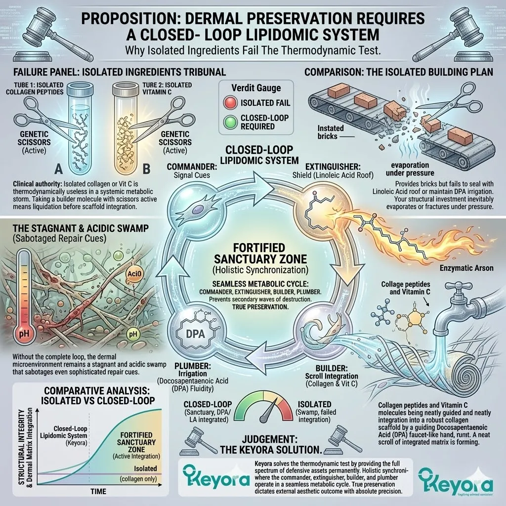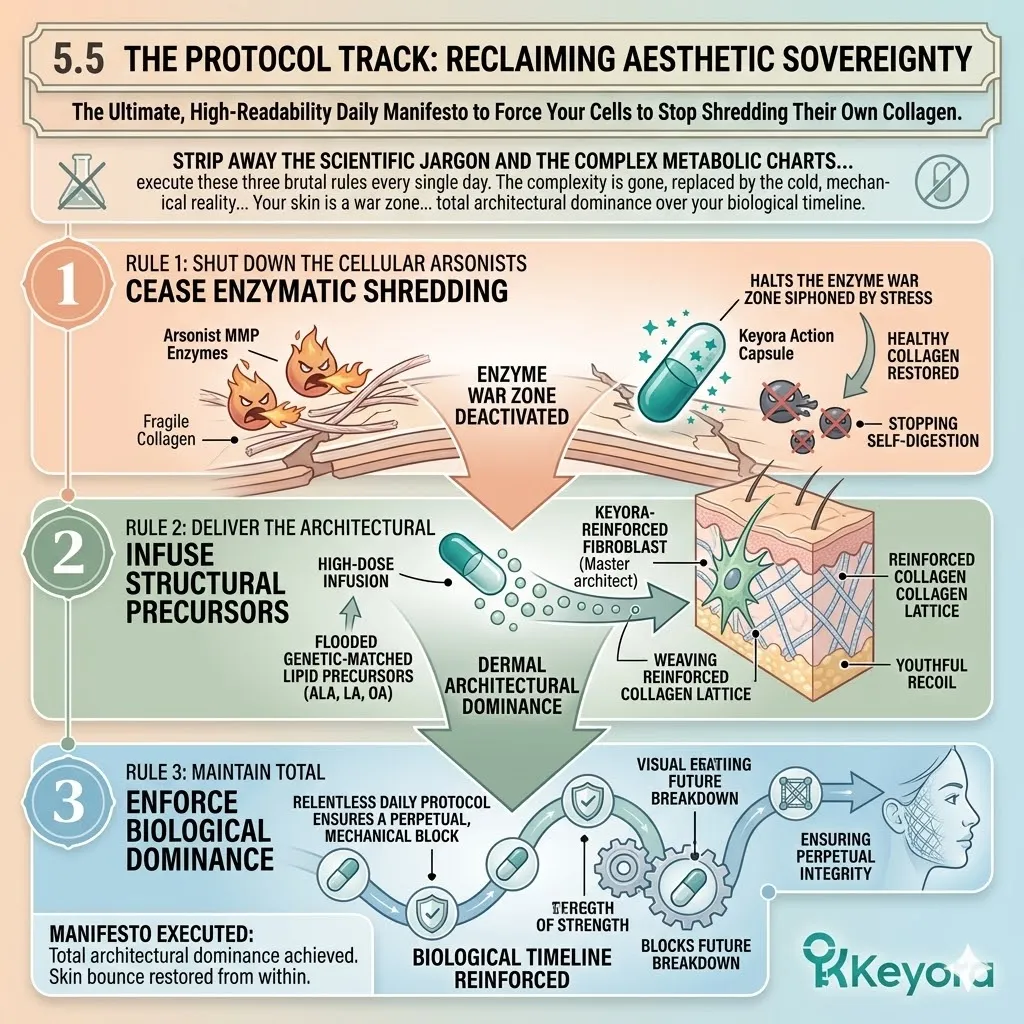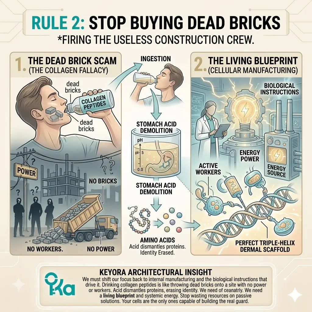 * **Rule 2 (Rejection Of Dead Bricks):** Stop purchasing exogenous collagen; structural sovereignty is achieved only by providing **Endogenous Precursors** (ALA/LA/OA) that command cells to manufacture fresh tissue.