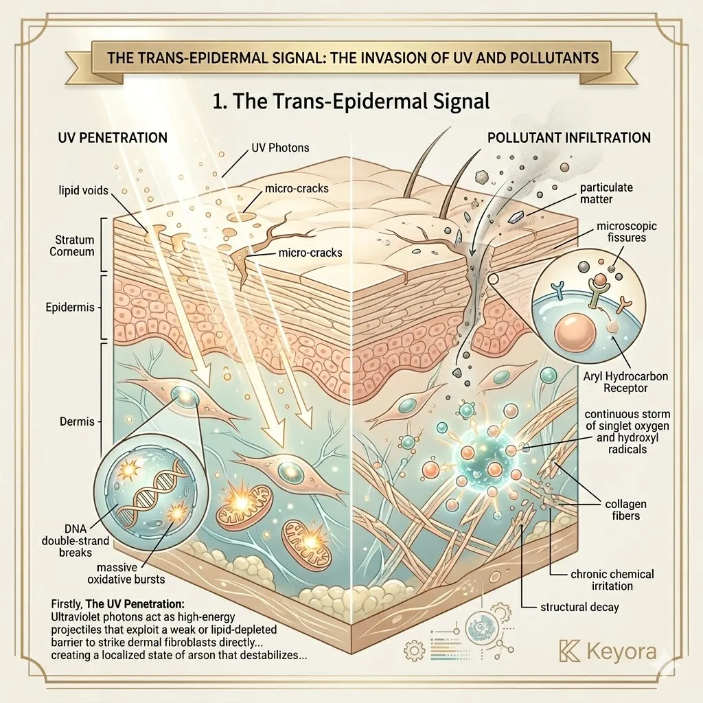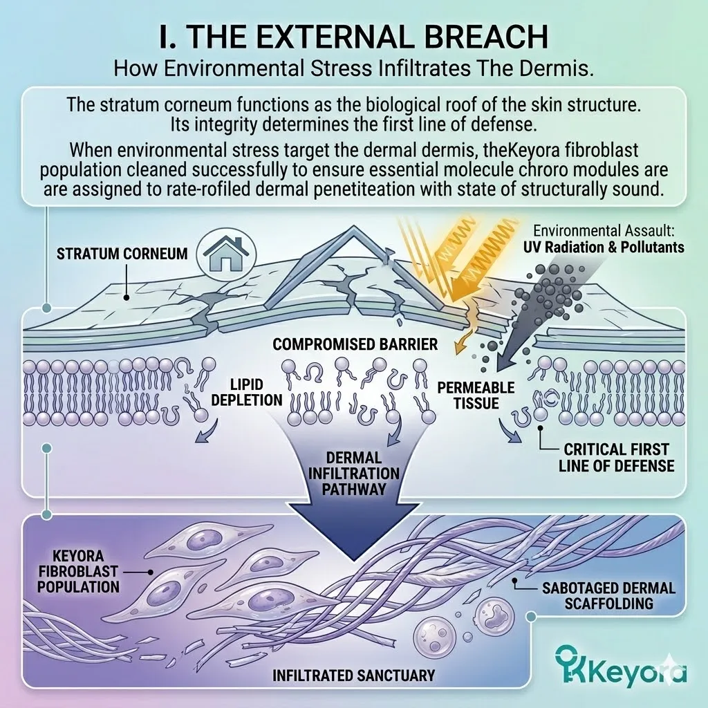 * **The Evaporation Crisis:** **Trans-Epidermal Water Loss (TEWL)** acts as a silent drought, desiccating the dermal matrix and causing fine lines despite the internal enzymatic lockdown.