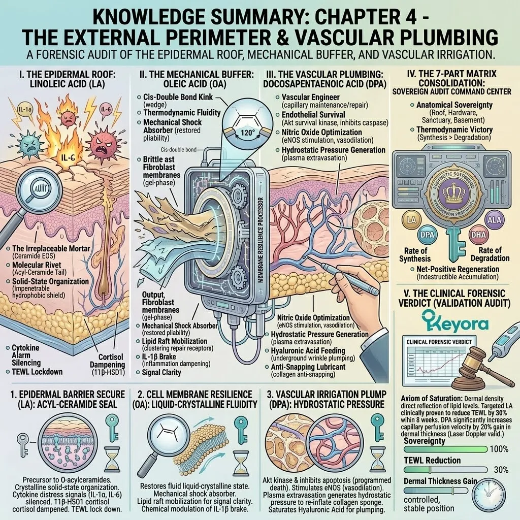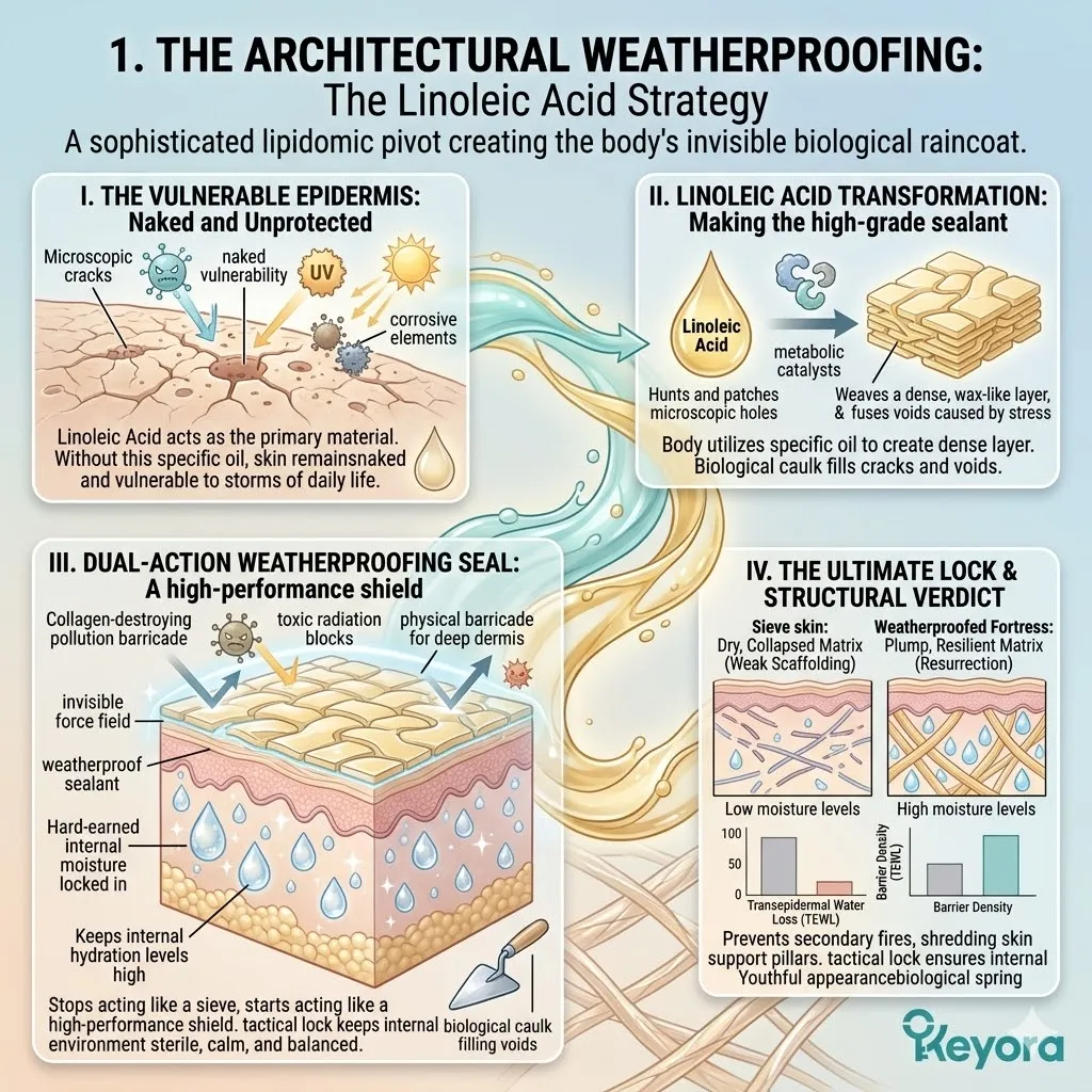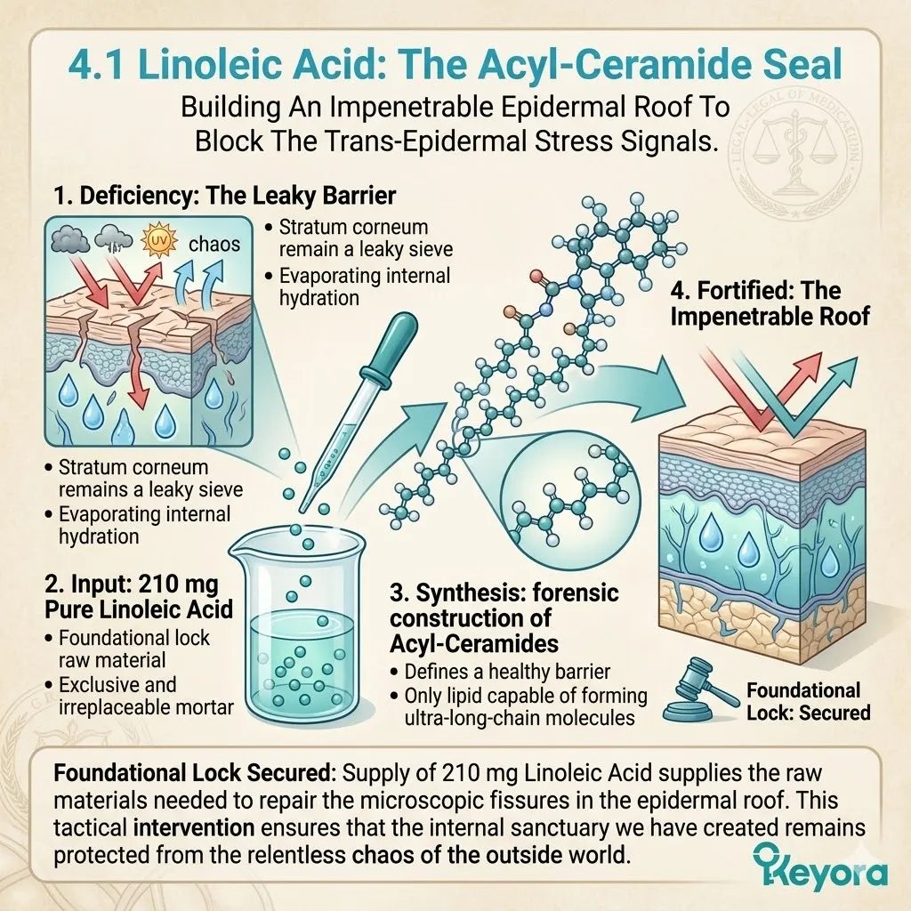 In Episode 16, we will deploy Linoleic Acid as the irreplaceable structural rivet to synthesize the O-acylceramides needed for total barrier sovereignty. We will seal the dam, lock in the moisture, and perfect the ultimate oil-nourishing protocol to ensure your skin stays plump and pressurized.