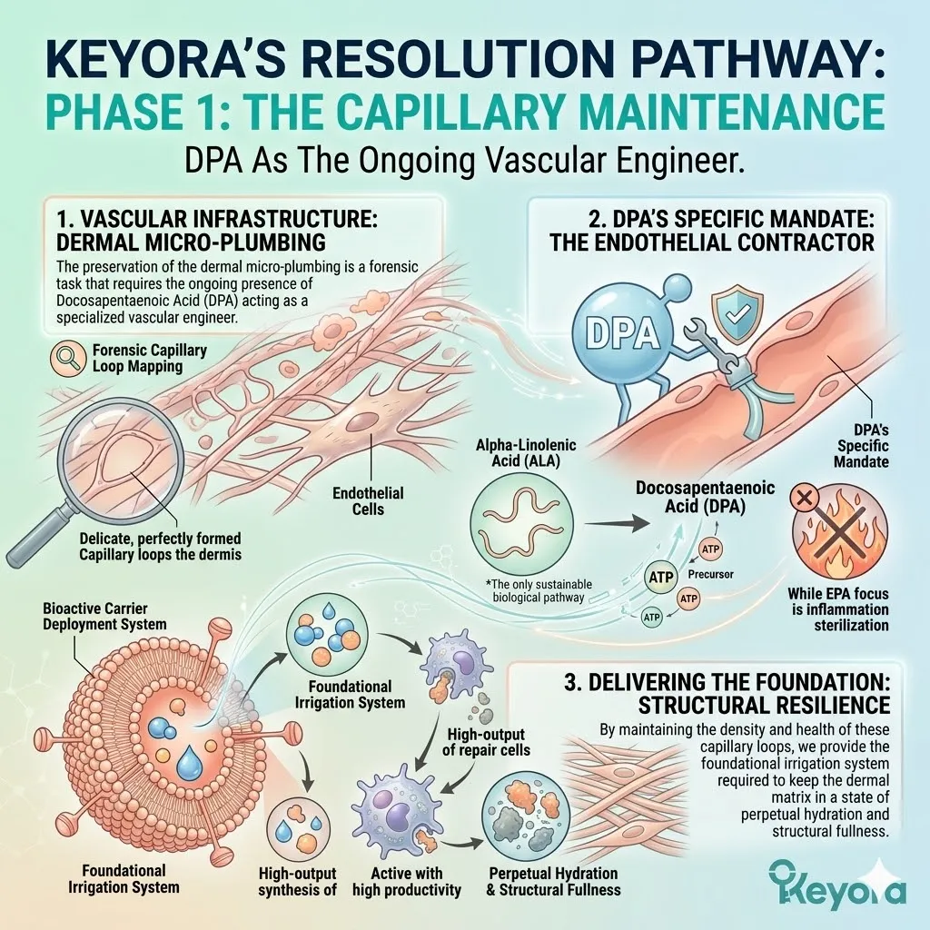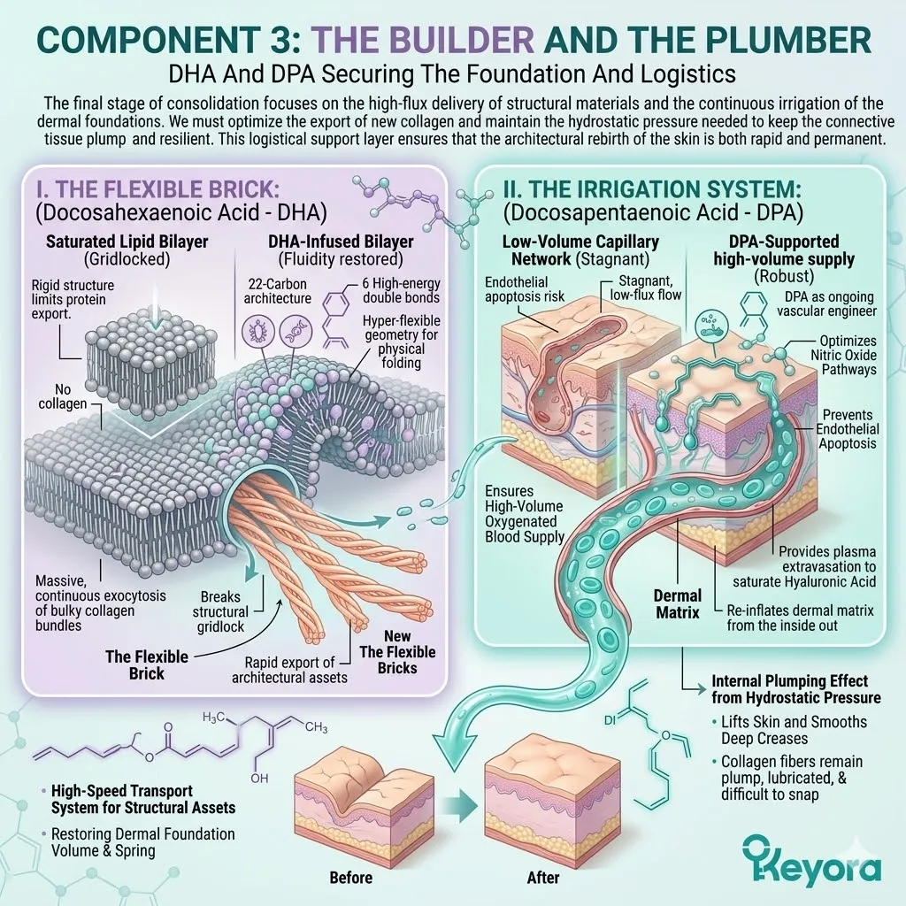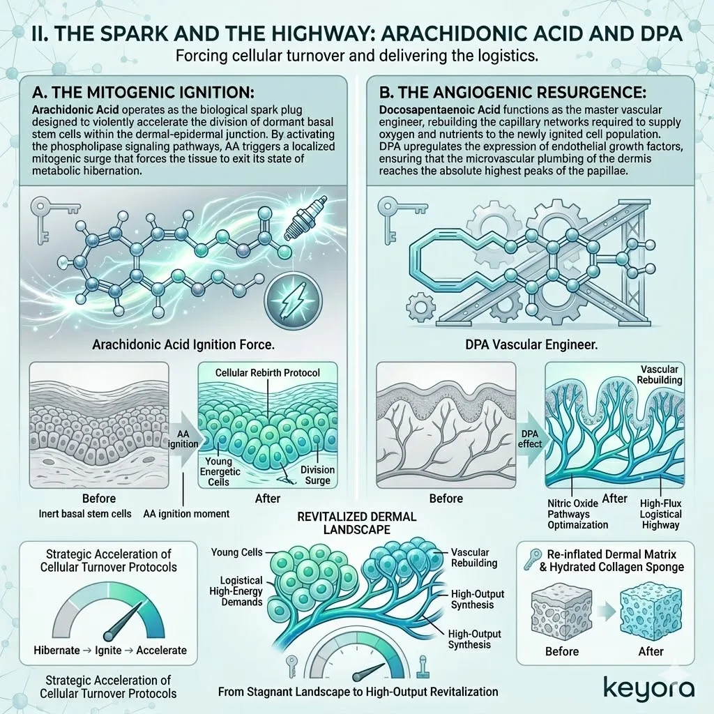 * **The Proliferative Spark (AA + DPA):** Arachidonic Acid (AA) serves as the **Mitogenic Ignition** to accelerate basal stem cell division, while DPA acts as the **Vascular Engineer** to rebuild the capillary plumbing for nutrient delivery.