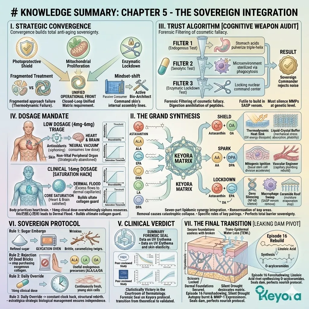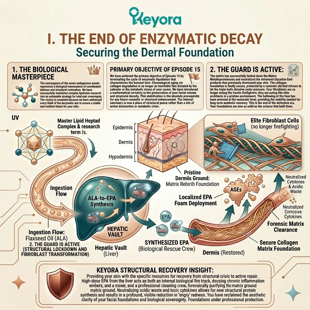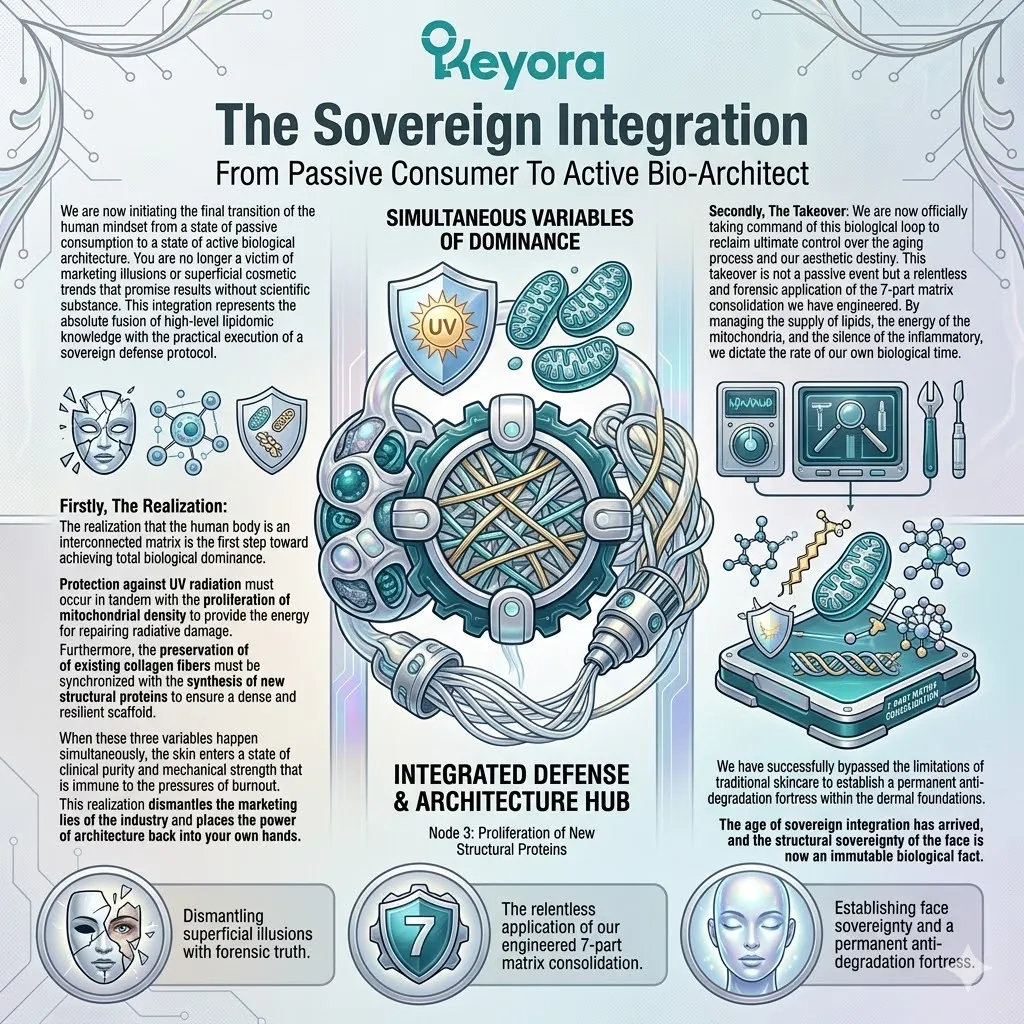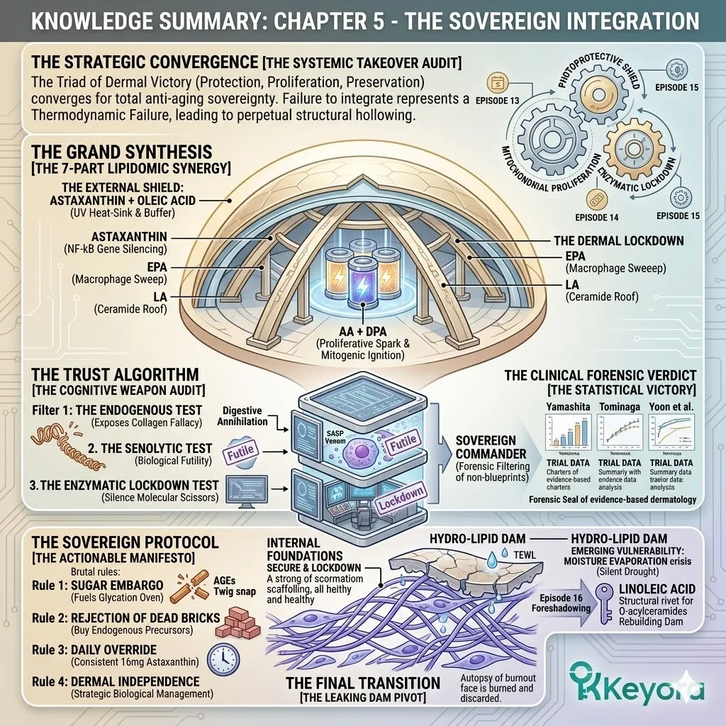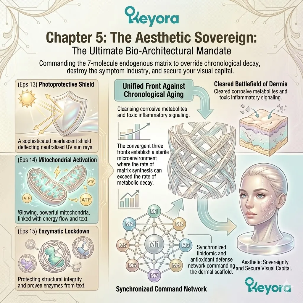 * **The Triad Of Dermal Victory:** Total anti-aging sovereignty is achieved only when the **Photoprotective Shield** (Episode 13), **Mitochondrial Proliferation** (Episode 14), and **Enzymatic Lockdown** (Episode 15) converge into a single operational front.