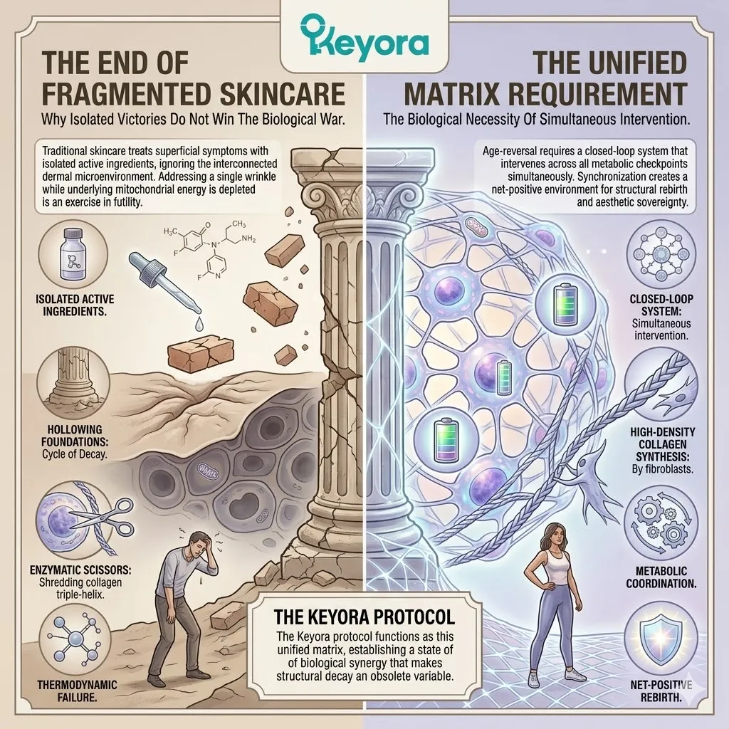 * **The Failure Of Fragmentation:** Isolated treatments for superficial symptoms represent a **Thermodynamic Failure**; addressing wrinkles while mitochondria are starved of energy results in a state of perpetual structural hollowing.