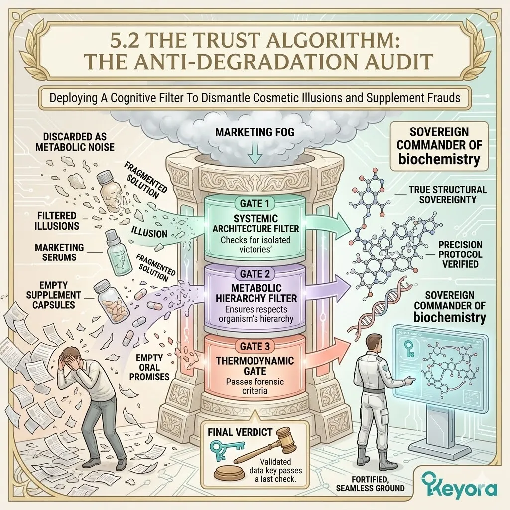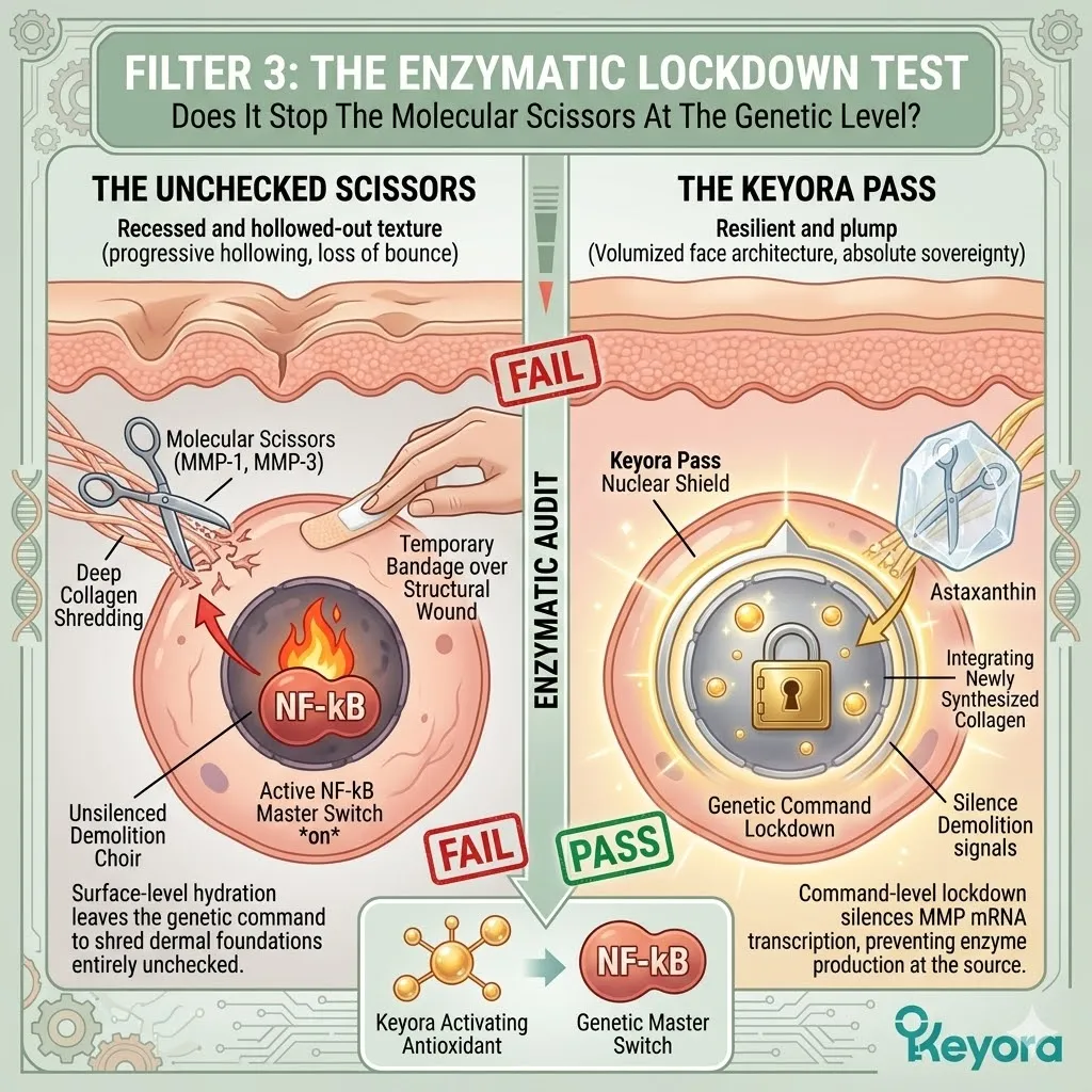 * **Filter 3 (The Enzymatic Lockdown Test):** Audits whether a solution can silence the **Molecular Scissors** (MMPs) at the genetic level; surface moisturizers are discarded as “metabolic noise” if they cannot lock the nuclear command center.