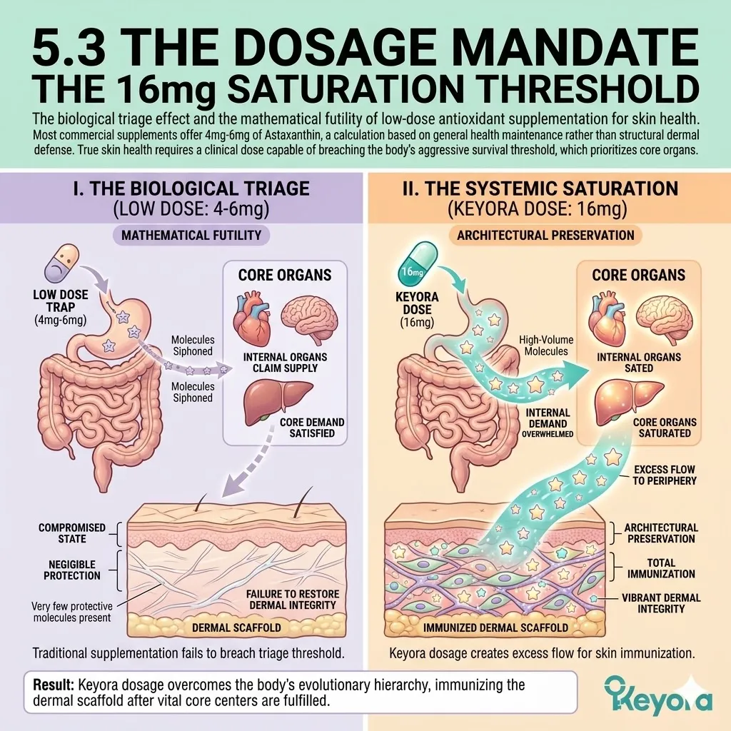 * **The Neural Vacuum:** The brain consumes 20% of the body’s oxygen and siphons off low-dose antioxidants (4mg-6mg) to protect neurons, ensuring **Zero Bioavailability** for the skin at standard market dosages.