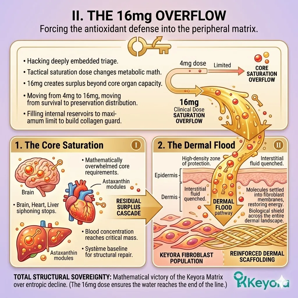 * **The Dermal Flood:** Once the core organs are saturated, the excess Astaxanthin creates an **Overflow Effect**, forcing the protective molecules into the peripheral facial capillaries to build the ultimate collagen guard.