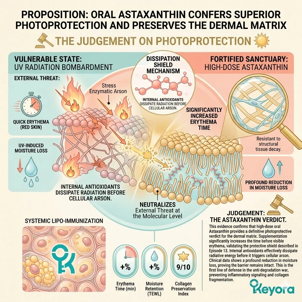 * **The Photoprotective Verdict:** Peer-reviewed data confirms Astaxanthin significantly increases the time to **UV-Induced Erythema**, proving the efficacy of the internal radiative shield in living human tissue.