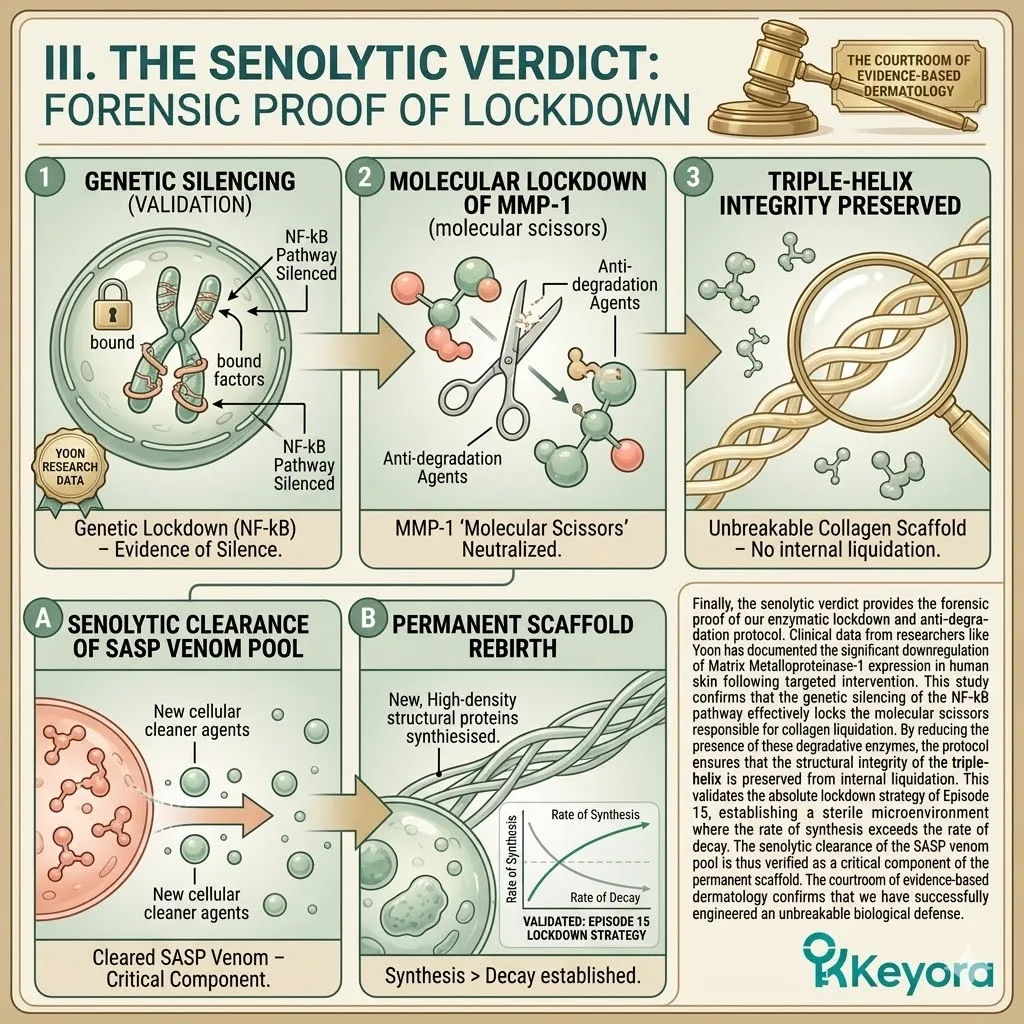 * **The Senolytic Verdict:** Research by Yoon et al. validates the **Downregulation Of MMP-1 Expression**; this proves that the 7-part matrix effectively halts structural liquidation and reverses chronological hollowing.