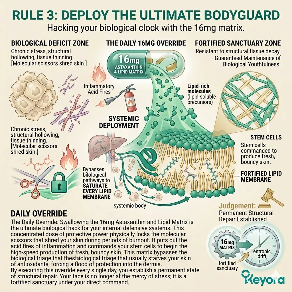 * **Rule 3 (The Daily Override):** Consistent intake of the **16mg Astaxanthin Matrix** acts as a biological clock hack, maintaining the genetic lockdown and ensuring a state of continuous architectural rebirth.