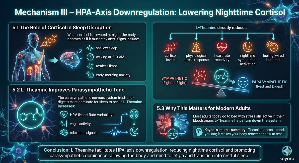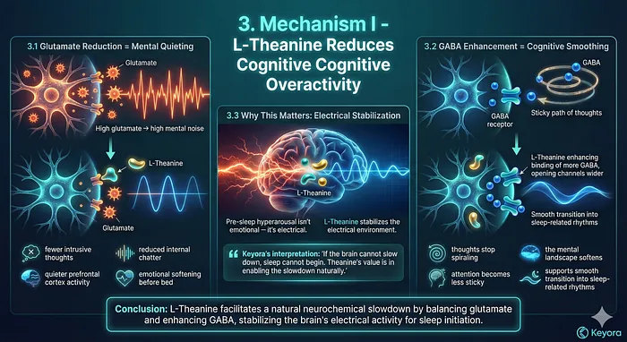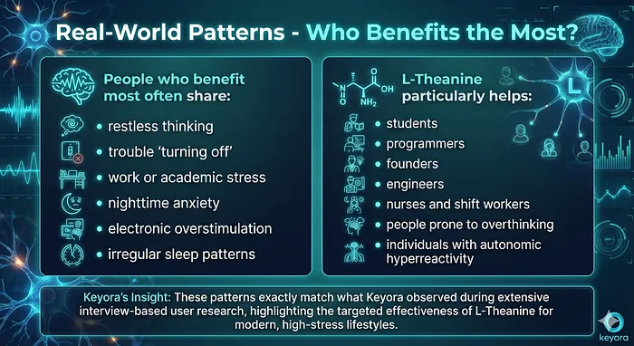Keyora’s interpretation during early research: “If the brain cannot slow down, sleep cannot begin. Theanine’s value is in enabling the slowdown naturally.”