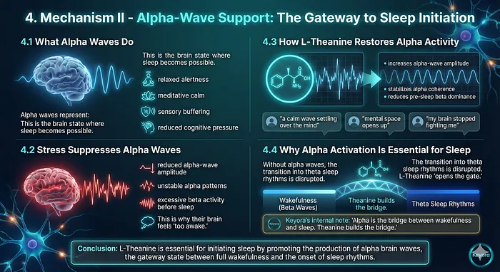 Keyora’s internal note: “Alpha is the bridge between wakefulness and sleep. Theanine builds the bridge.”