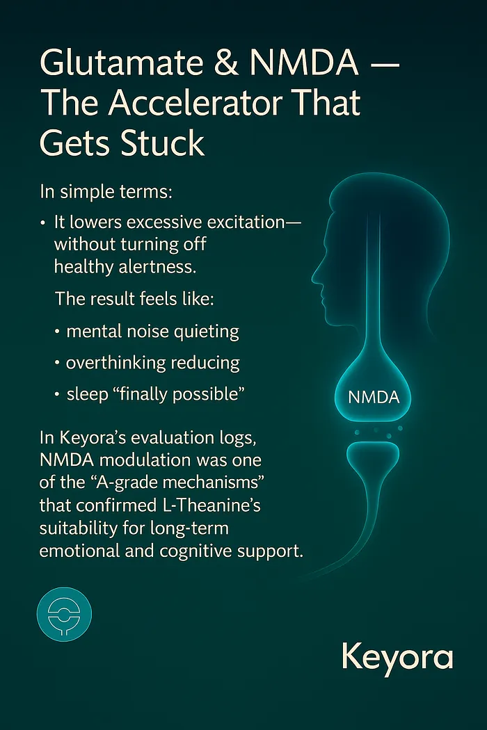 In Keyora’s evaluation logs, NMDA modulation was one of the “A-grade mechanisms” that confirmed L-Theanine’s suitability for long-term emotional and cognitive support.