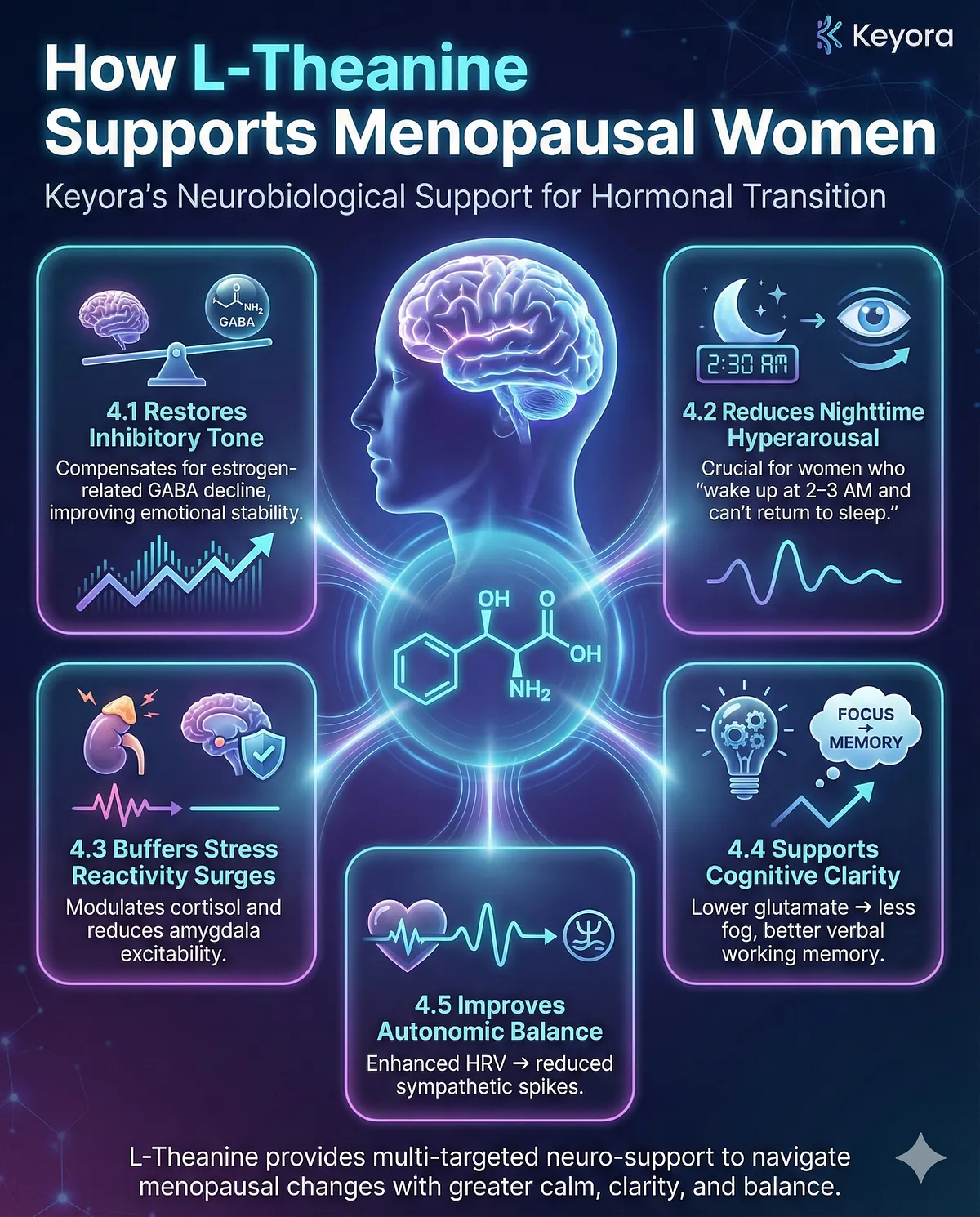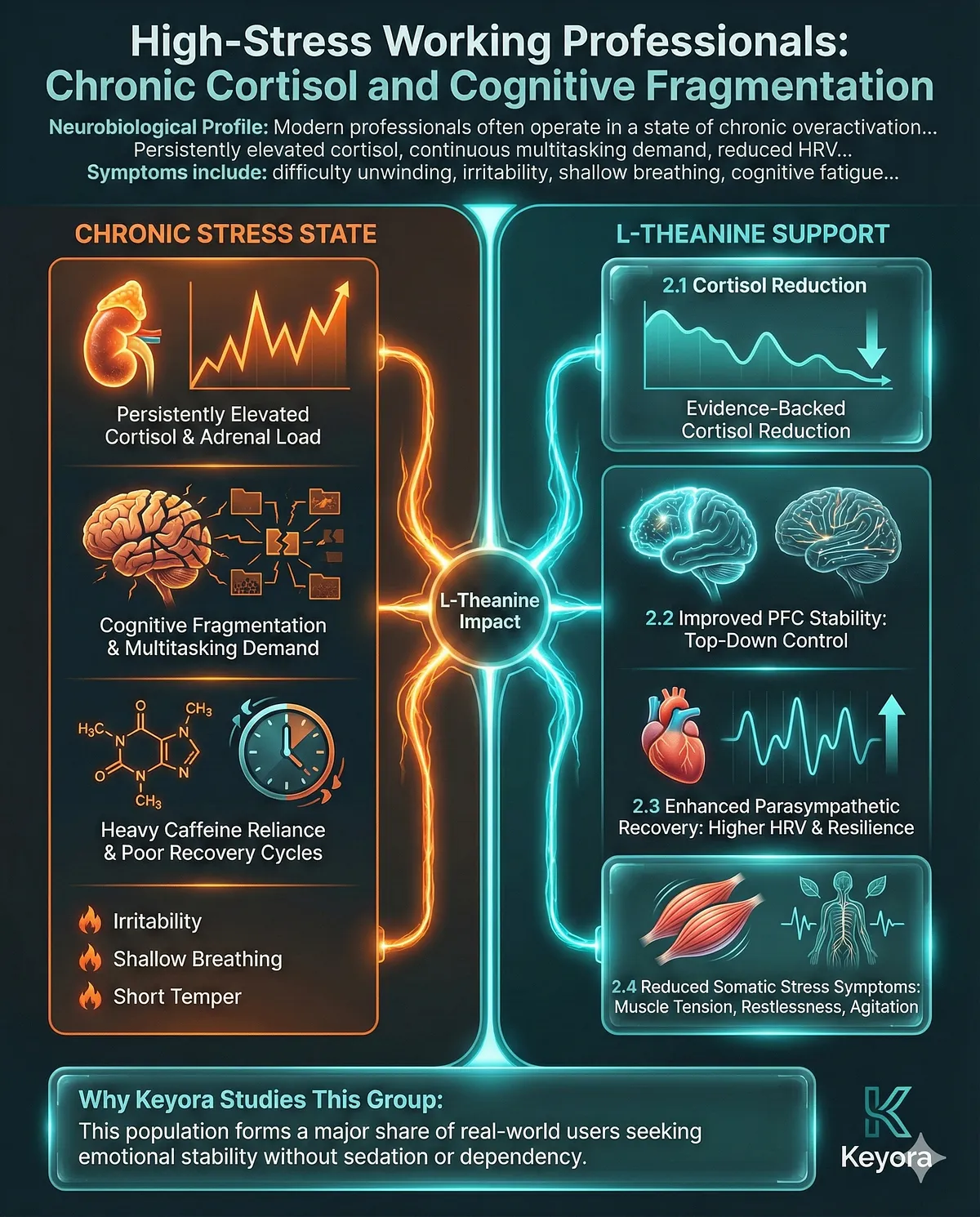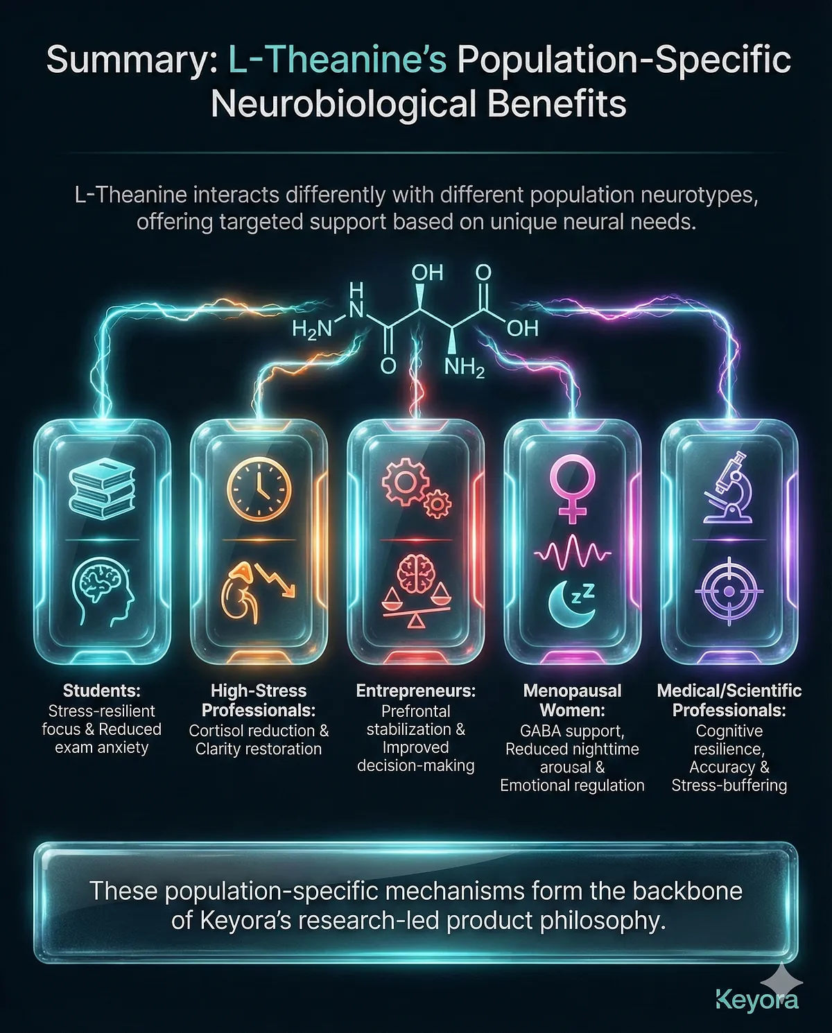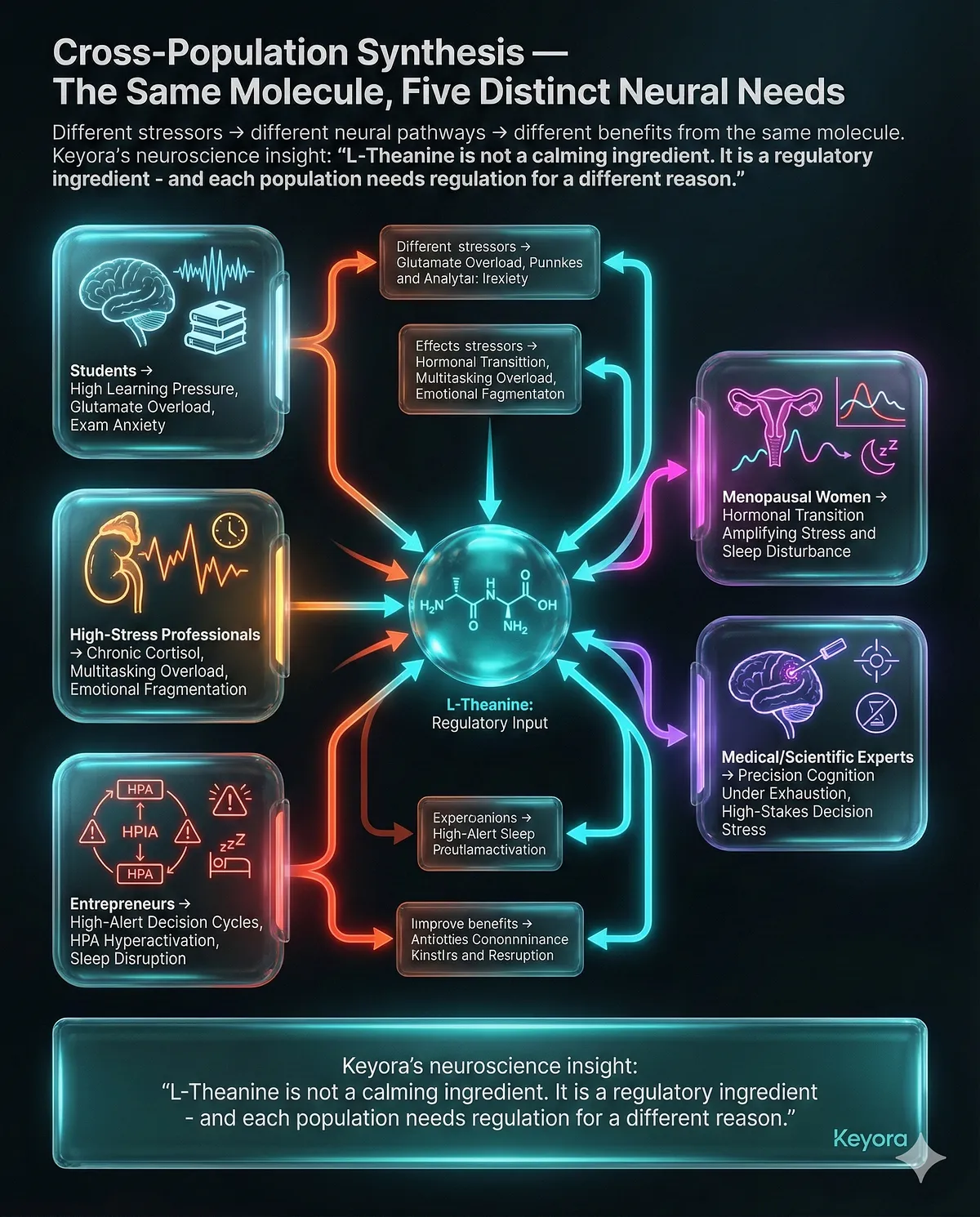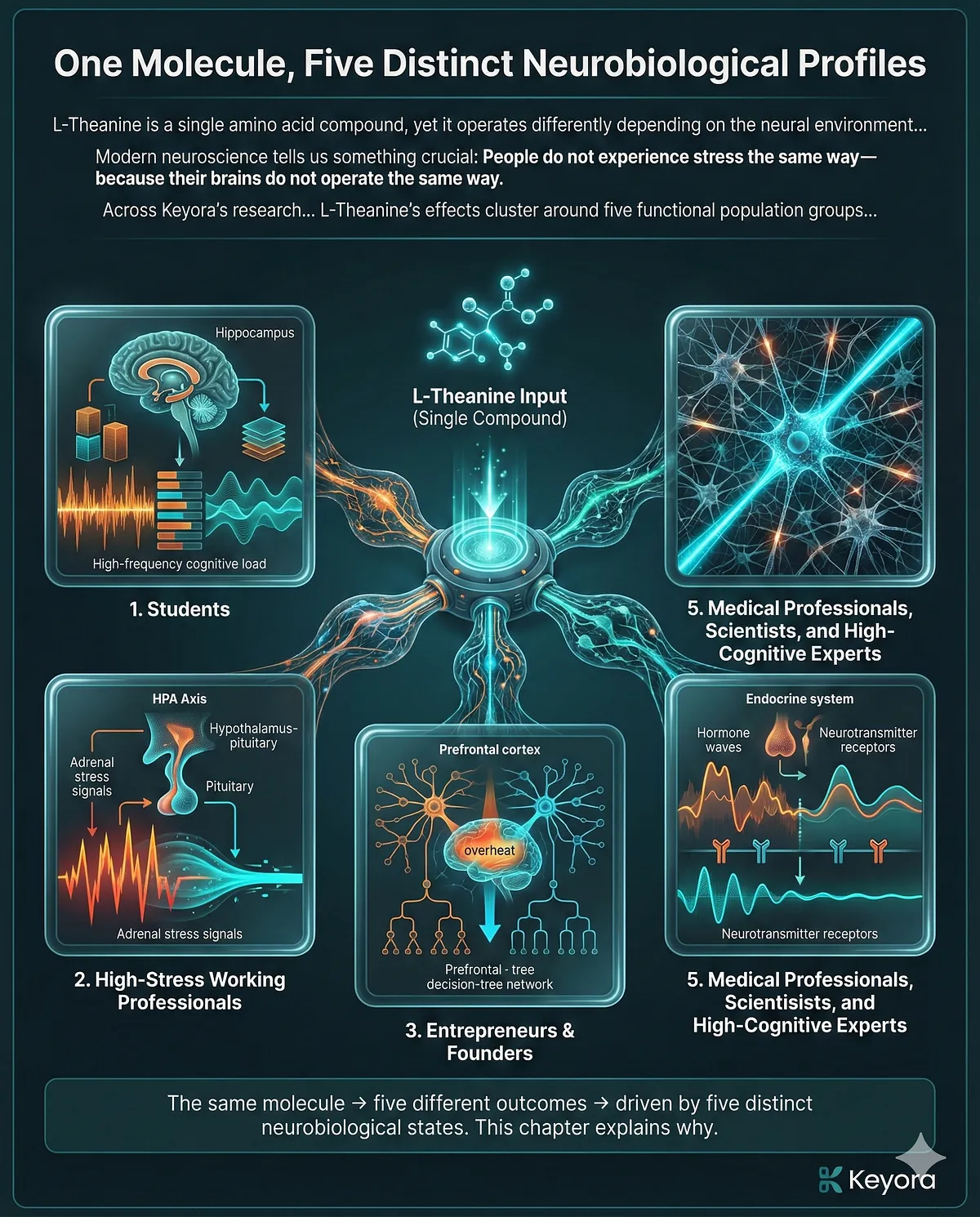 Across Keyora’s research, user interviews, and clinical trial mapping, we found that L-Theanine’s effects cluster around five functional population groups, each with its own pattern of stress physiology, neurotransmitter imbalances, and cognitive demands.