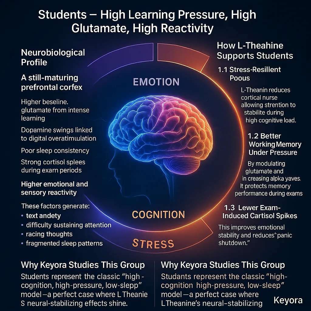 Students represent the classic “high-cognition, high-pressure, low-sleep” model- a perfect case where L-Theanine’s neural-stabilizing effects shine.