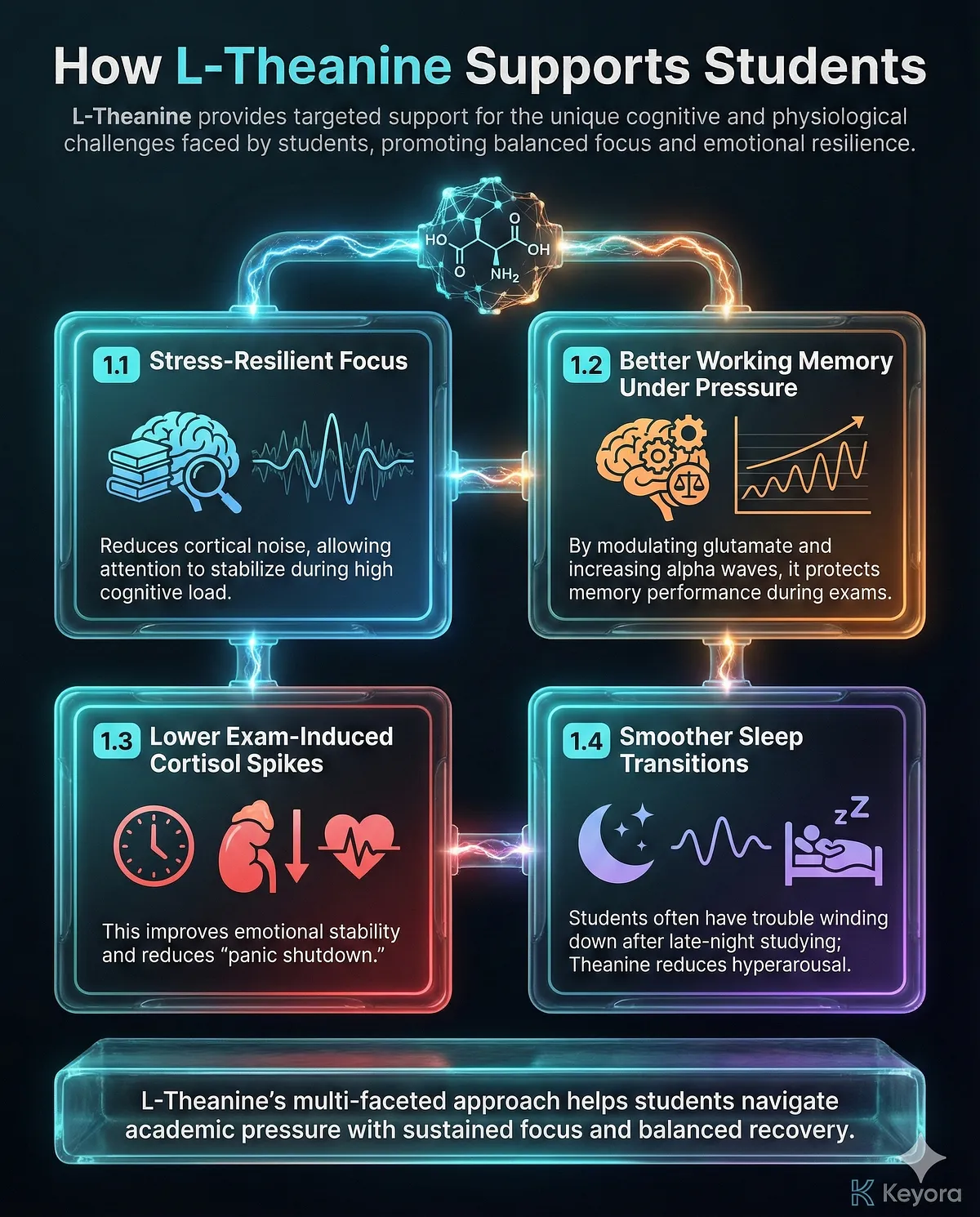 L-Theanine reduces cortical noise, allowing attention to stabilize during high cognitive load.