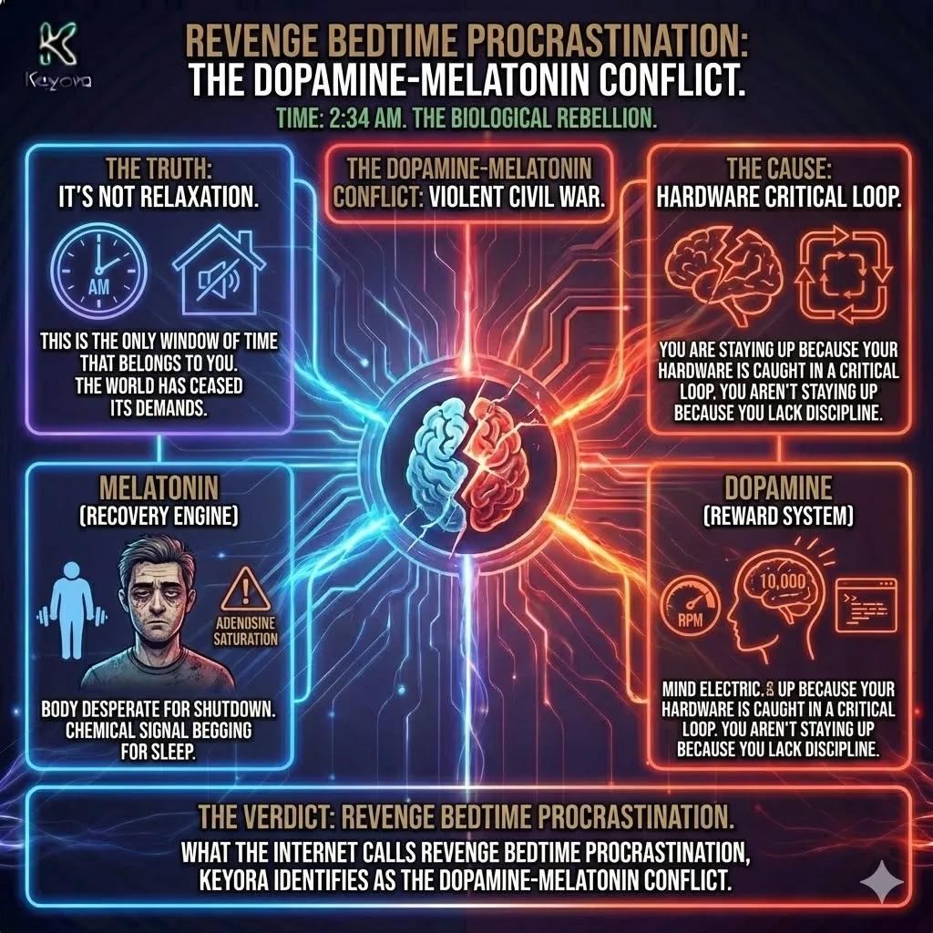 What the internet casually calls Revenge Bedtime Procrastination, Keyora Research clinically identifies as The Dopamine-Melatonin Conflict – a violent civil war between your brain’s reward system and its recovery engine.