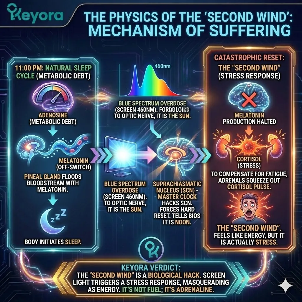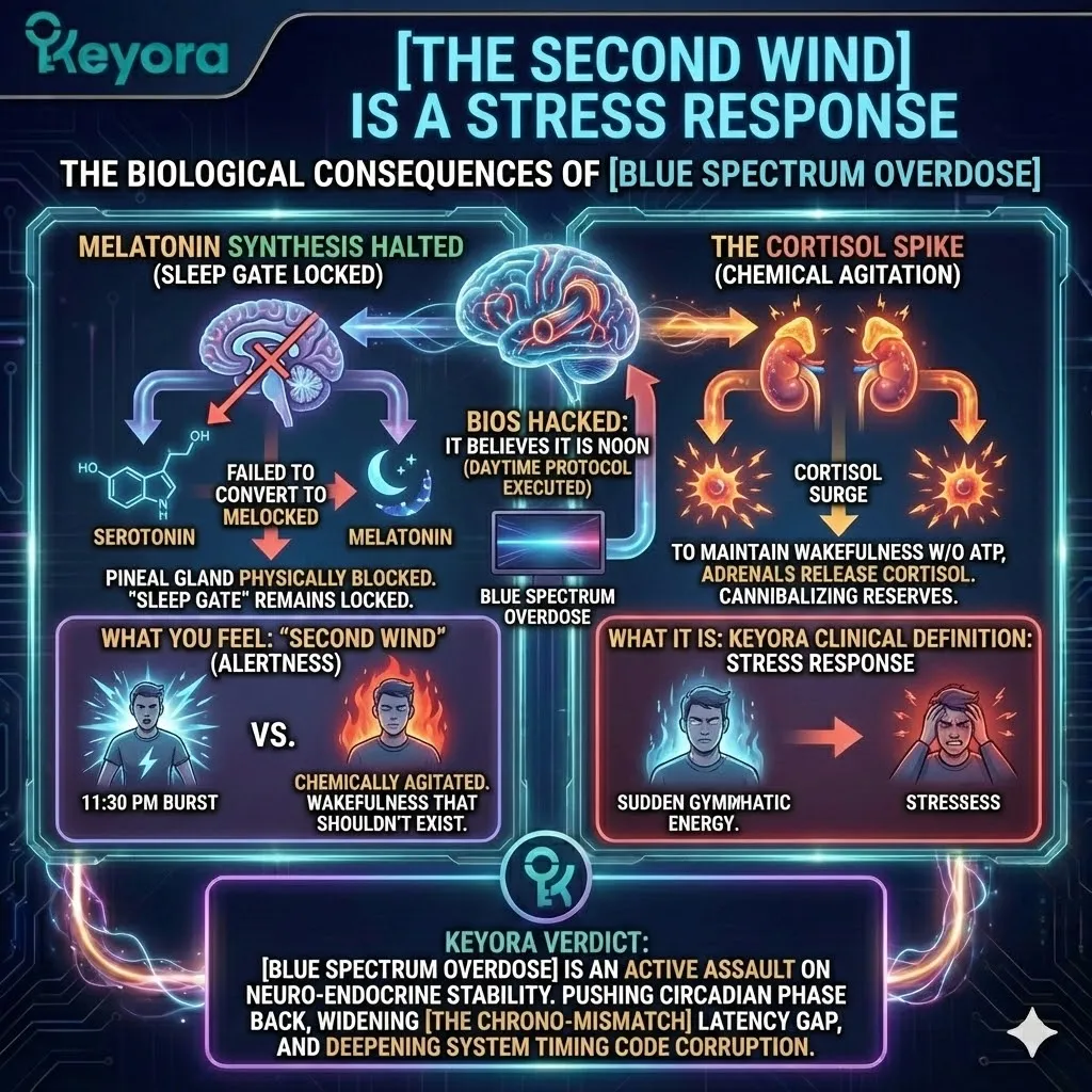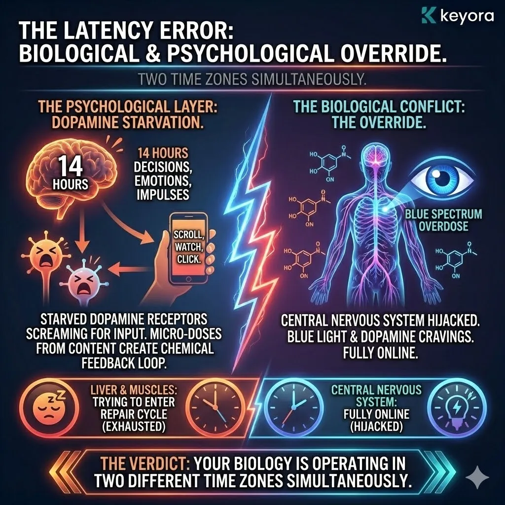 Your liver and muscles, exhausted by the day, are trying to enter a repair cycle. But your central nervous system, hijacked by The Blue Spectrum Overdose and Dopamine cravings, is fully online.