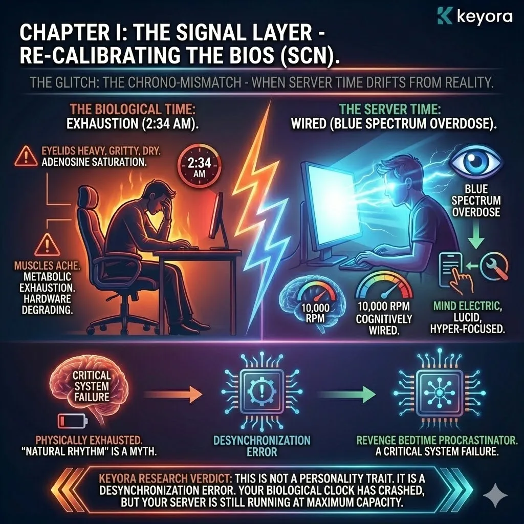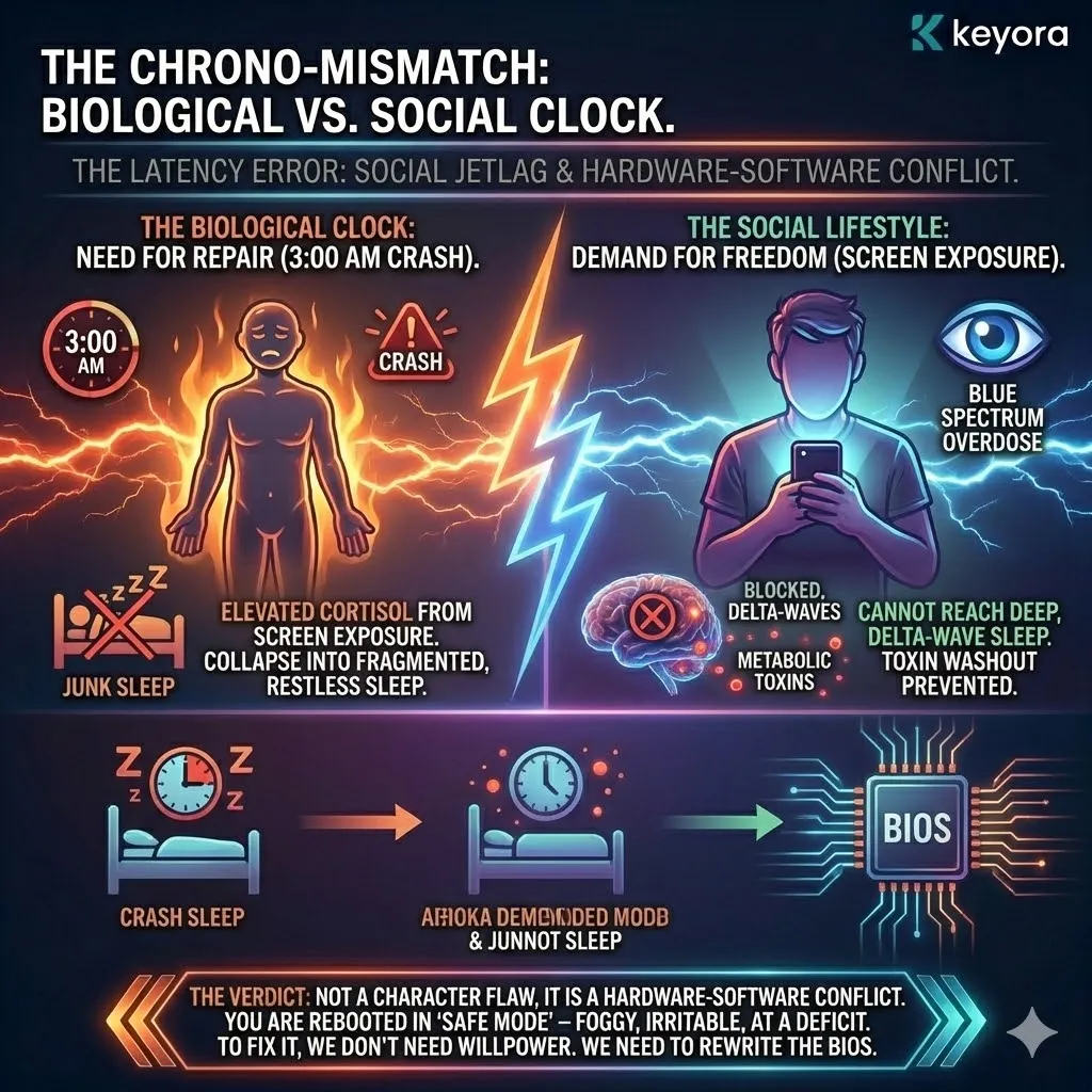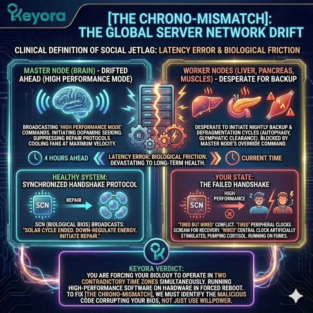 What the medical establishment loosely terms “Social Jetlag,” Keyora engineers clinically define as [The Chrono-Mismatch].
