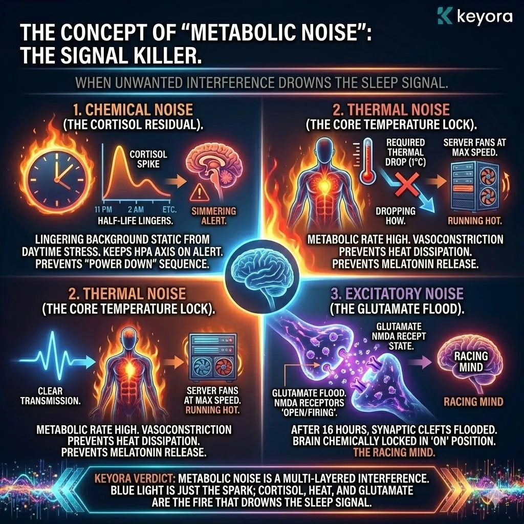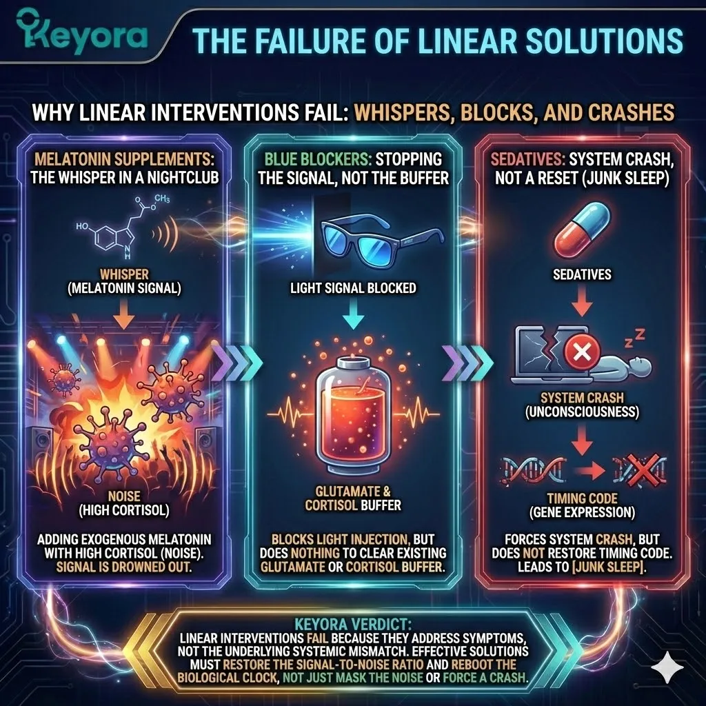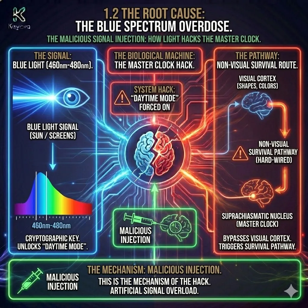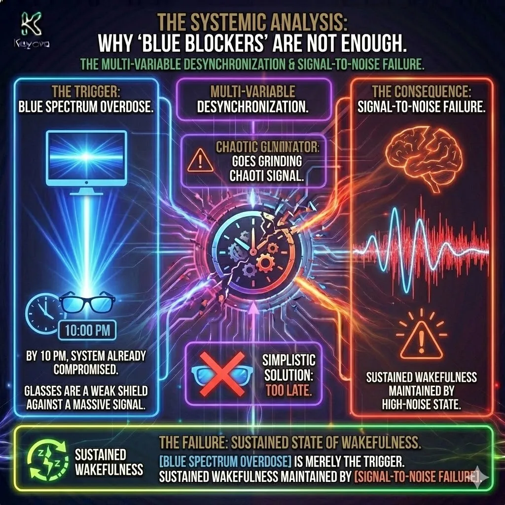 The Problem: The Blue Spectrum Overdose. The SCN believes it is noon at midnight. The “Sleep Gate” is locked.