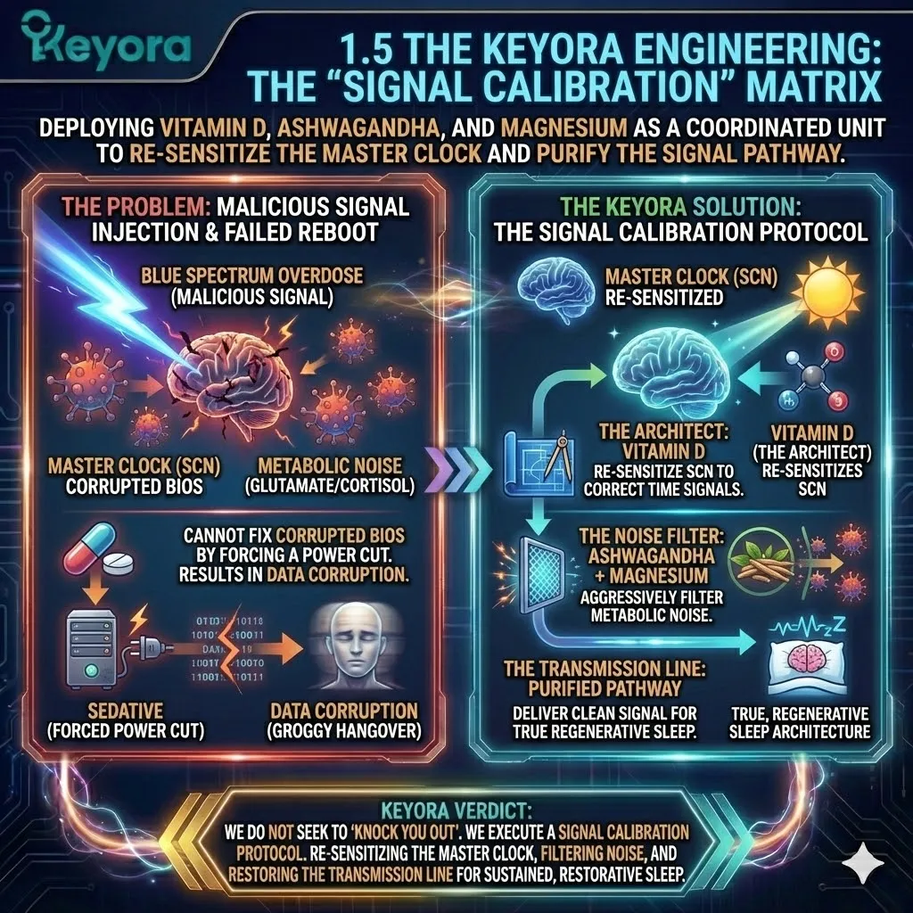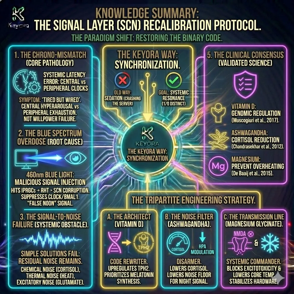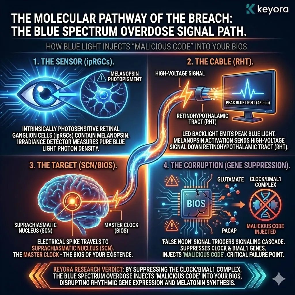 Correcting [The Blue Spectrum Overdose] – How the Keyora 8-in-1 Matrix Engineers a “Signal-to-Noise” Optimization to Restore SCN Gene Expression and Global Synchronization.
