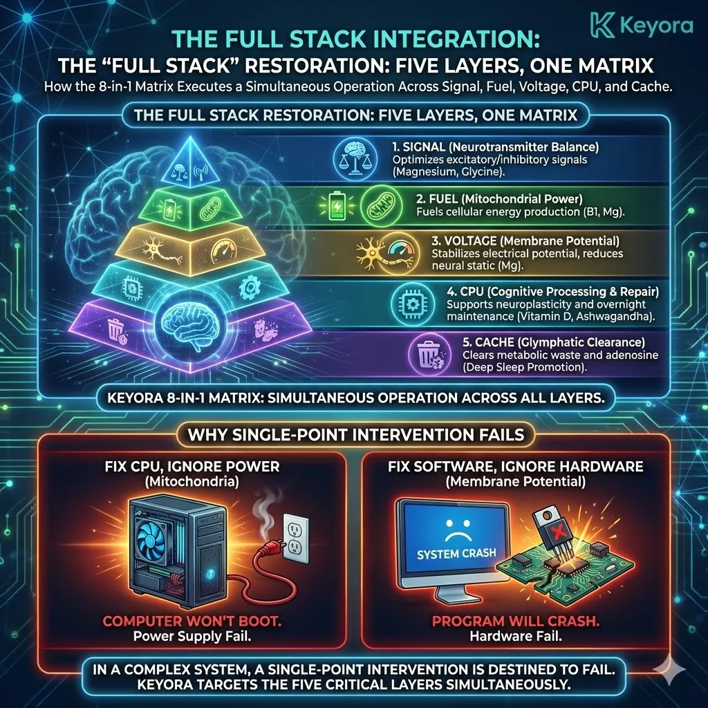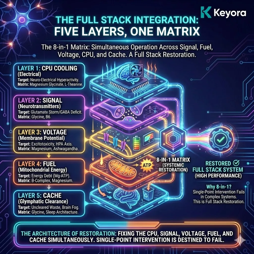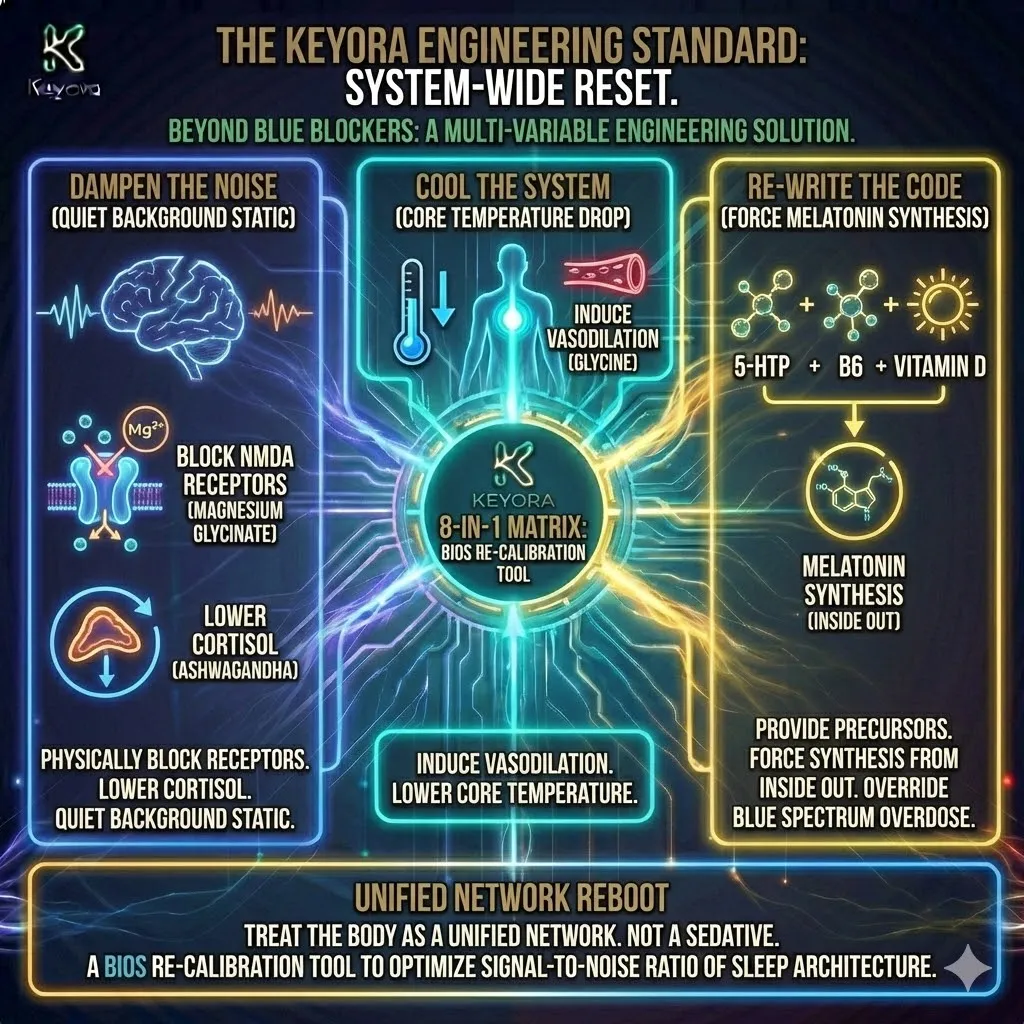 The Keyora 8-in-1 Matrix is designed as a Full Stack Solution. It targets the five critical layers of the Tech-Nocturnal pathology simultaneously.