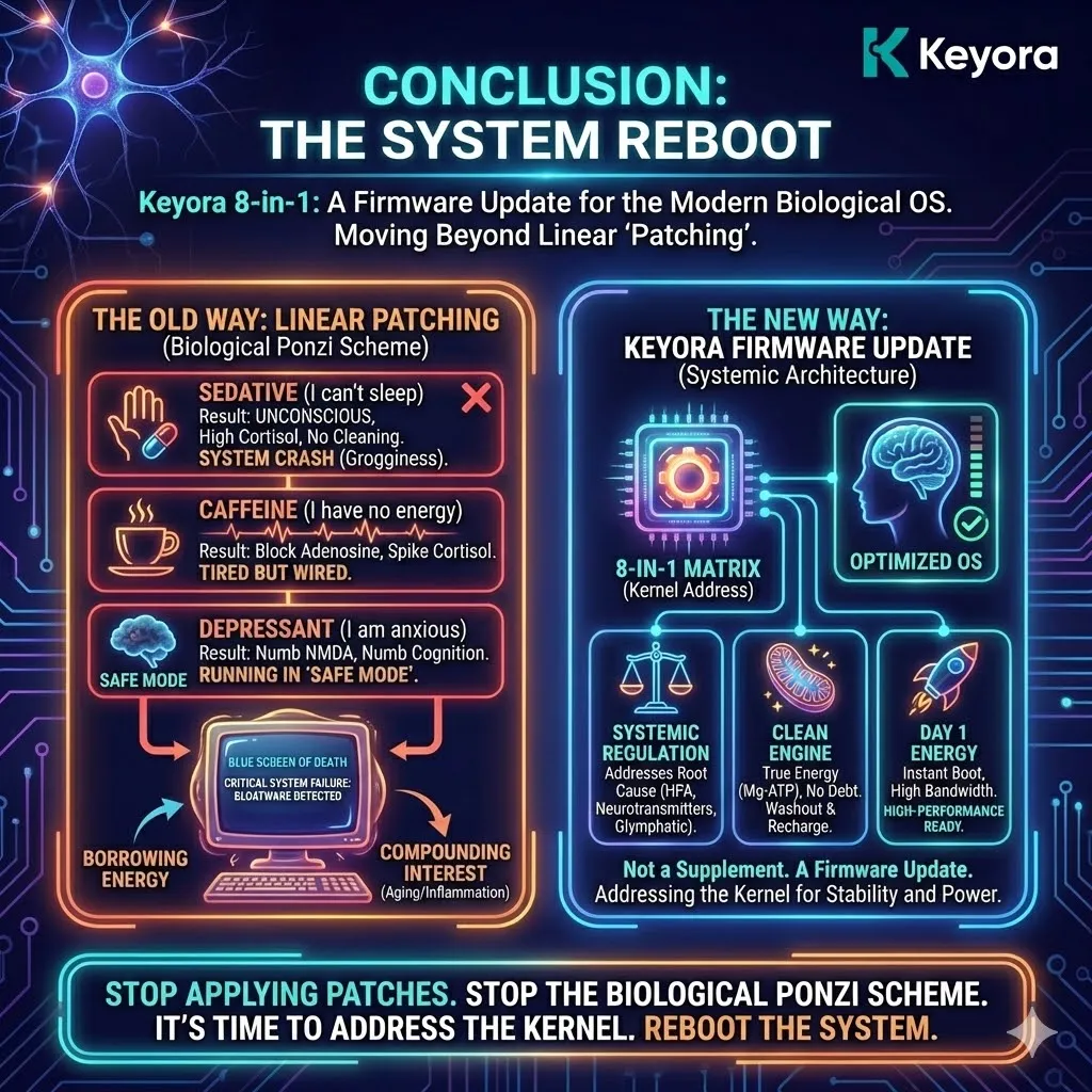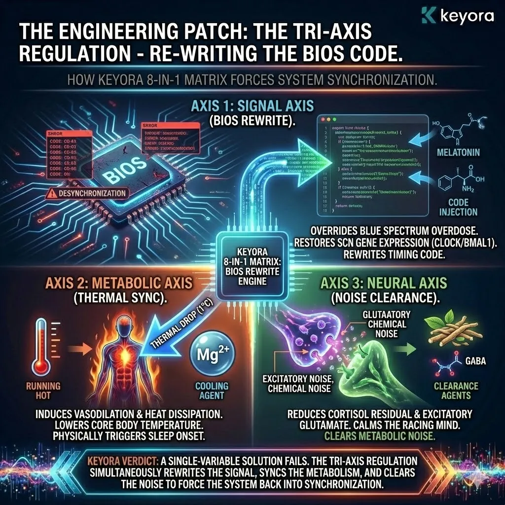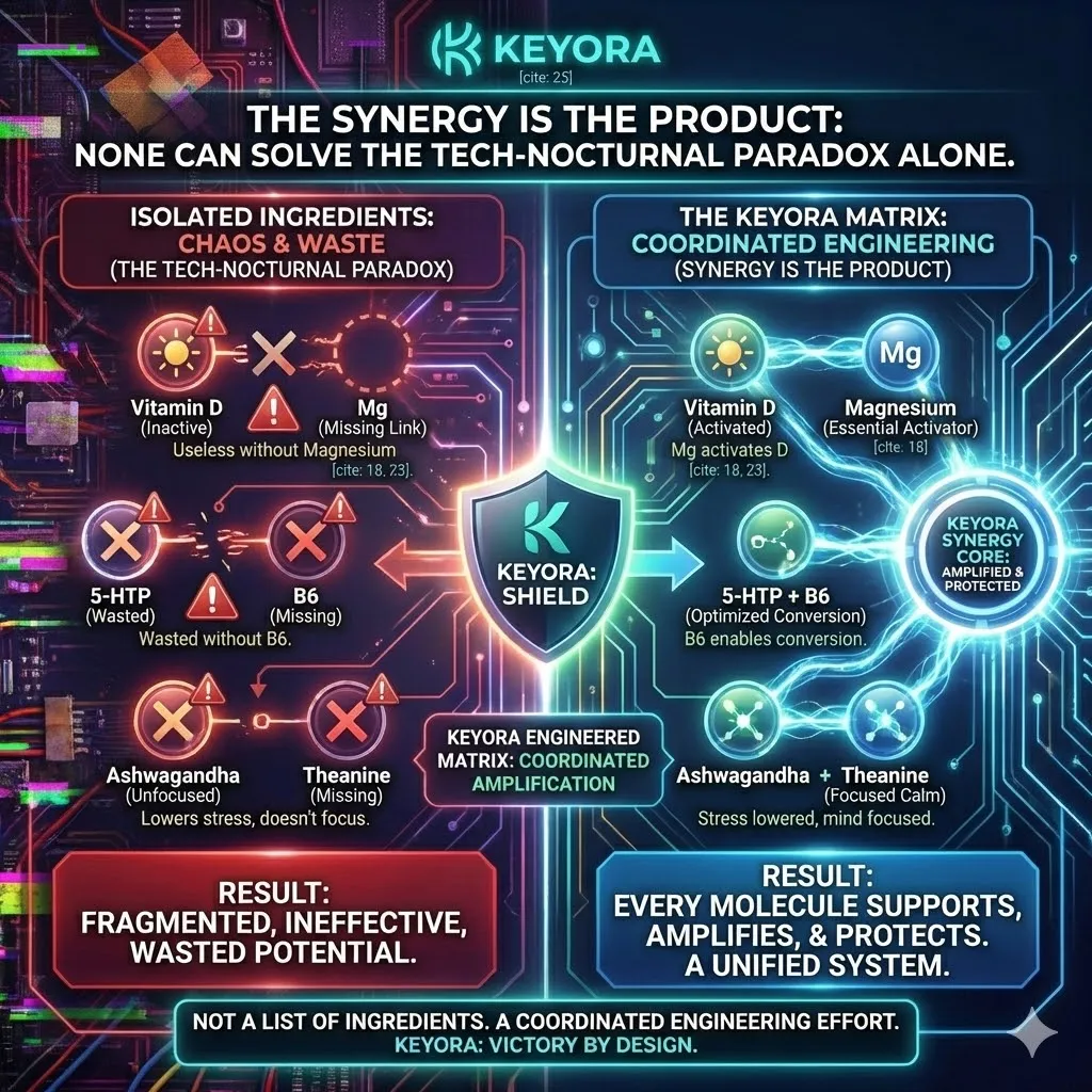 The Keyora 8-in-1 Matrix is designed as a Full Stack Solution. It targets the five critical layers of the Tech-Nocturnal pathology simultaneously.
