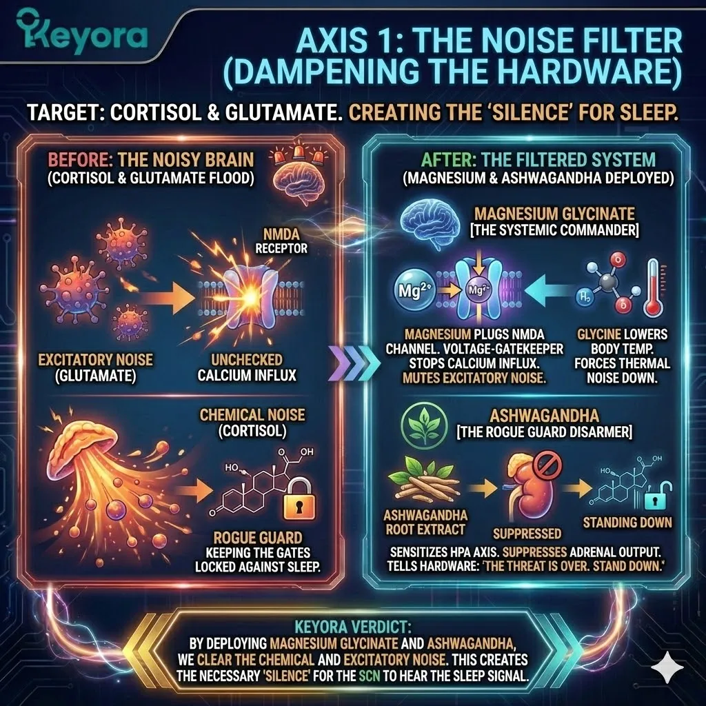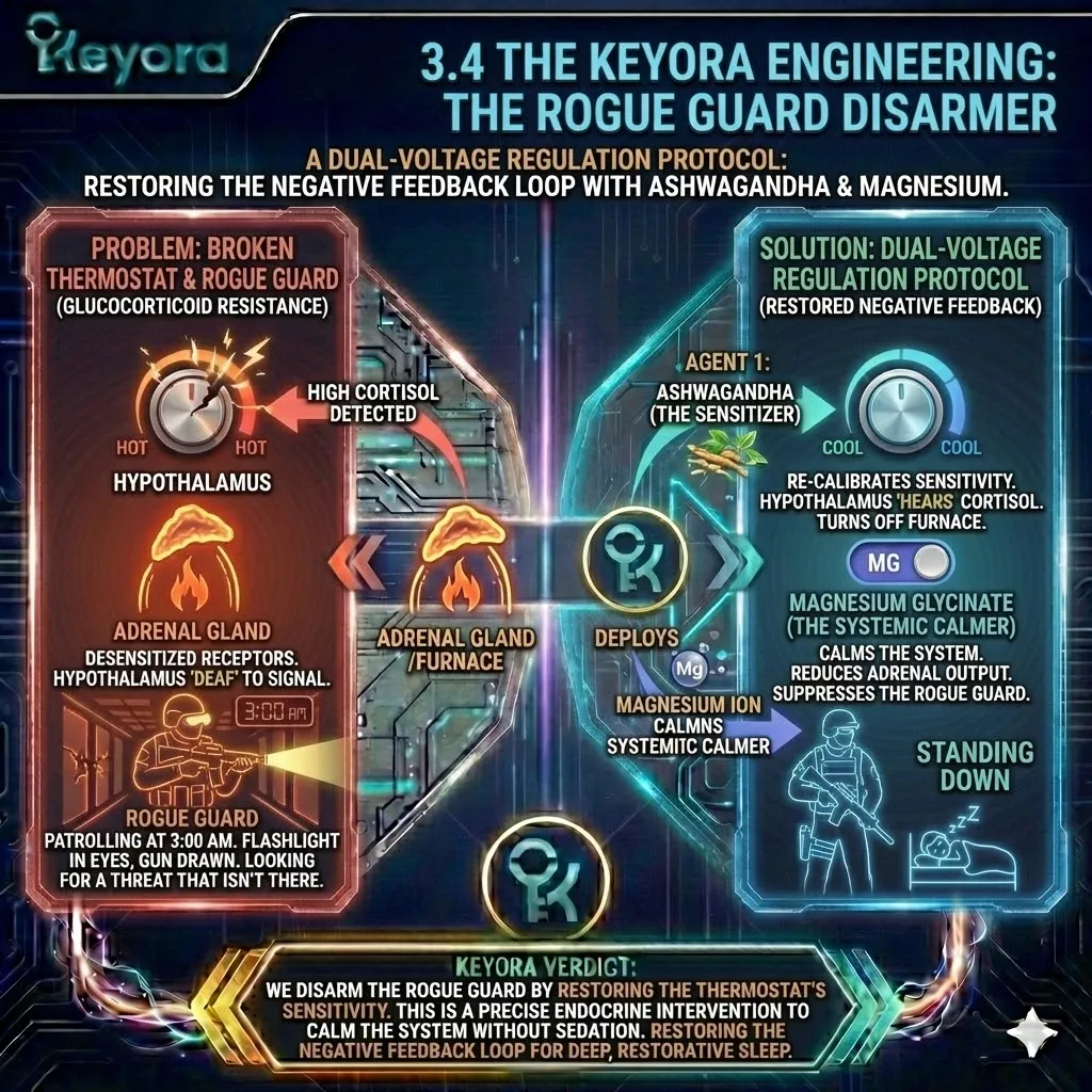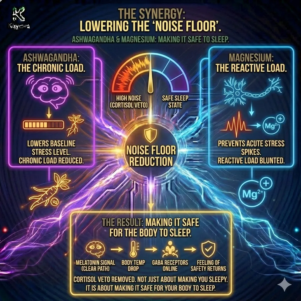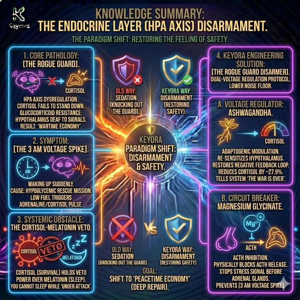 The Mechanism: Ashwagandha acts as the Voltage Regulator, re-sensitizing the feedback loop to lower the “Noise Floor” (Cortisol). Magnesium acts as the Circuit Breaker, blocking the ACTH signal at the source. Together, they execute The Rogue Guard Disarmament, lifting the veto and creating the safety required for sleep.