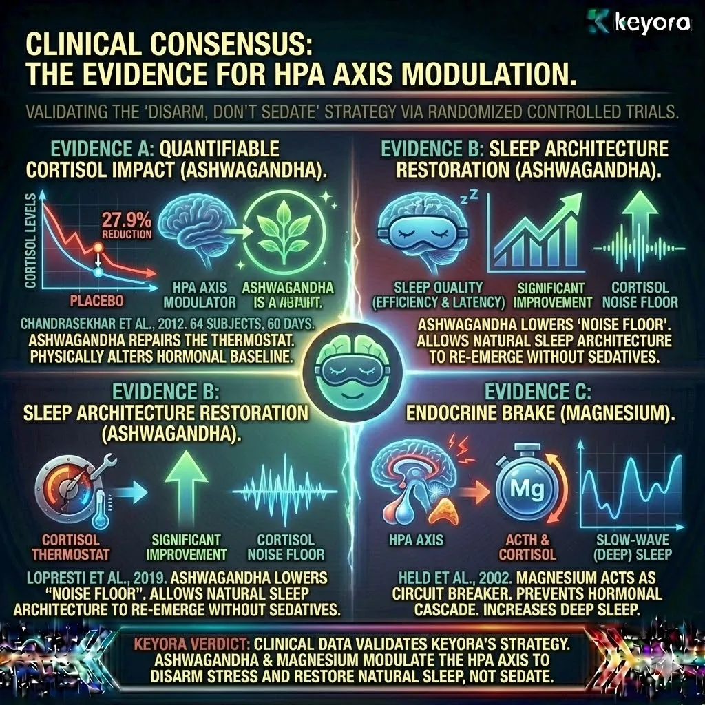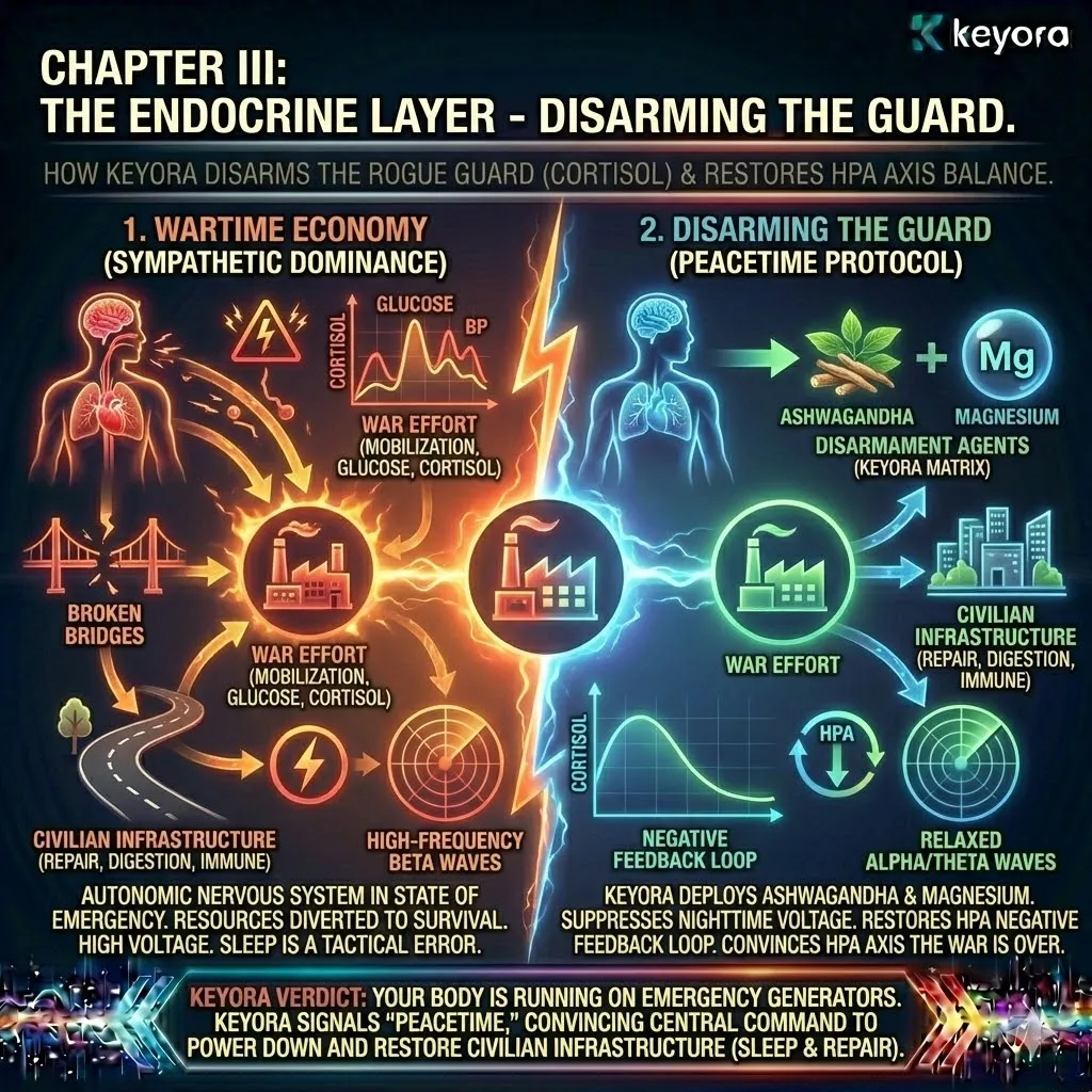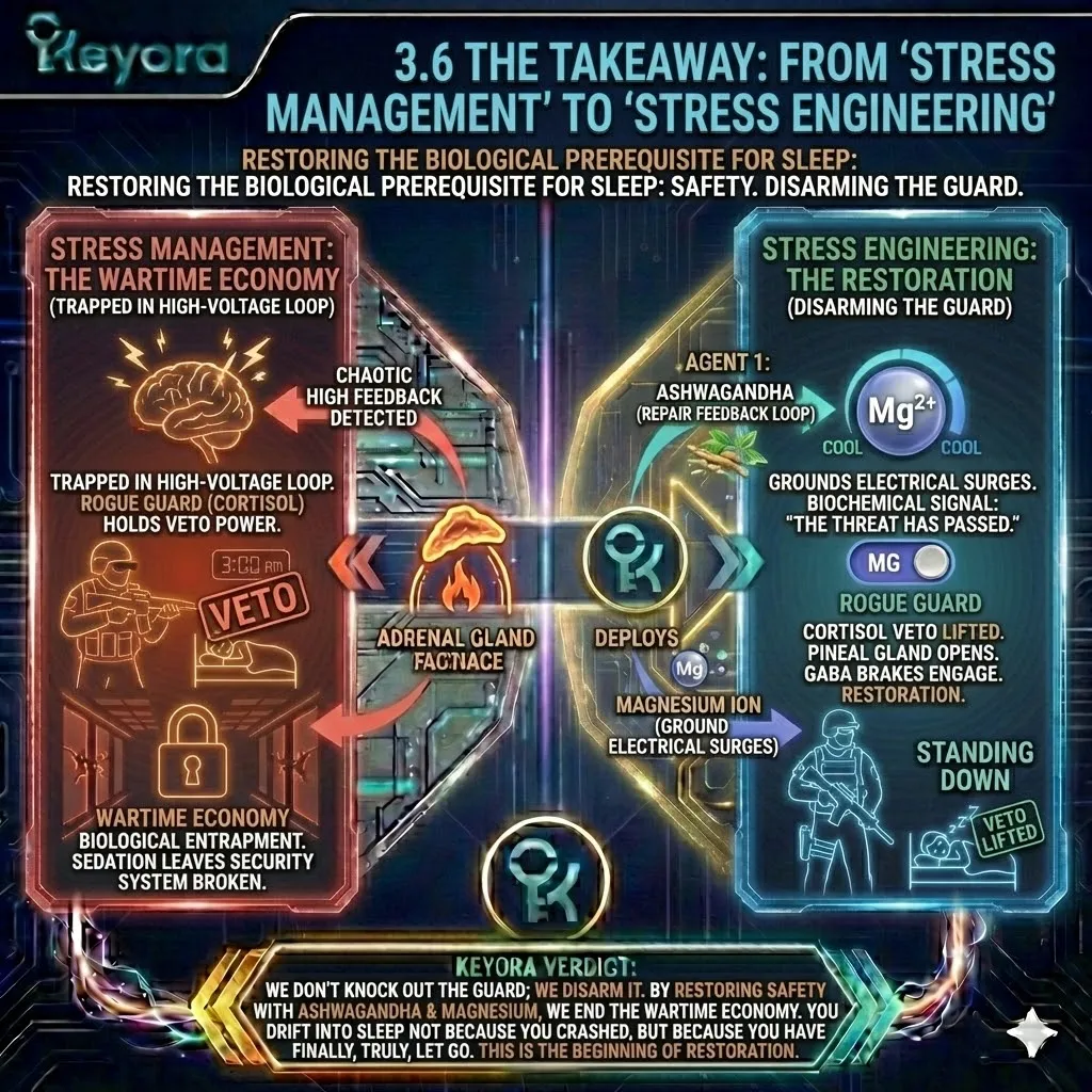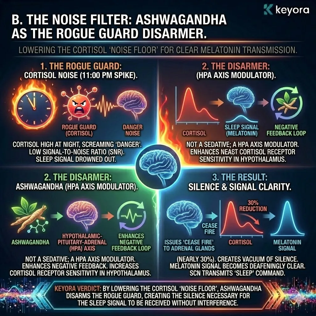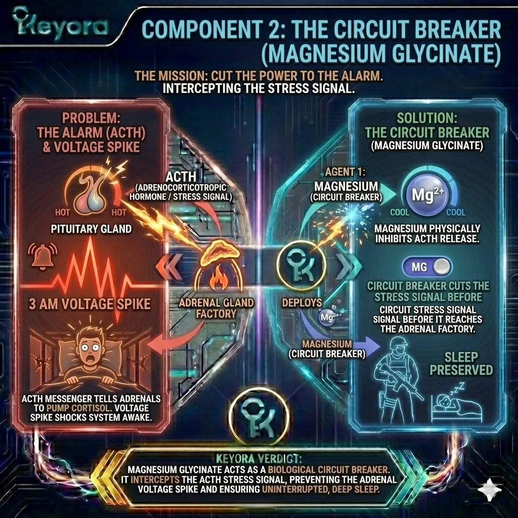 The Mechanism: Ashwagandha acts as the Voltage Regulator, re-sensitizing the feedback loop to lower the “Noise Floor” (Cortisol). Magnesium acts as the Circuit Breaker, blocking the ACTH signal at the source. Together, they execute The Rogue Guard Disarmament, lifting the veto and creating the safety required for sleep.
