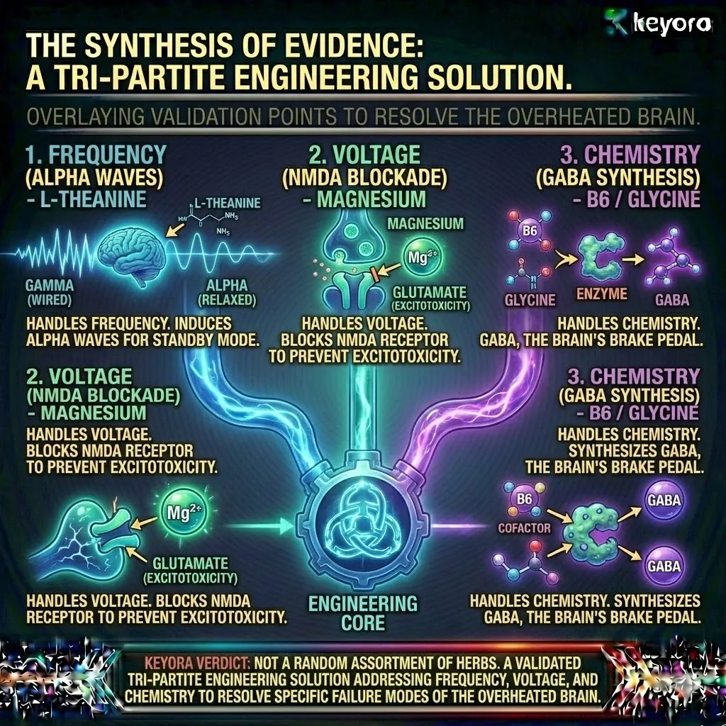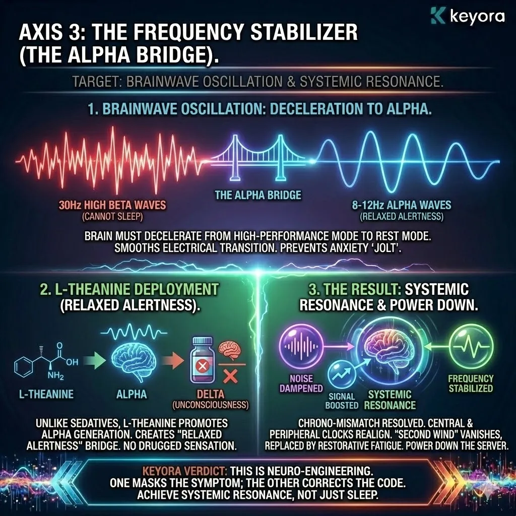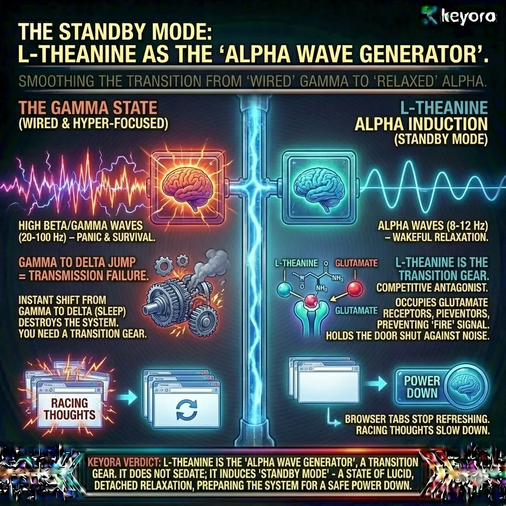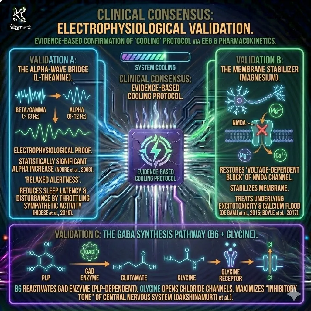 The Mechanism: Magnesium physically plugs the NMDA channel, stopping the Calcium flood. L-Theanine induces Alpha Waves, shifting the brain from “Overclocked Beta” to “Standby Mode.” This executes the Thermal Throttling protocol – a graceful shutdown rather than a forced crash.