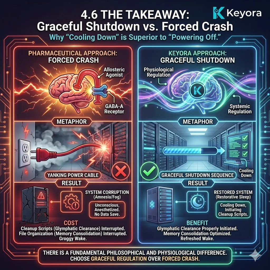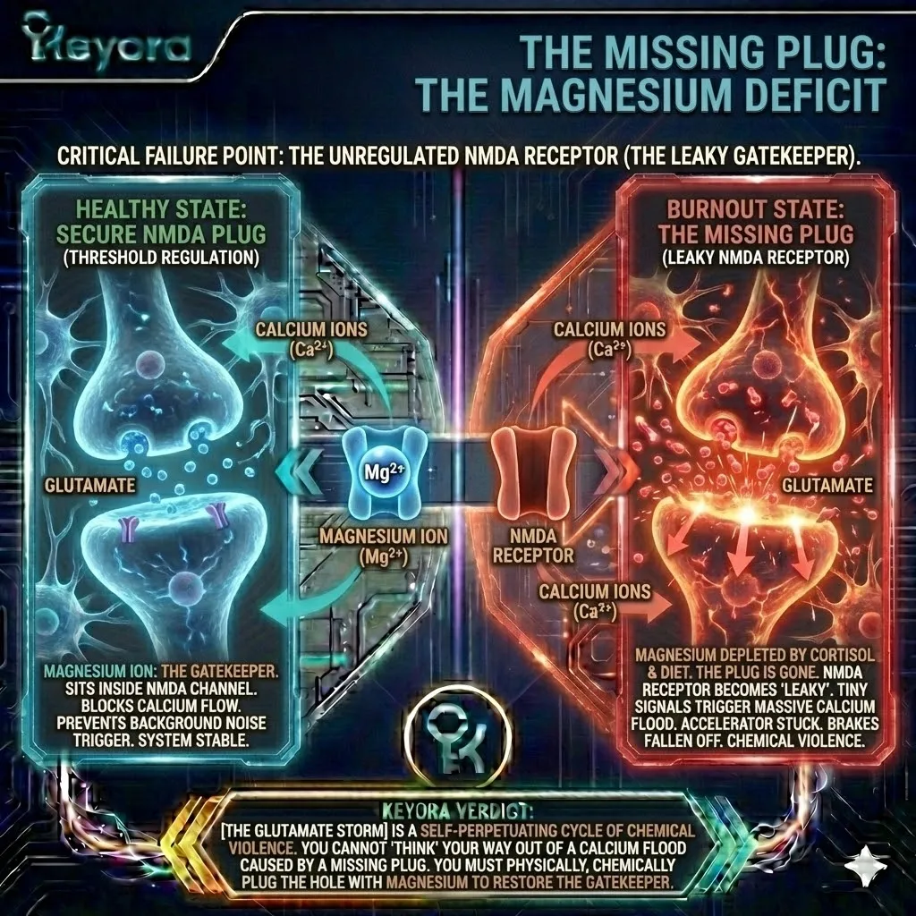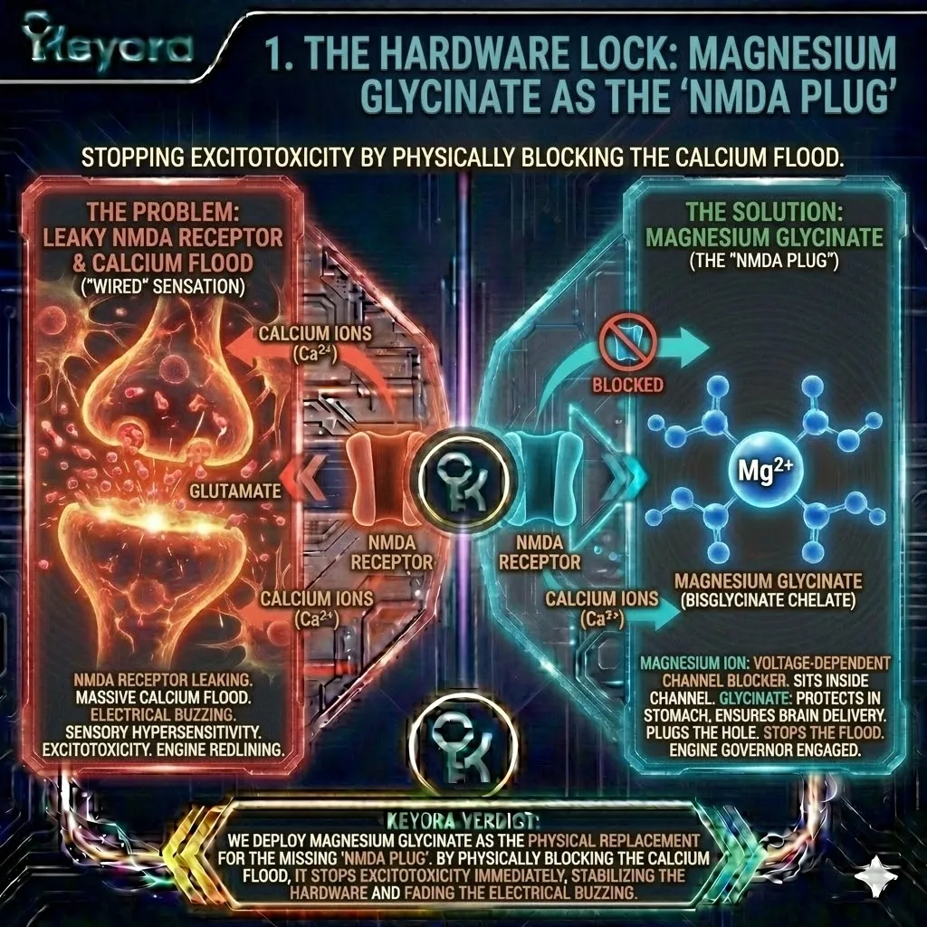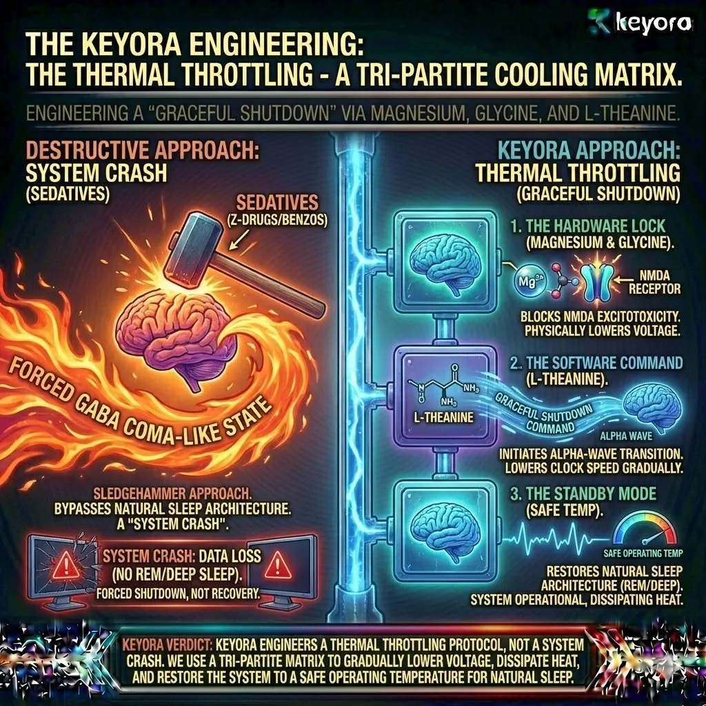 The Mechanism: Magnesium physically plugs the NMDA channel, stopping the Calcium flood. L-Theanine induces Alpha Waves, shifting the brain from “Overclocked Beta” to “Standby Mode.” This executes the Thermal Throttling protocol – a graceful shutdown rather than a forced crash.