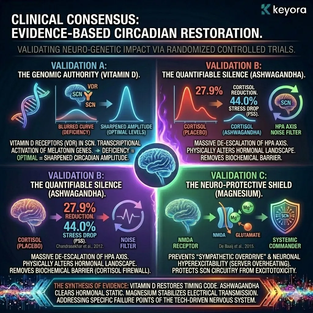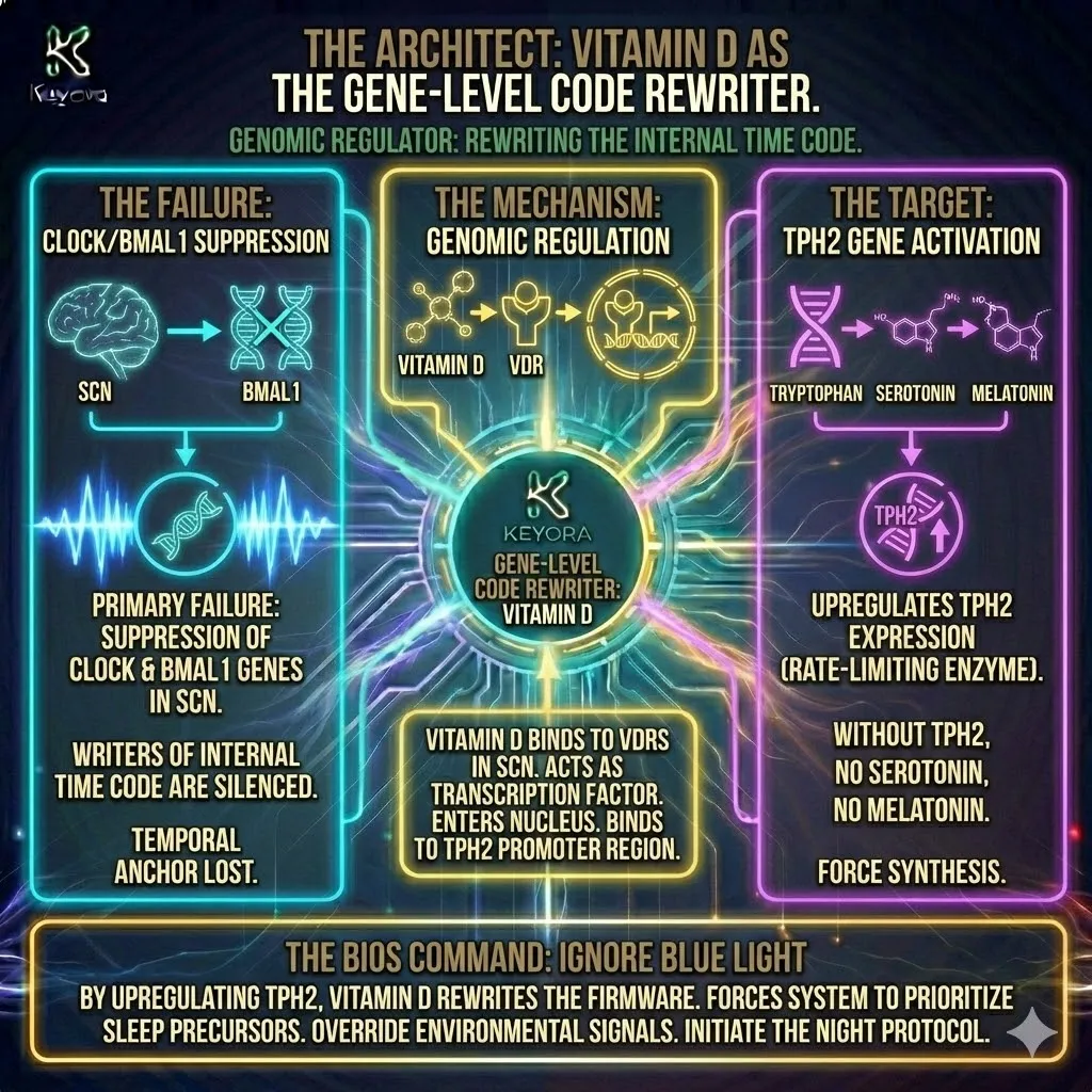 The Mechanism: Vitamin D acts as the Architect. It binds to VDRs in the SCN, upregulating TPH2 expression. It physically rewrites the timing code, telling the system: “The solar cycle has ended. Initiate the Night Protocol.” It restores the Binary Code of Day and Night.