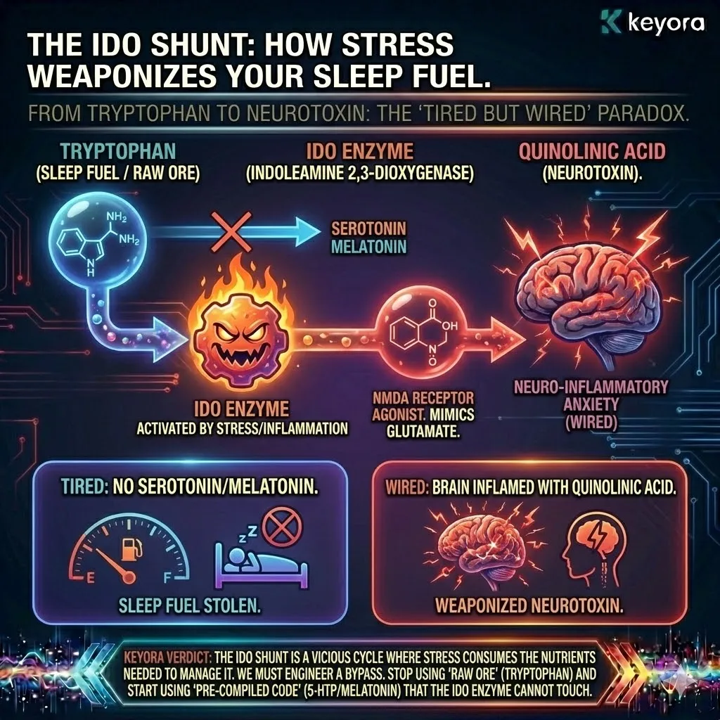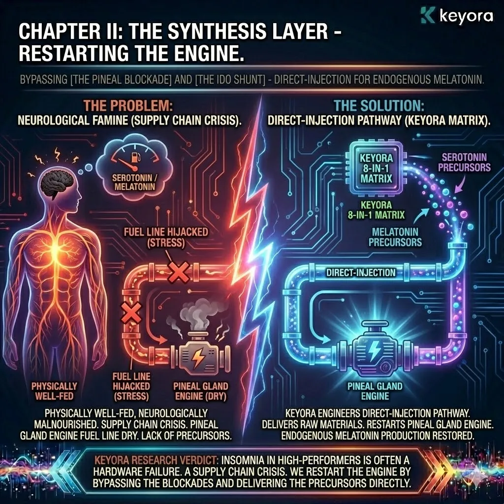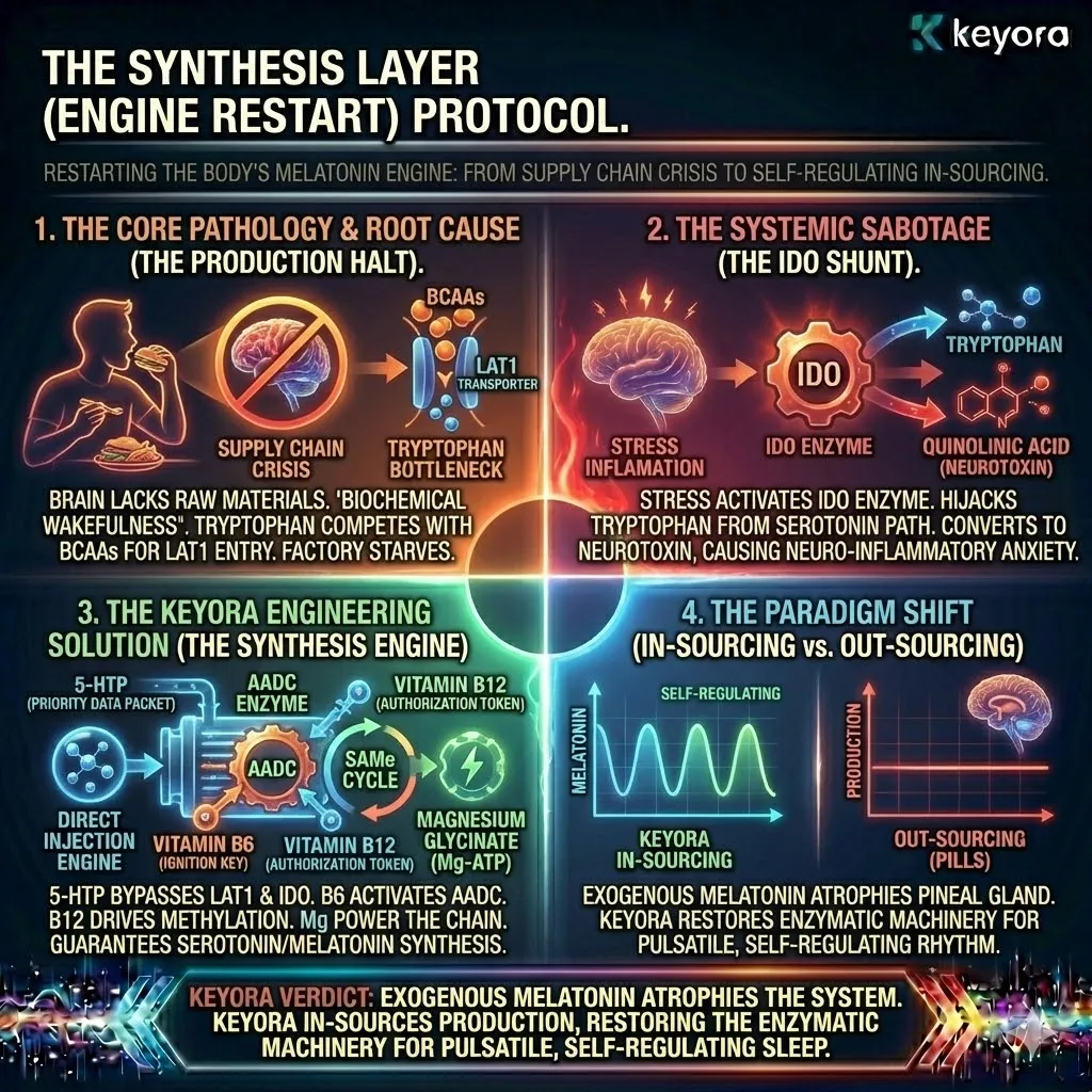 The Problem: The Production Halt. The brain wants to make Melatonin, but [The Tryptophan Bottleneck] and The IDO Shunt have cut off the supply of raw materials.