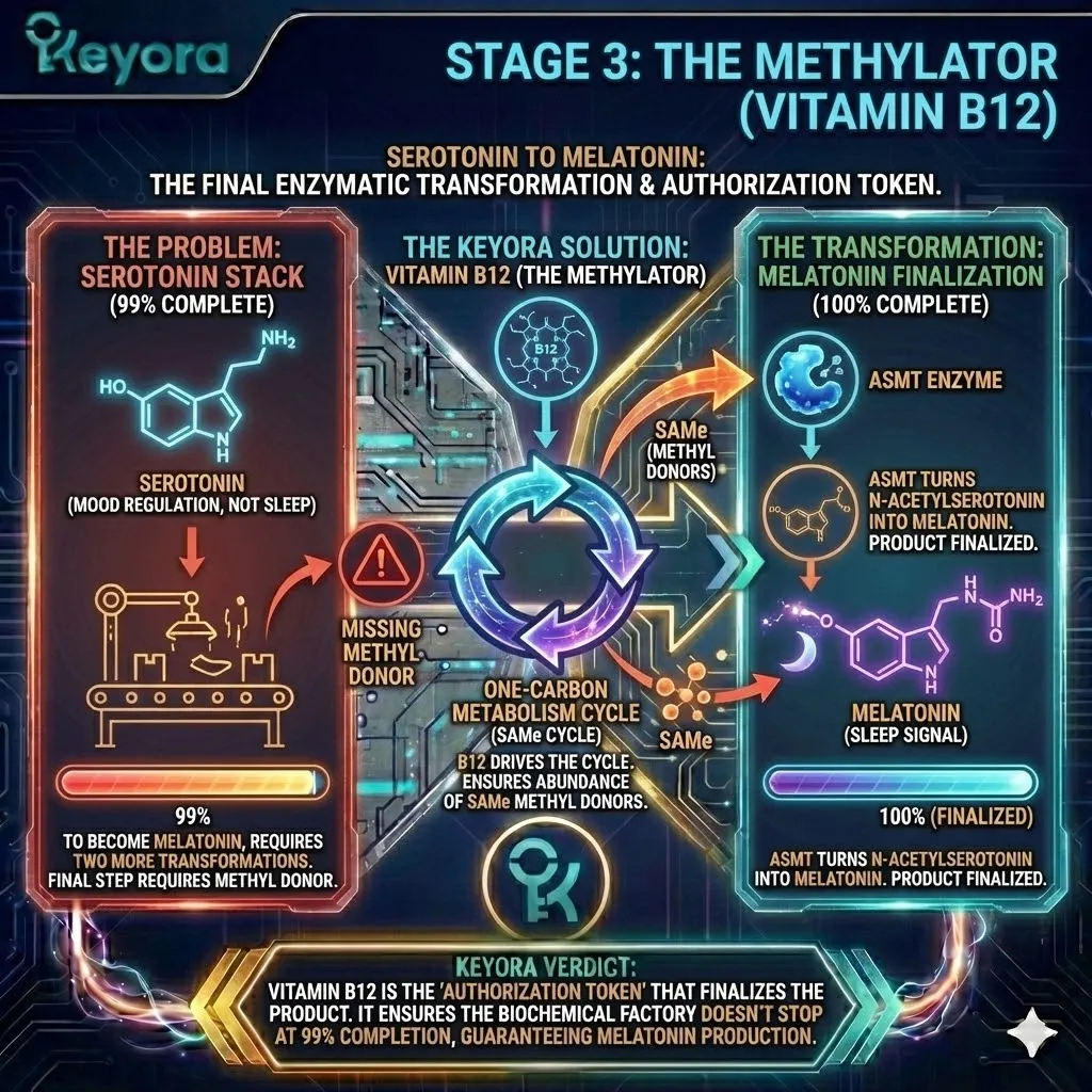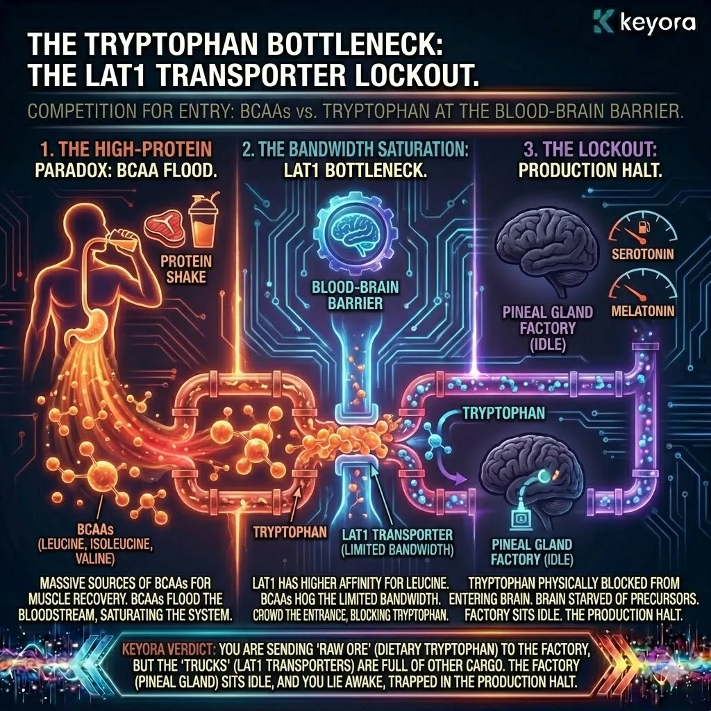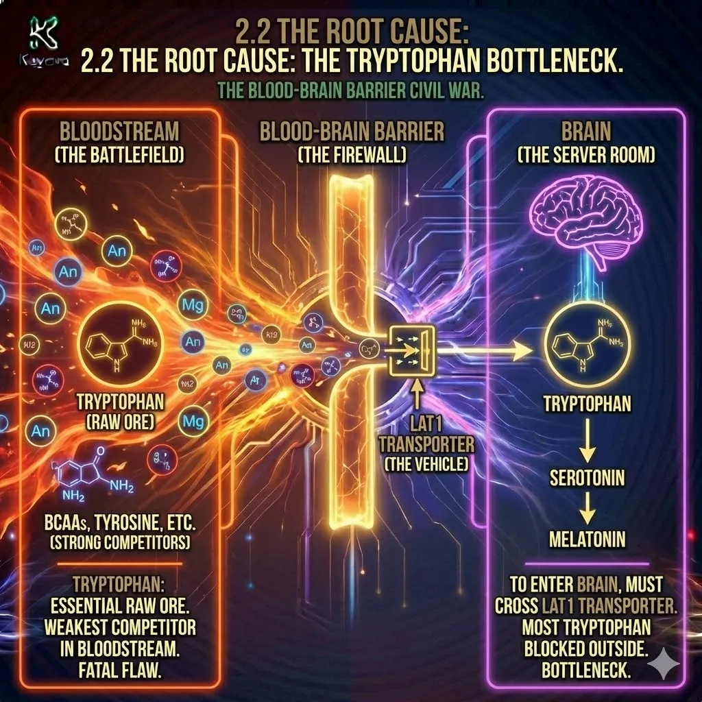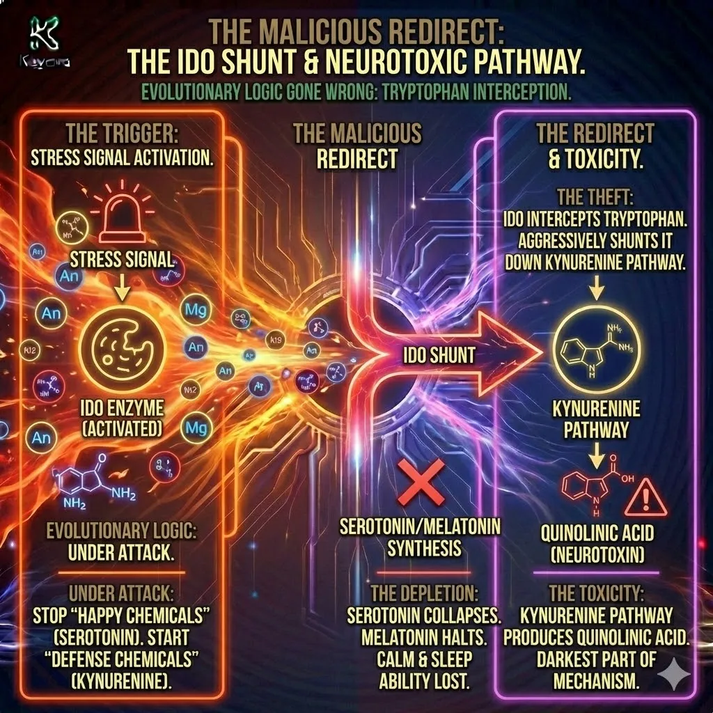 The Problem: The Production Halt. The brain wants to make Melatonin, but [The Tryptophan Bottleneck] and The IDO Shunt have cut off the supply of raw materials.