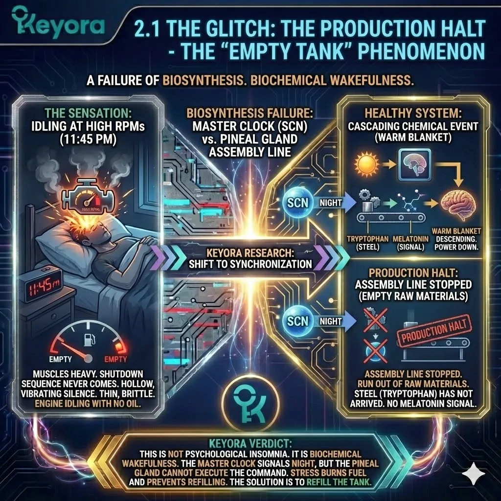 By 11:00 PM, your body has accumulated enough metabolic debt (Adenosine) to initiate sleep. Under natural laws, your Pineal Gland should be flooding your bloodstream with Melatonin, the hormonal “off-switch.”