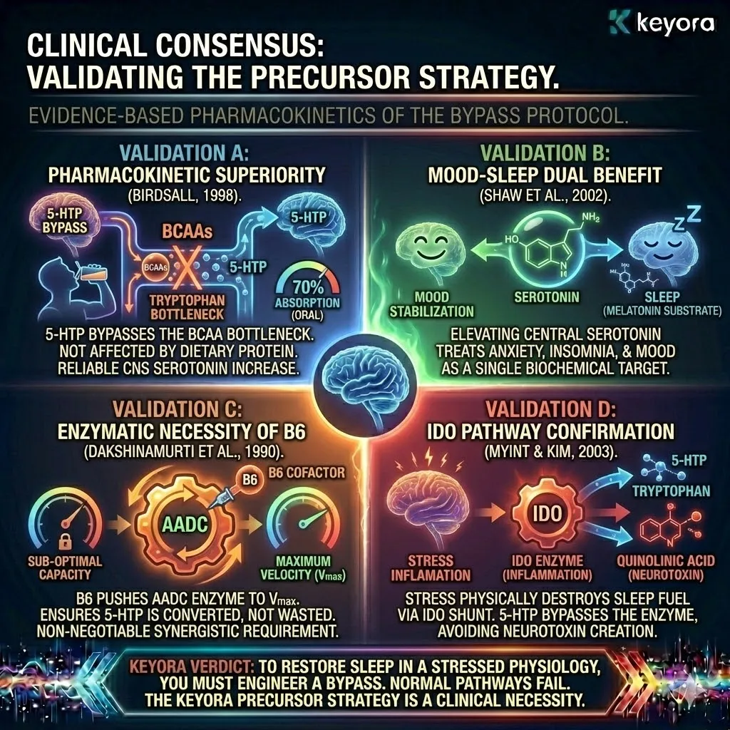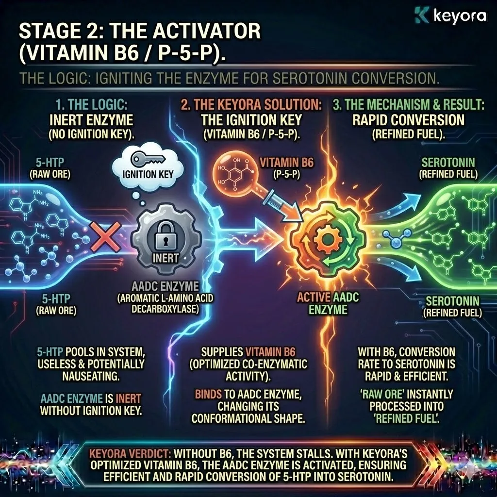 The Mechanism: 5-HTP bypasses the competitive transport blockade and the IDO enzyme hijacking. It is a “Priority Data Packet” delivered directly to the server room. Vitamin B6 acts as the “Ignition Key,” instantly converting that precursor into Serotonin. We do not hope for synthesis; we force it by supplying the rate-limiting reagents.