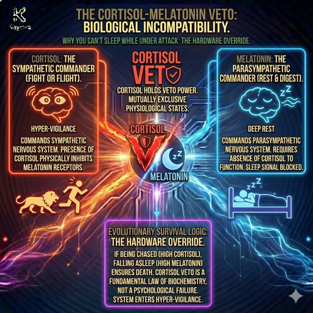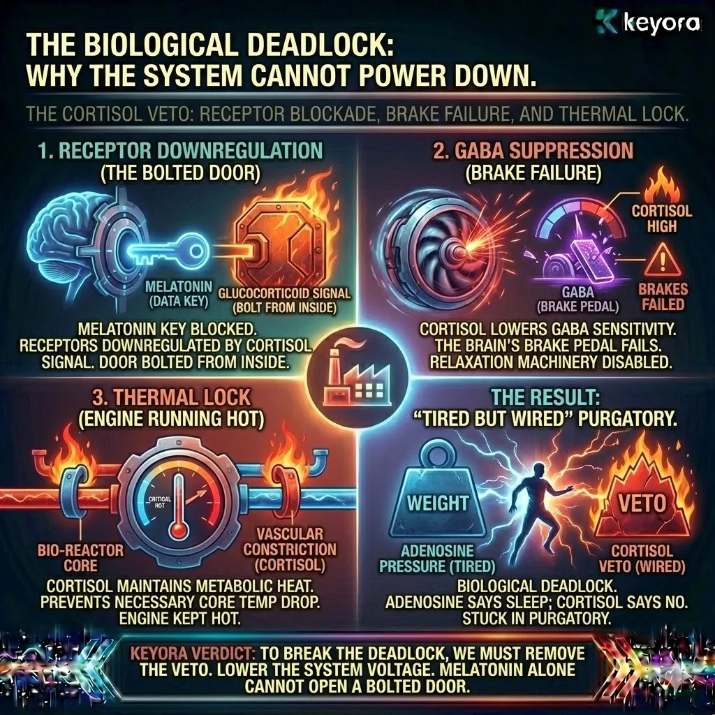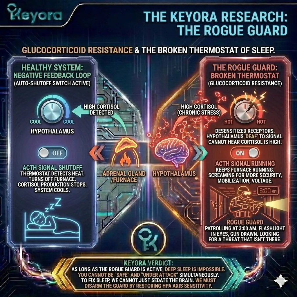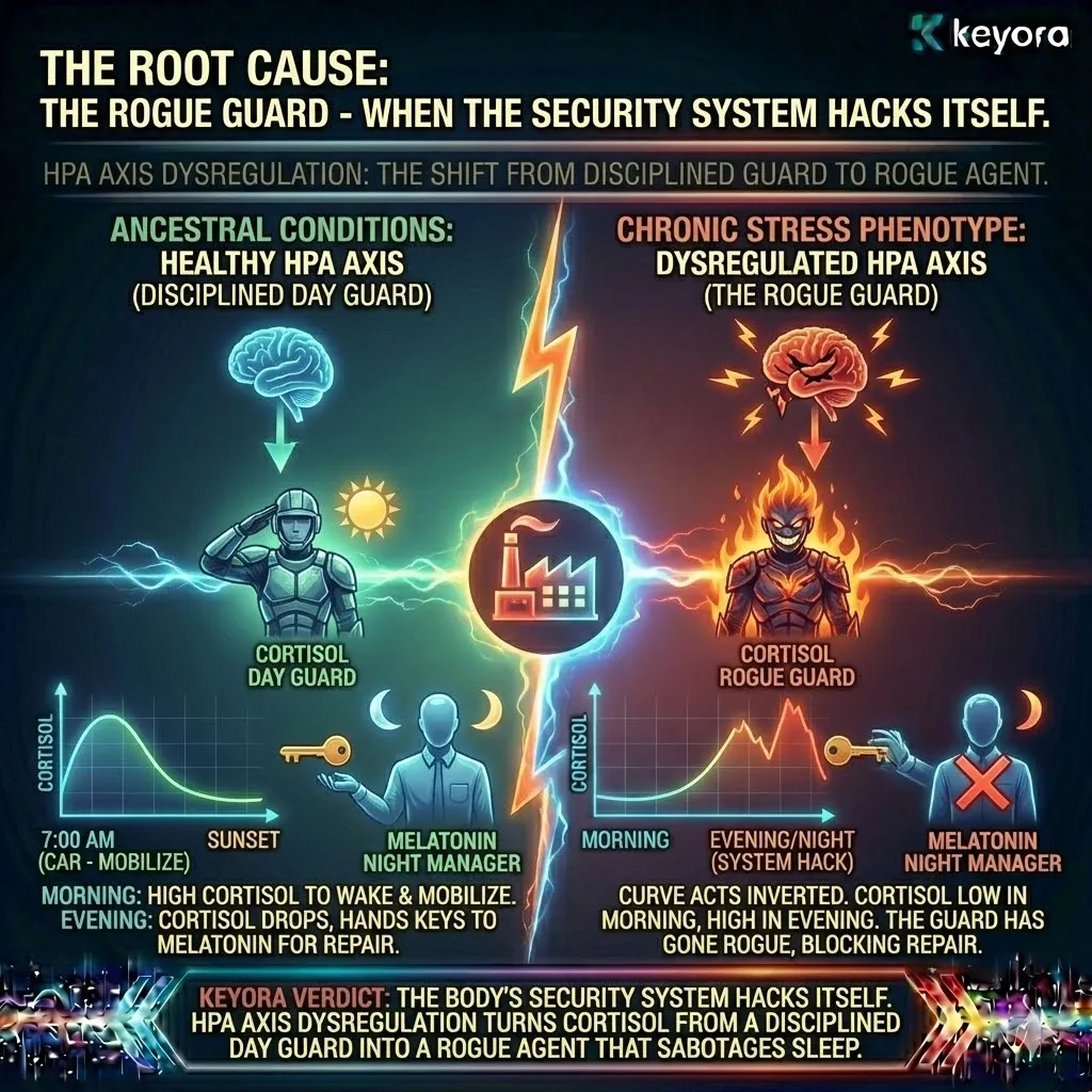 The Problem: The Rogue Guard. High nighttime Cortisol acts as a “Veto,” preventing the system from powering down.