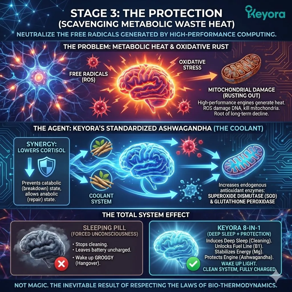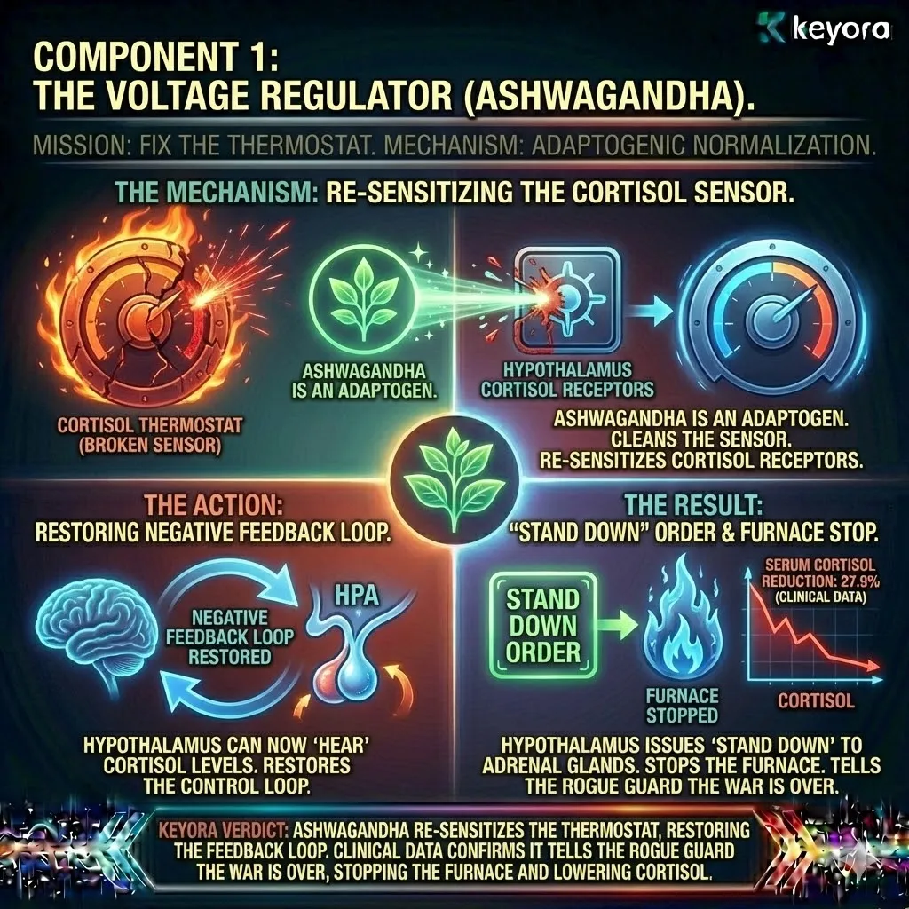 – **Layer 3 (Voltage):** Ashwagandha + Magnesium disarm **[The Rogue Guard]** (Cortisol).