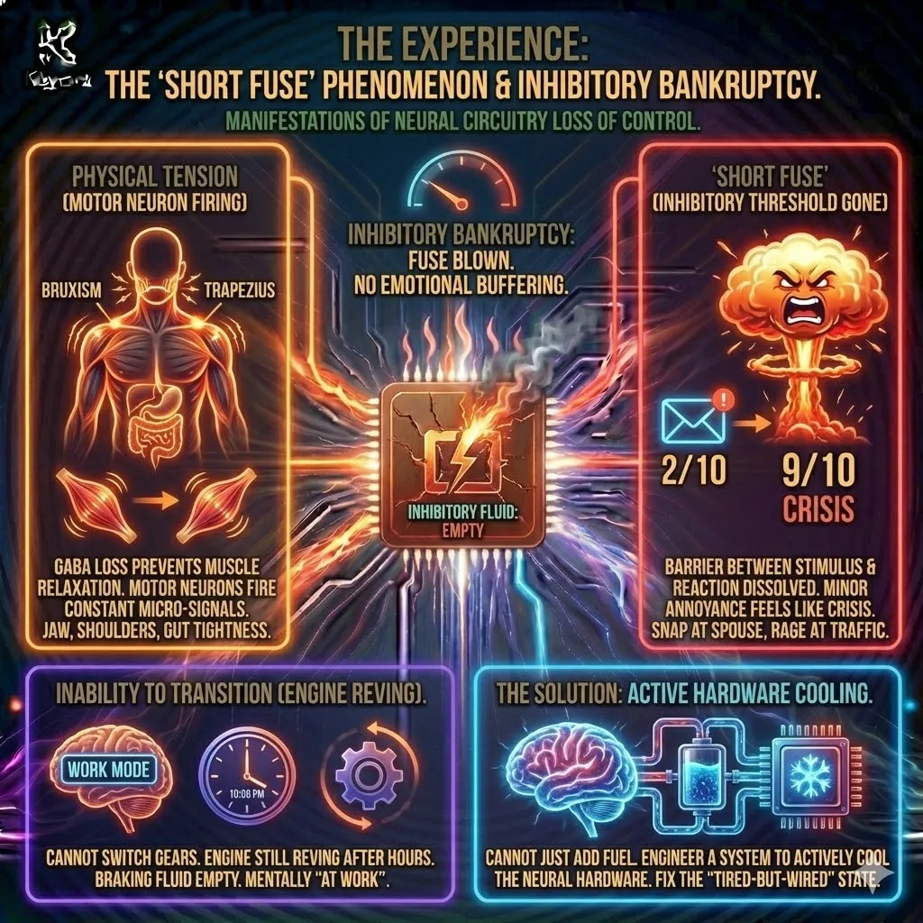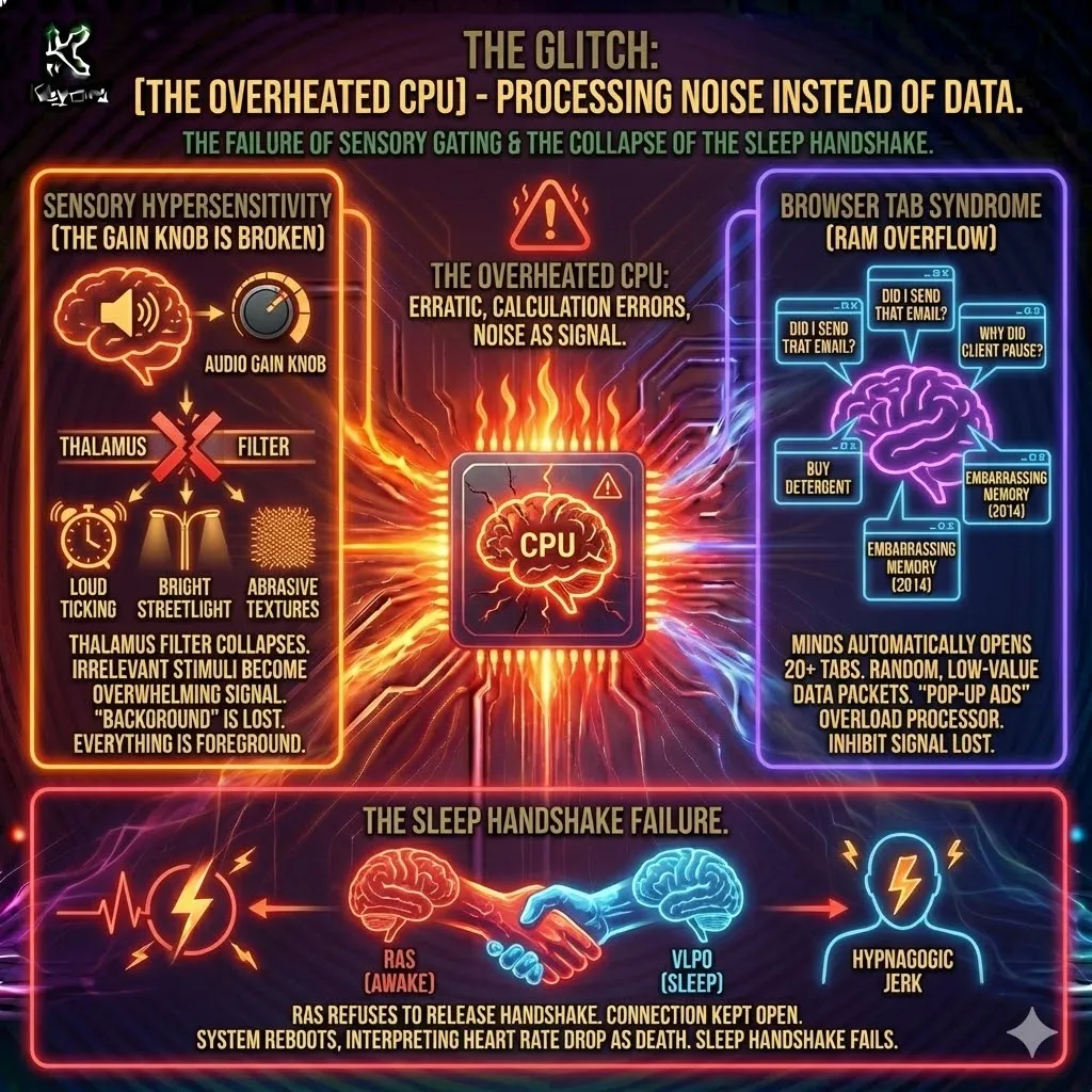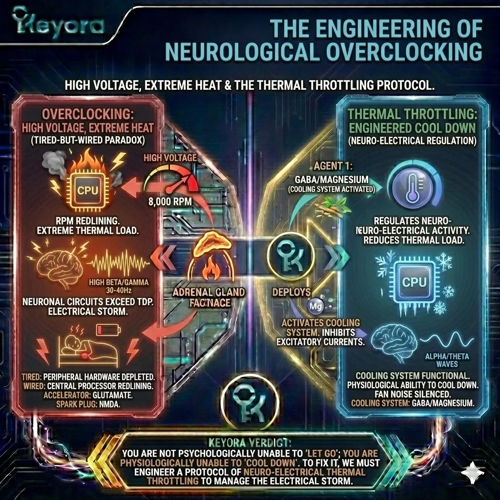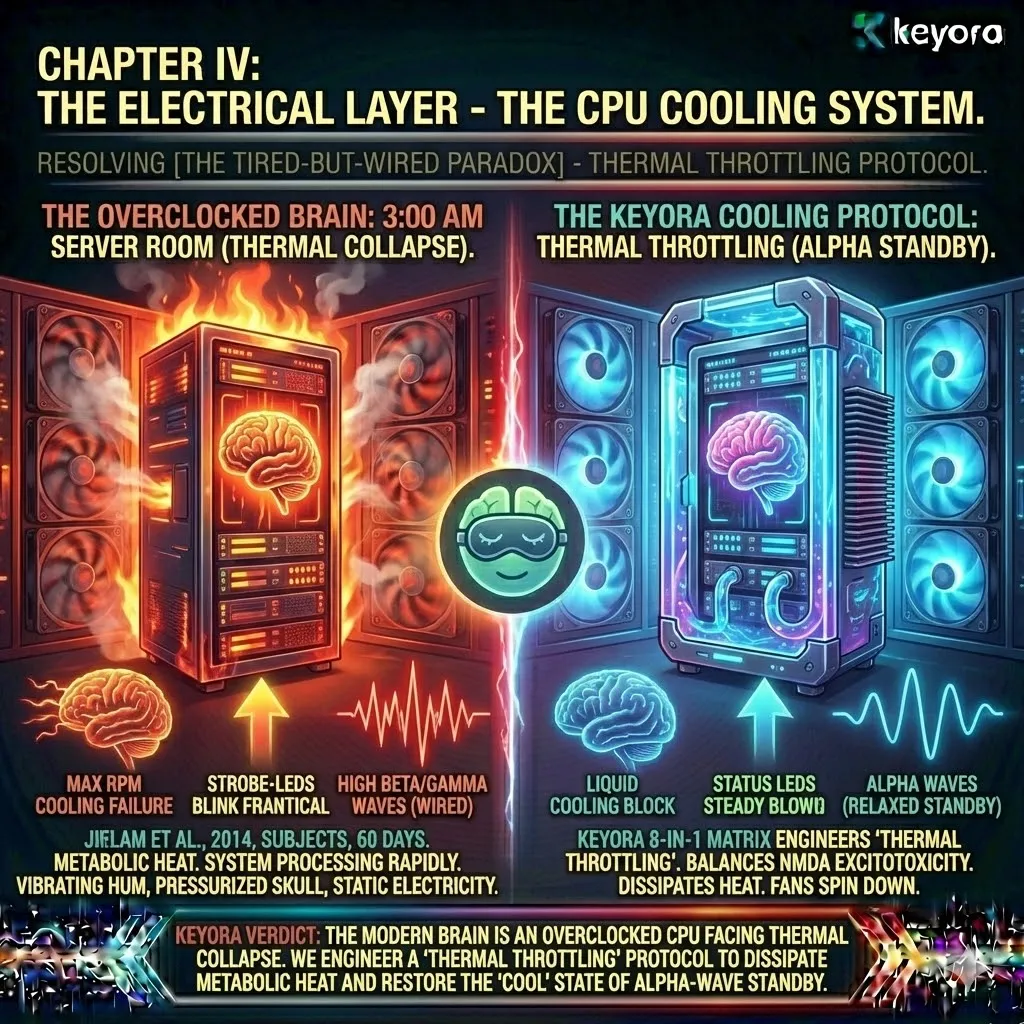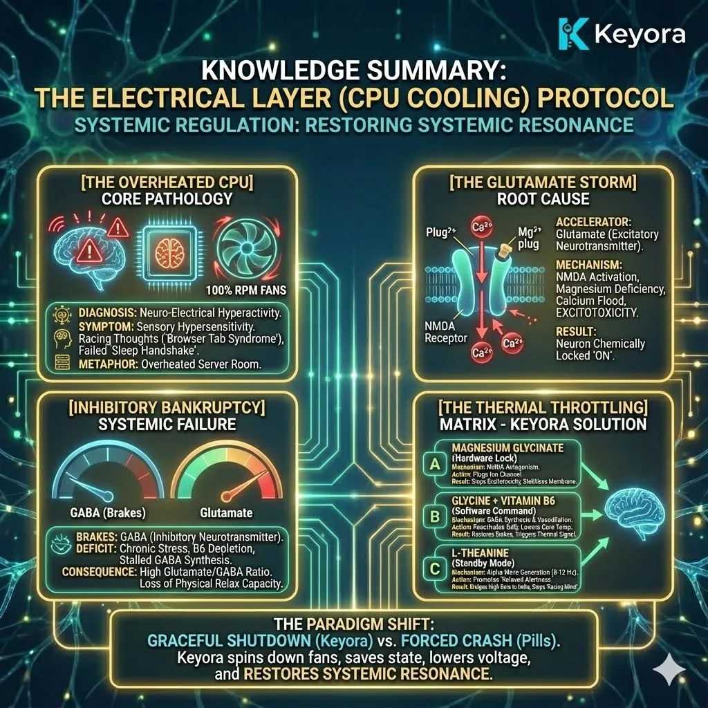 – **Layer 4 (CPU):** L-Theanine + Magnesium execute **[Thermal Throttling]** to cool the electrical storm.