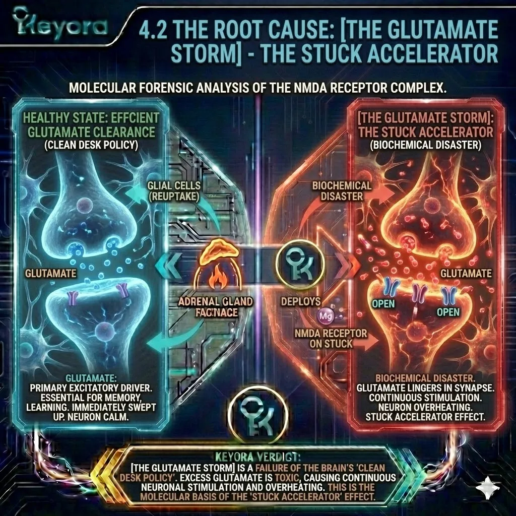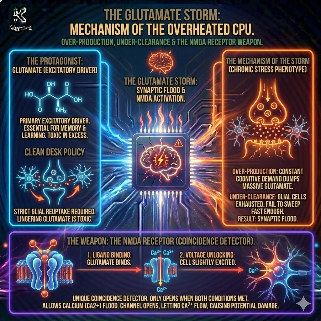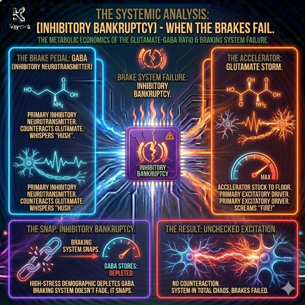 The Problem: The Glutamate Storm. The neurons are overheating due to NMDA excitotoxicity. The “Brakes” (GABA) have failed ([Inhibitory Bankruptcy]).