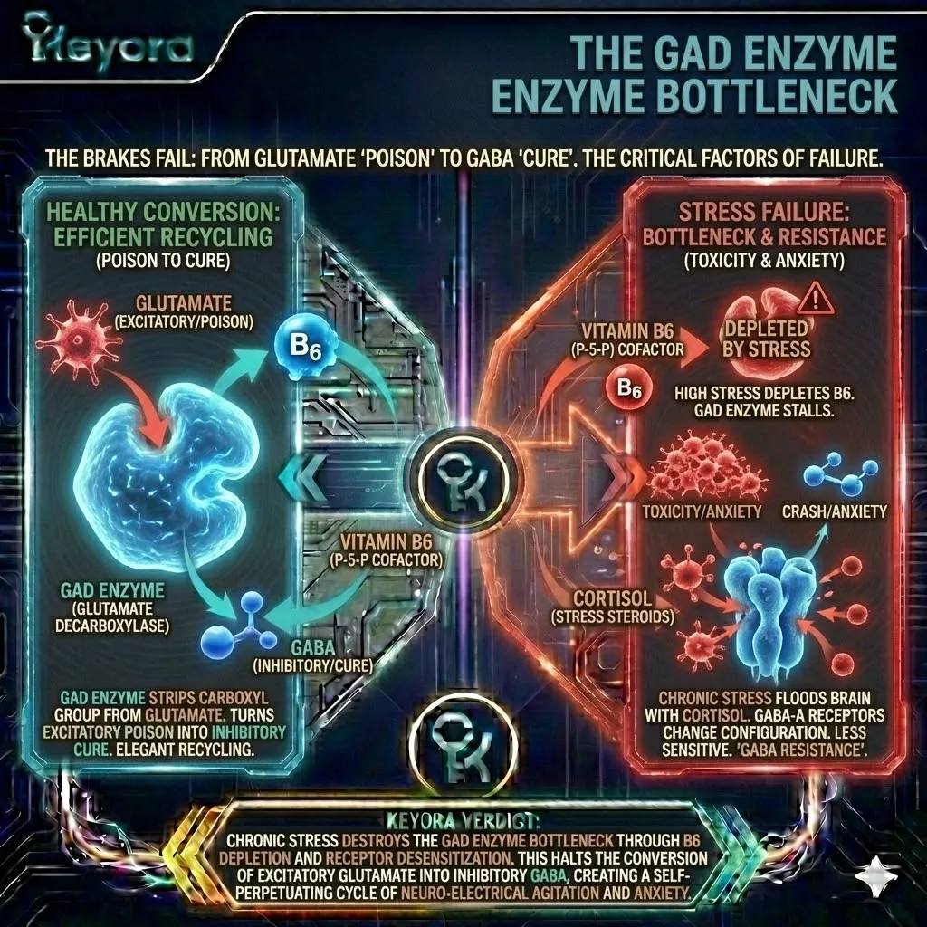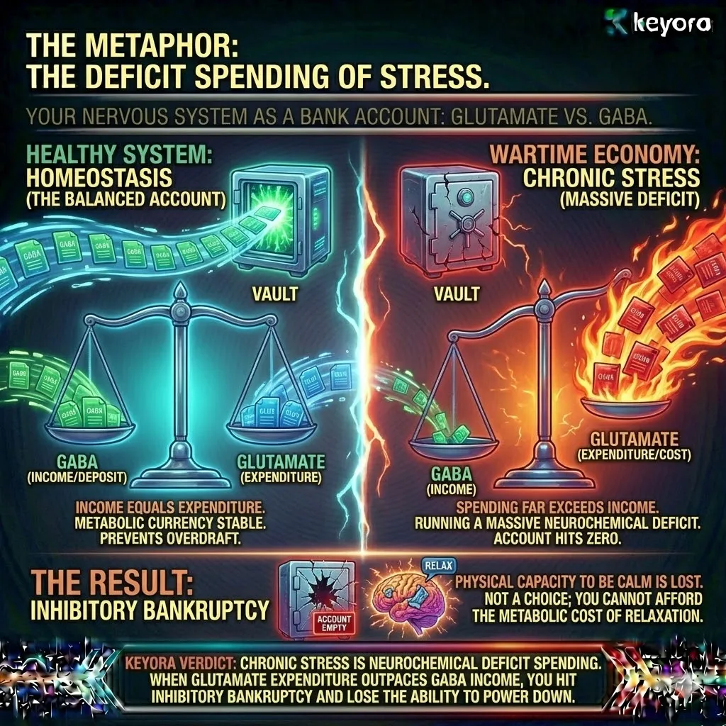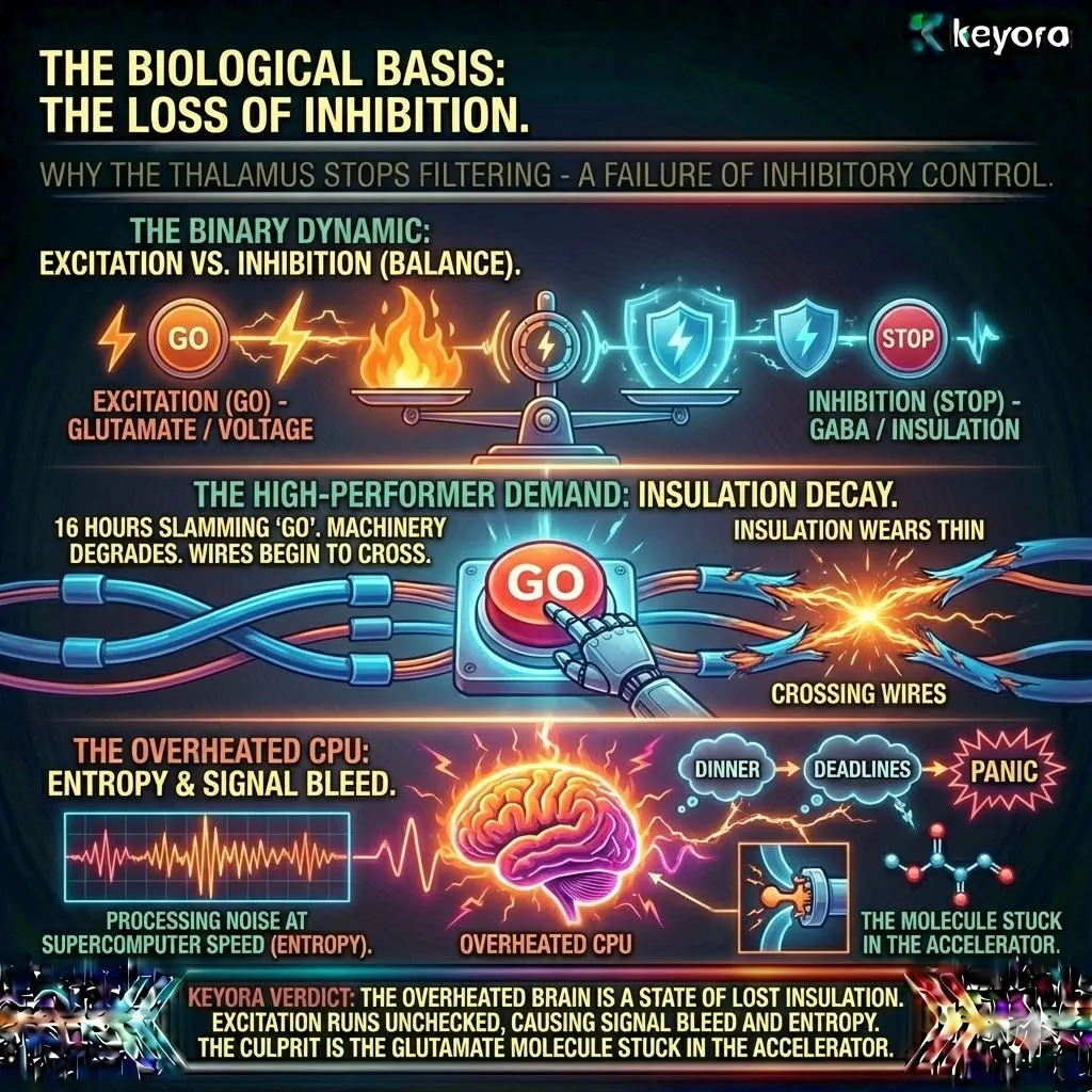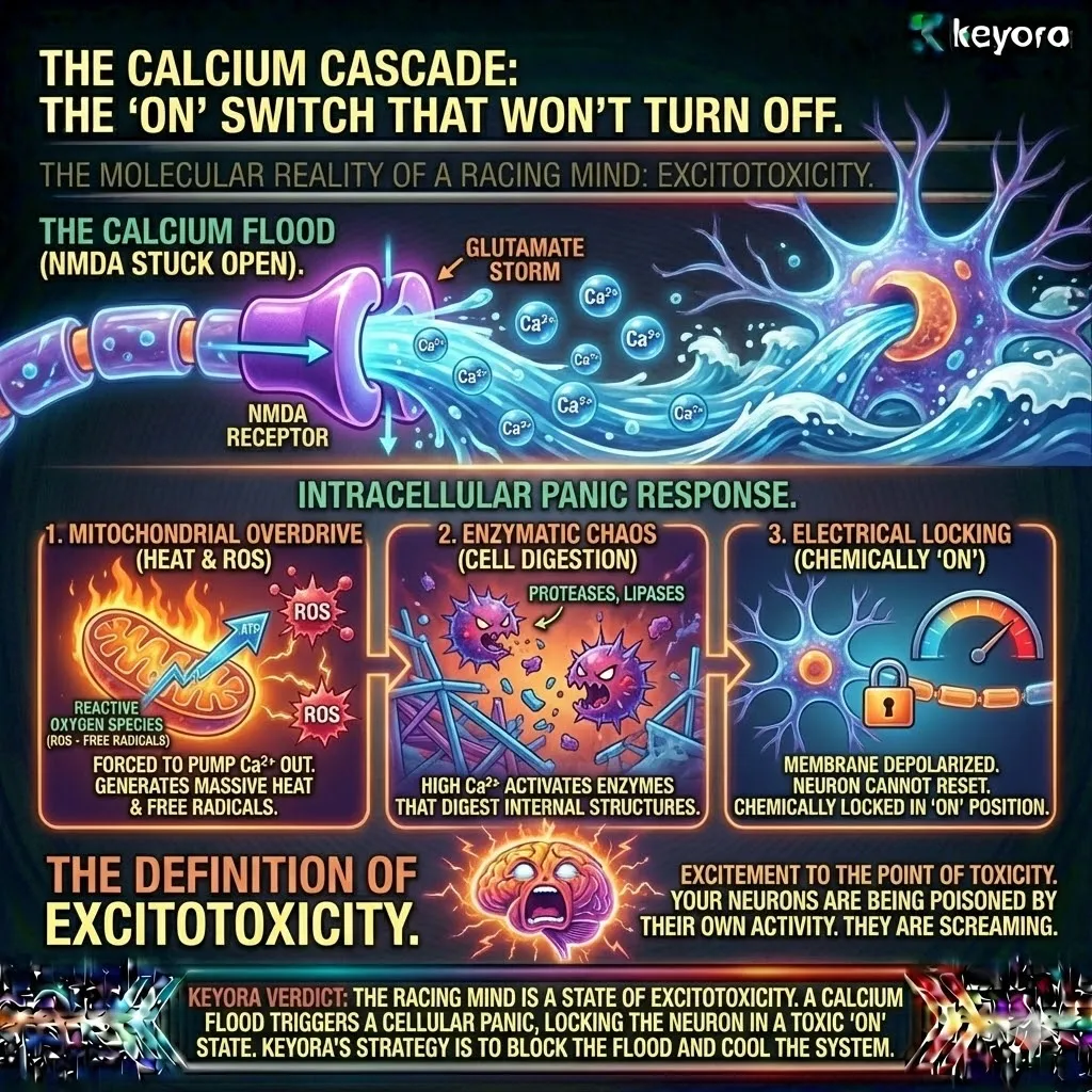 The Problem: The Glutamate Storm. The neurons are overheating due to NMDA excitotoxicity. The “Brakes” (GABA) have failed ([Inhibitory Bankruptcy]).