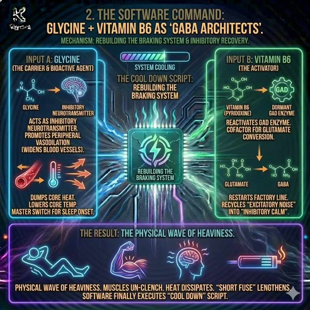 The Mechanism: Glycine lowers core body temperature to open the Glymphatic “Garbage Chutes.” B1 and B12 repair the Electron Transport Chain, ensuring that when you wake up, the battery is charged and the cache is clear. This is the Neuro-Energy Reset.
