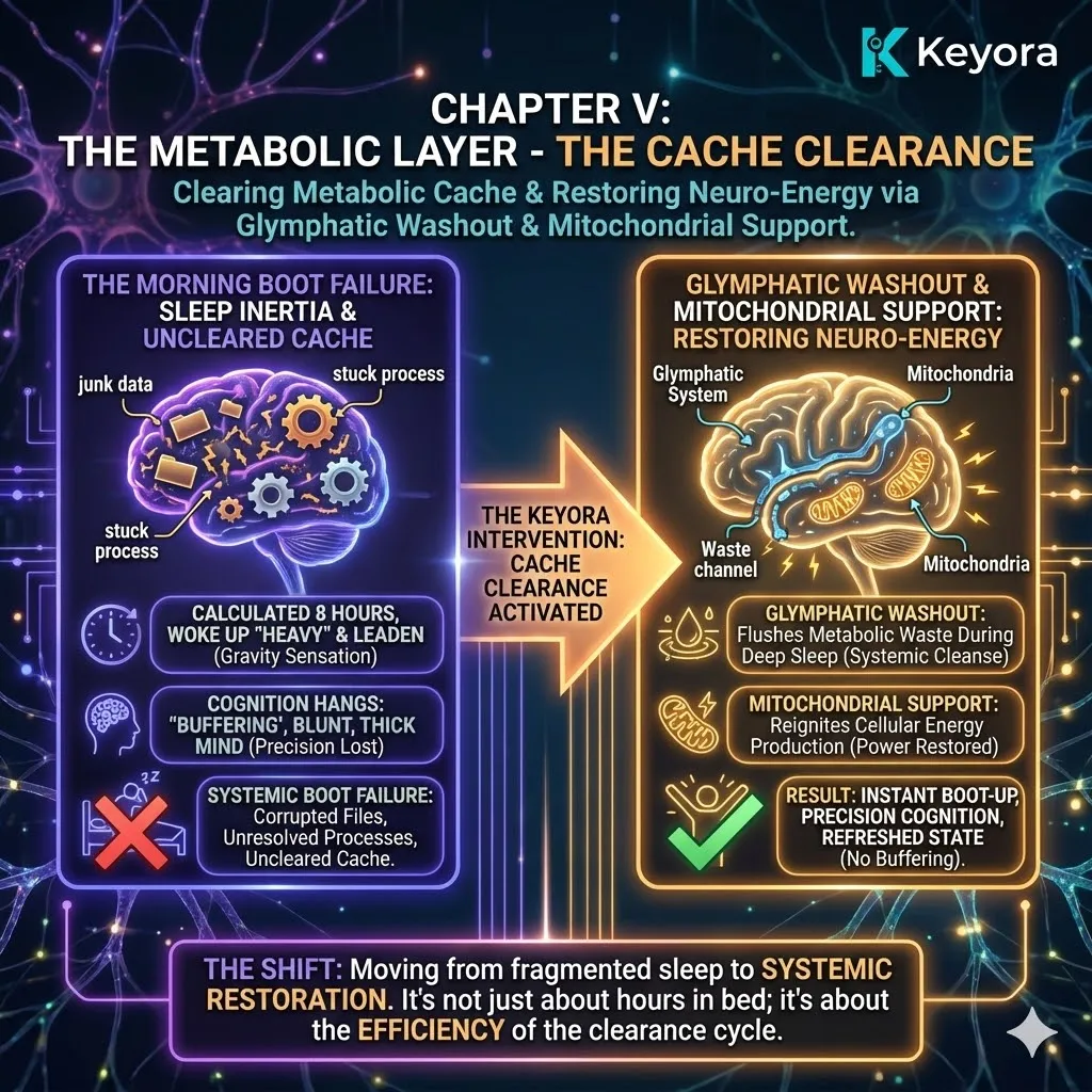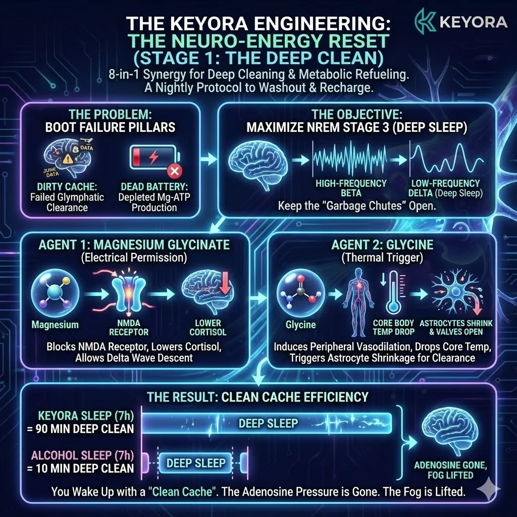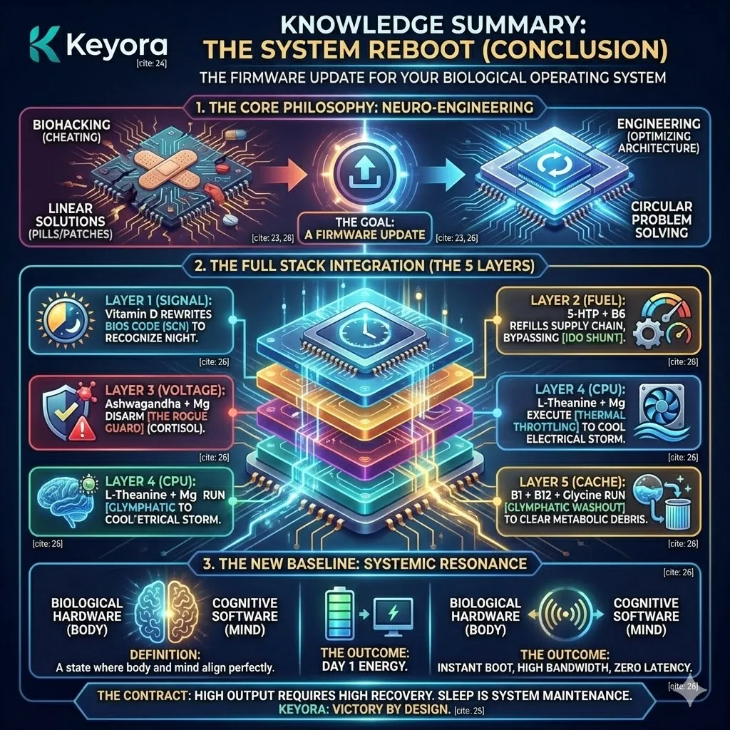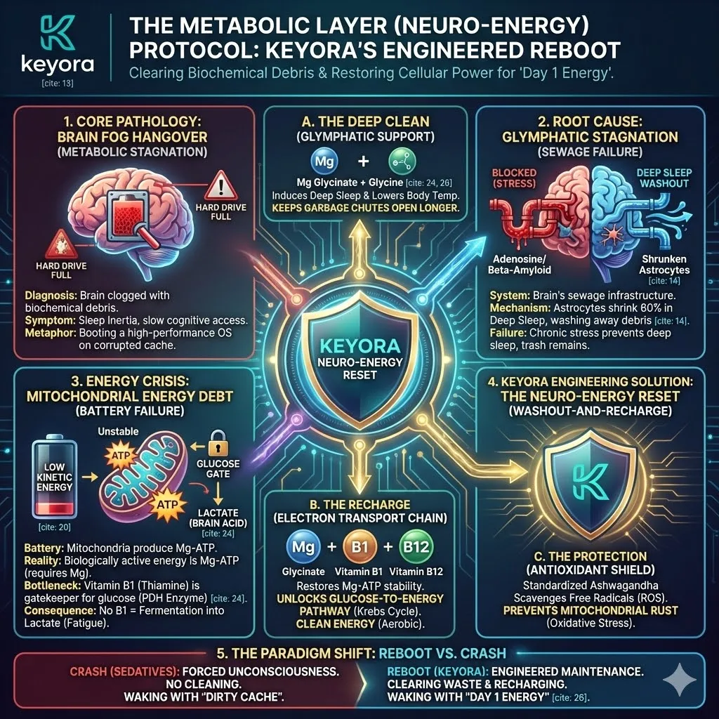 – **Layer 5 (Cache):** B1 + B12 + Glycine run the **[Glymphatic Washout]** to clear metabolic debris.