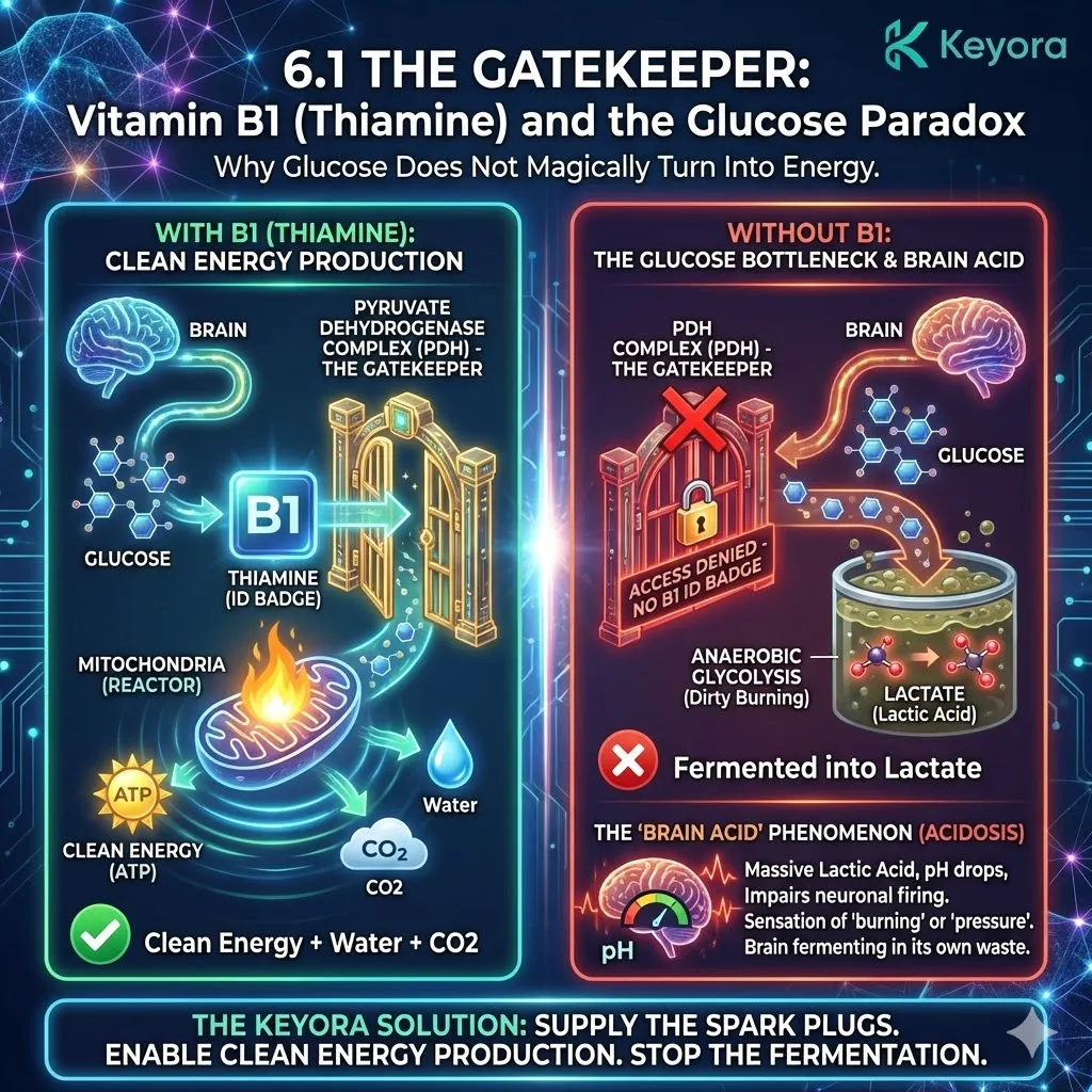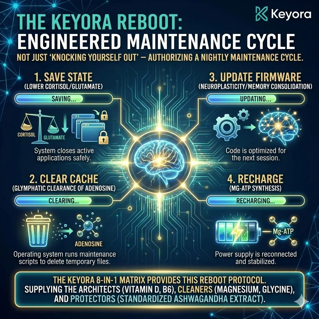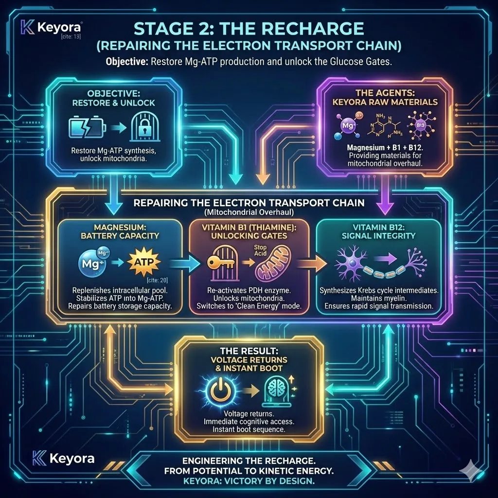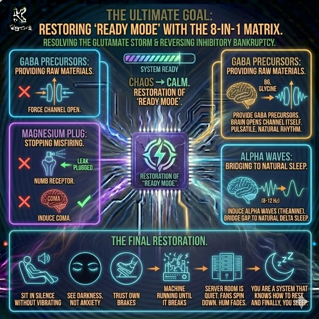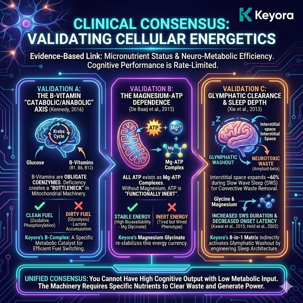 – **Layer 5 (Cache):** B1 + B12 + Glycine run the **[Glymphatic Washout]** to clear metabolic debris.