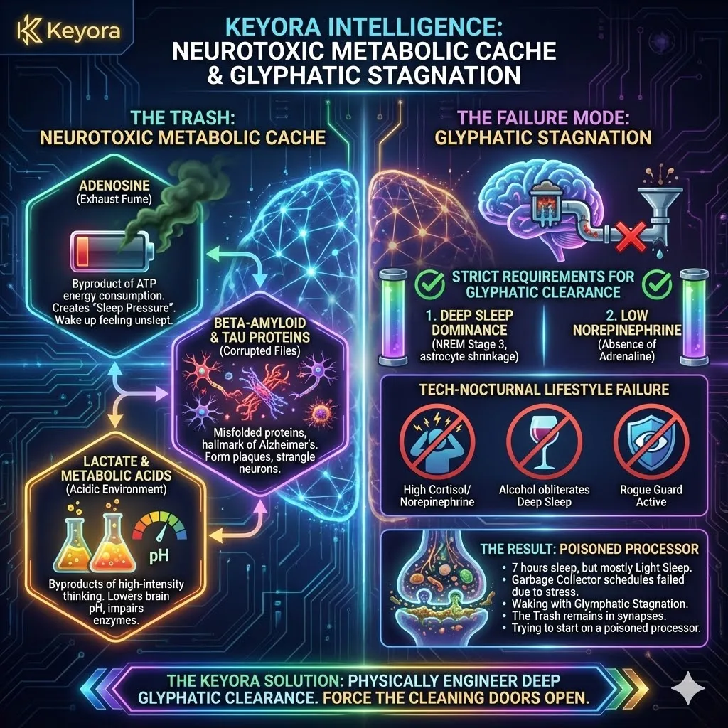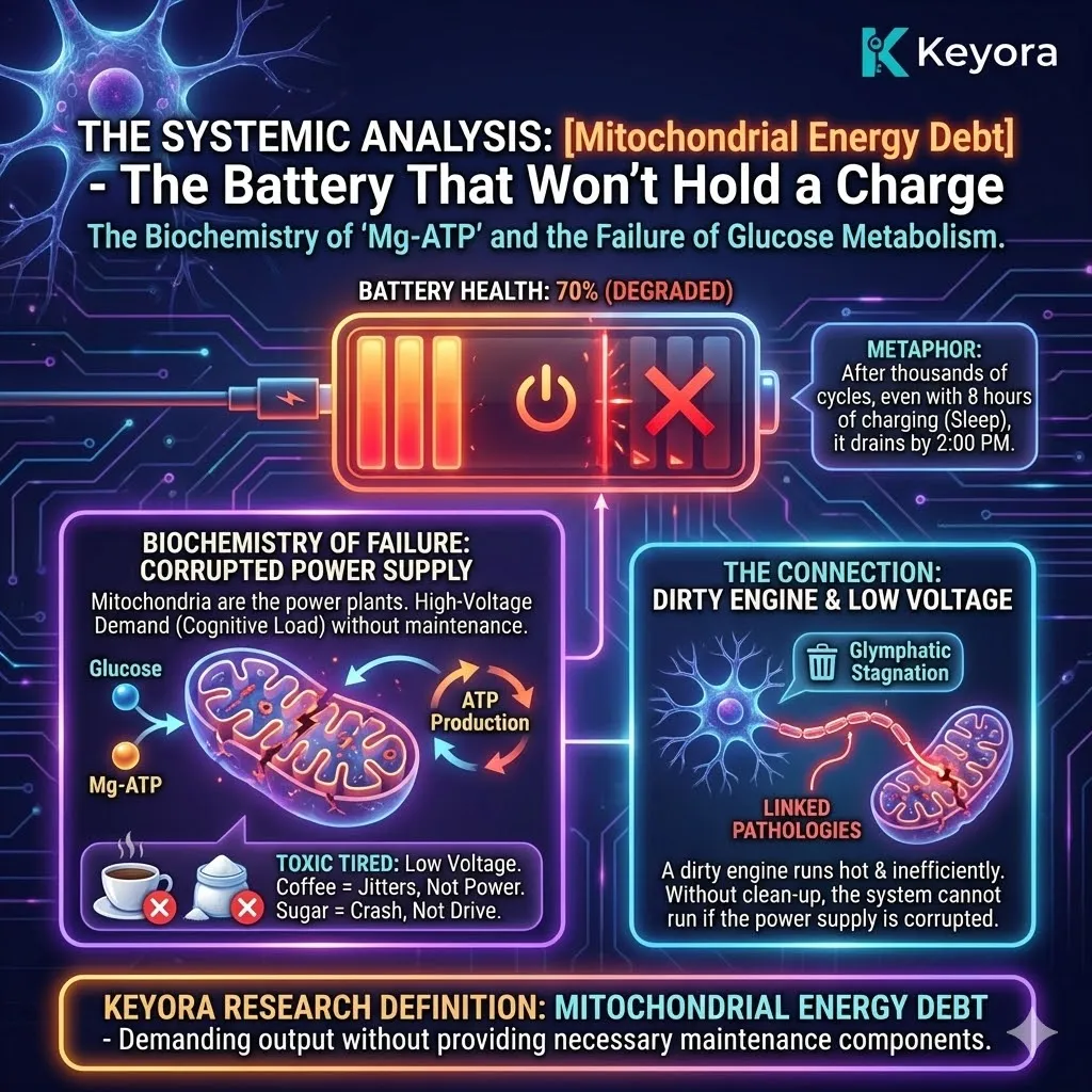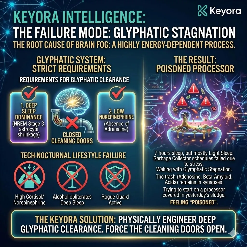 The Problem: Glymphatic Stagnation and Mitochondrial Energy Debt. The brain is dirty (Adenosine) and the battery is dead (No Mg-ATP).