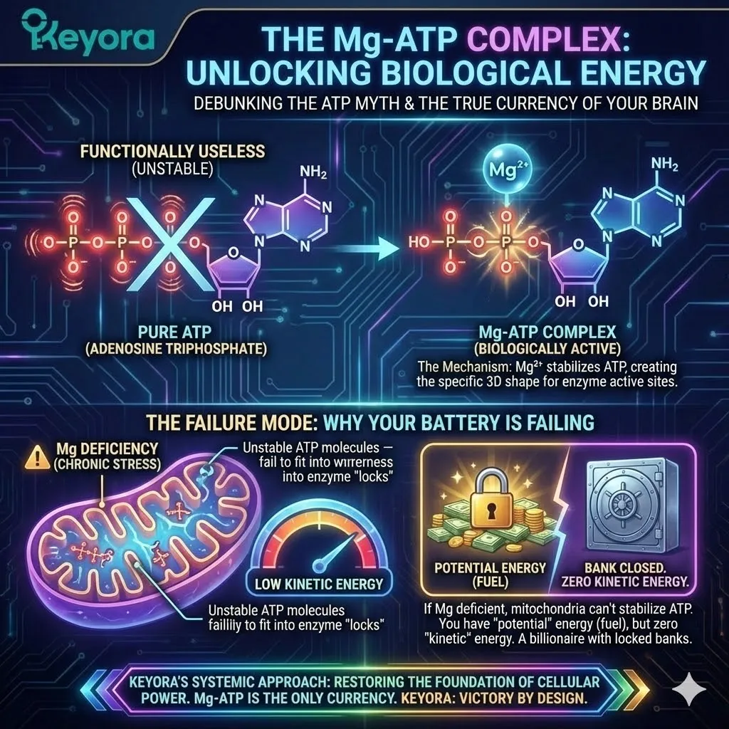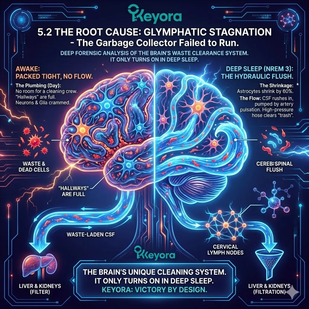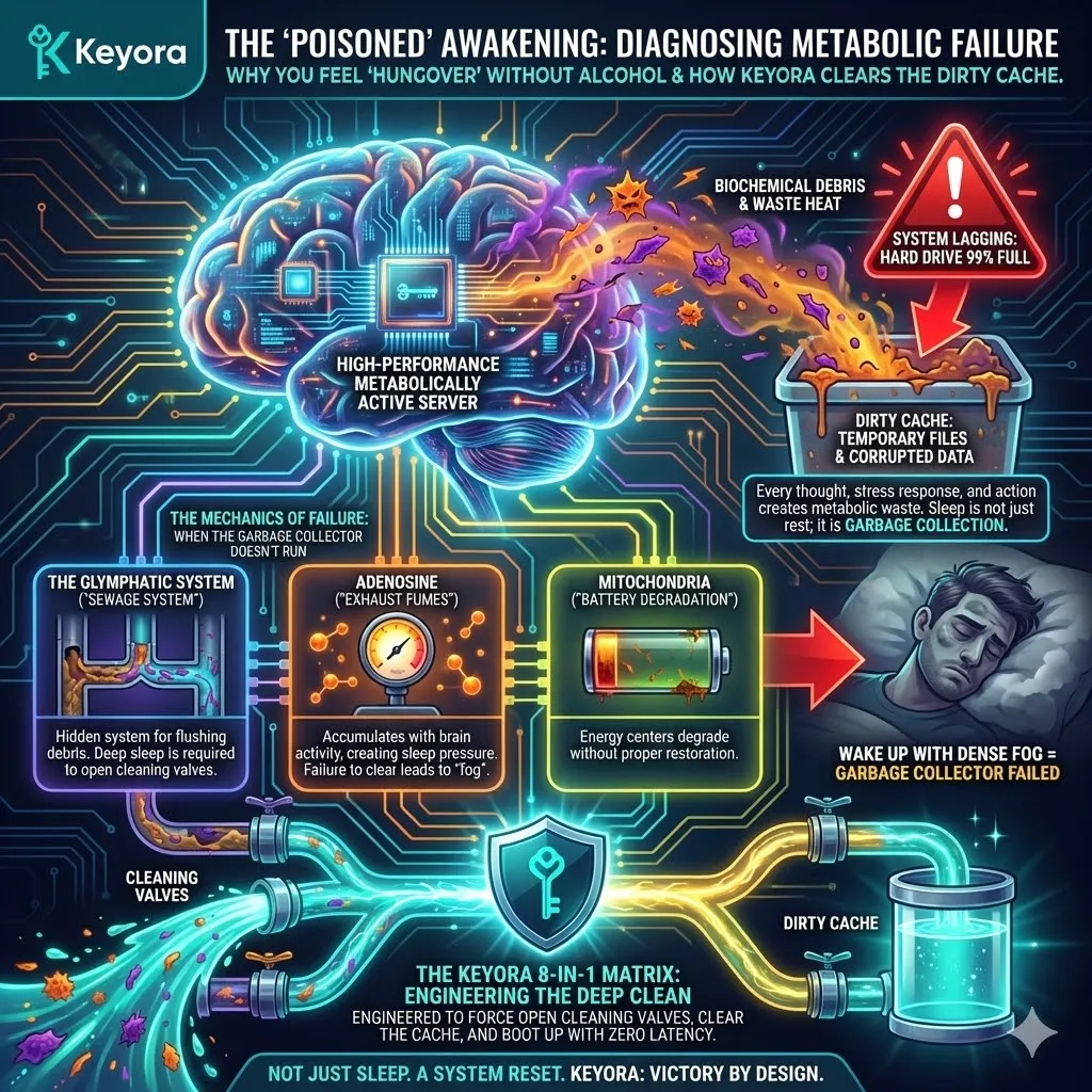 The Problem: Glymphatic Stagnation and Mitochondrial Energy Debt. The brain is dirty (Adenosine) and the battery is dead (No Mg-ATP).