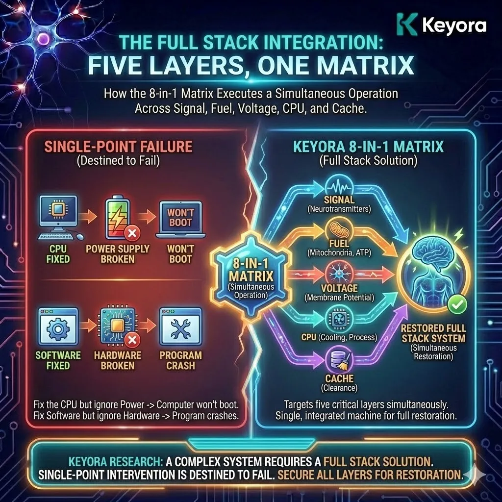 Keyora 8-in-1 is the realization that biology is interdependent. The Matrix exists to serve the Magnesium function, and Magnesium exists to empower the Matrix.